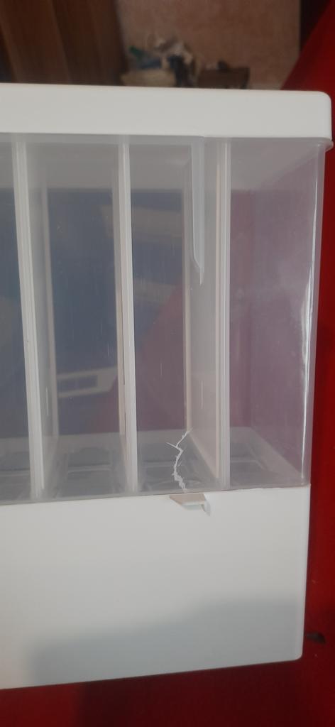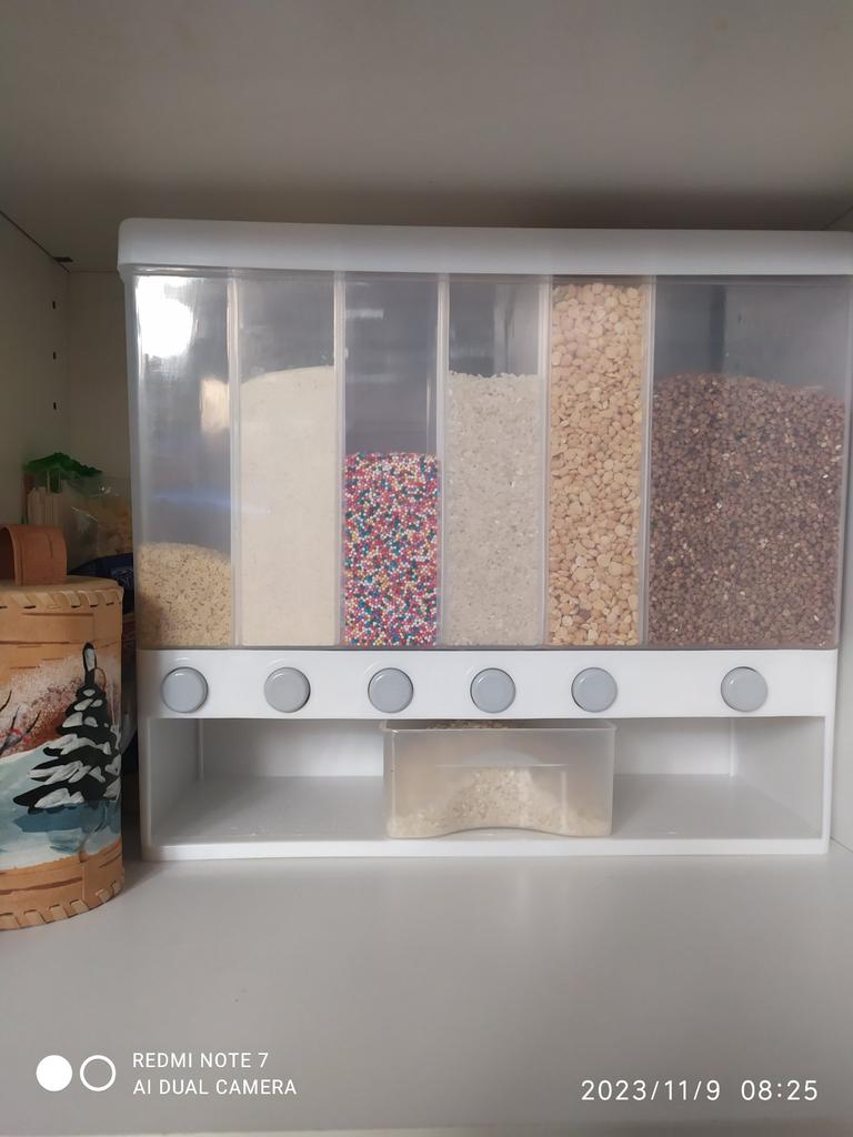 Delivered quickly, everything was assembled easily, the container itself is light, without foreign odors, the springs on the buttons are strong (you just need to assemble it correctly, i.e. I didn’t secure the side with the buttons completely and the buttons sank, then I pressed the wall all the way and everything clicked into place) their places). I didn’t like that the bottom bowl doesn’t move clearly left and right, but turns as you like and the holder is not a hole, I have a smooth “snap”, which makes holding it not very convenient. The lower part where the bowl does not detach. And in general, this saves a lot of space in cabinets and you can immediately see which product is running low.