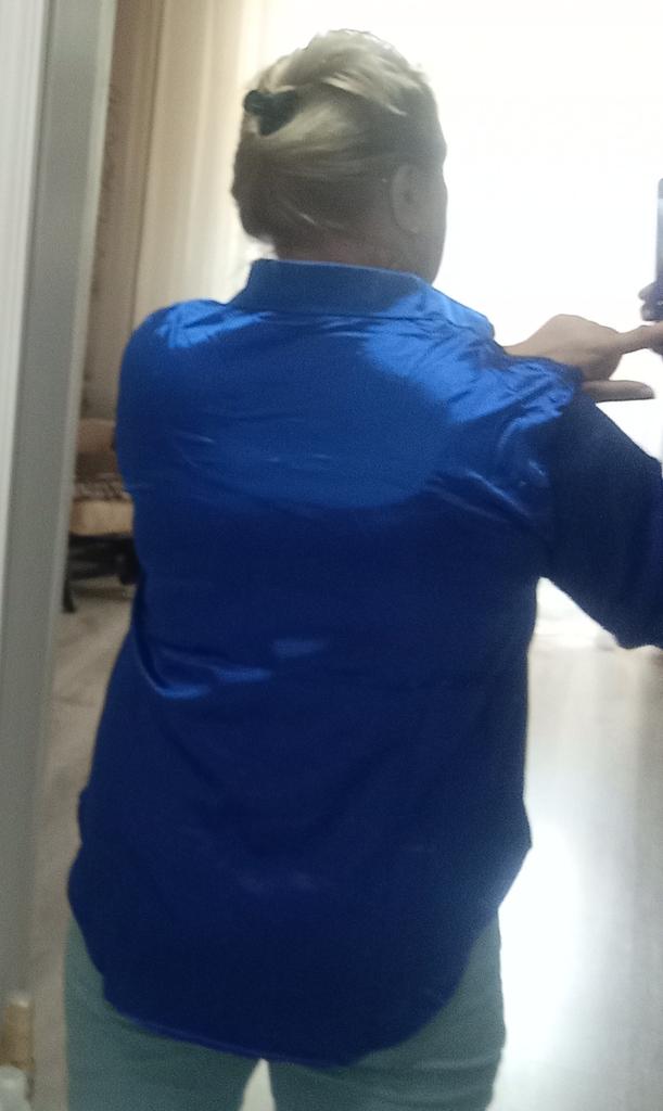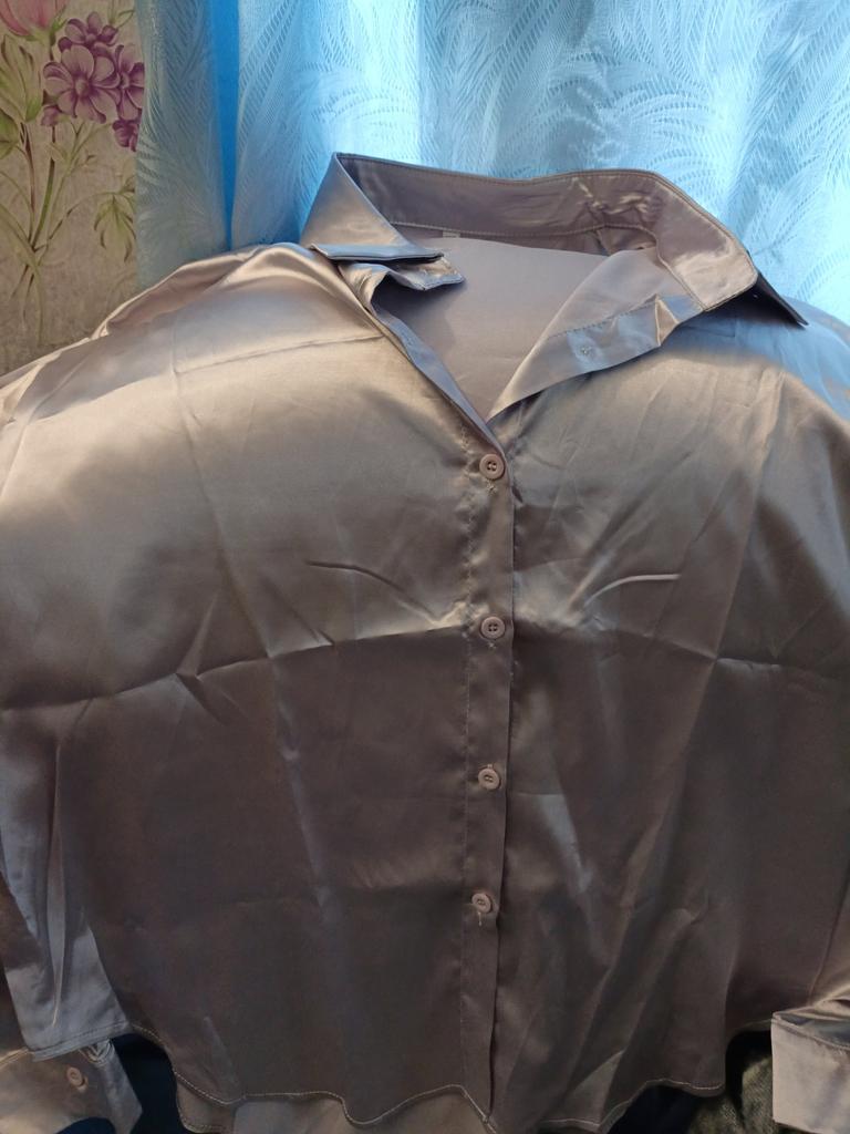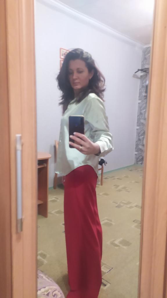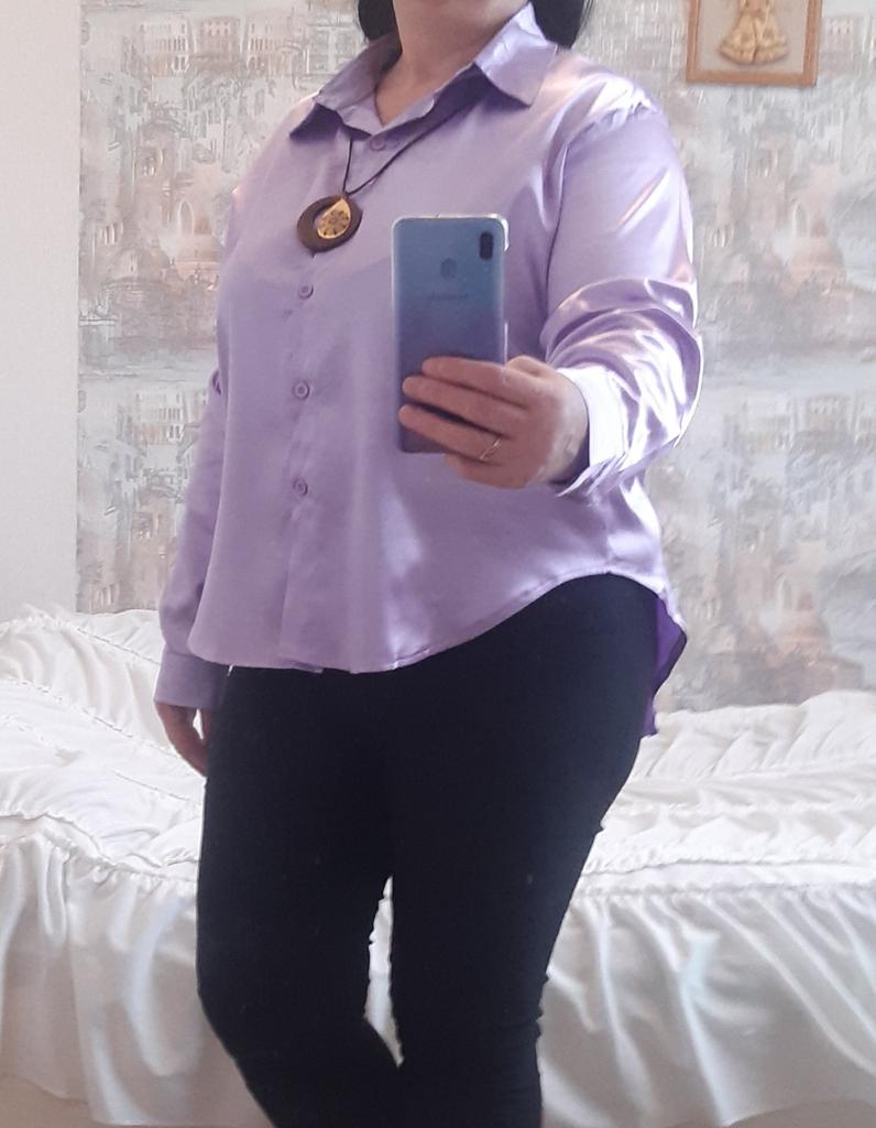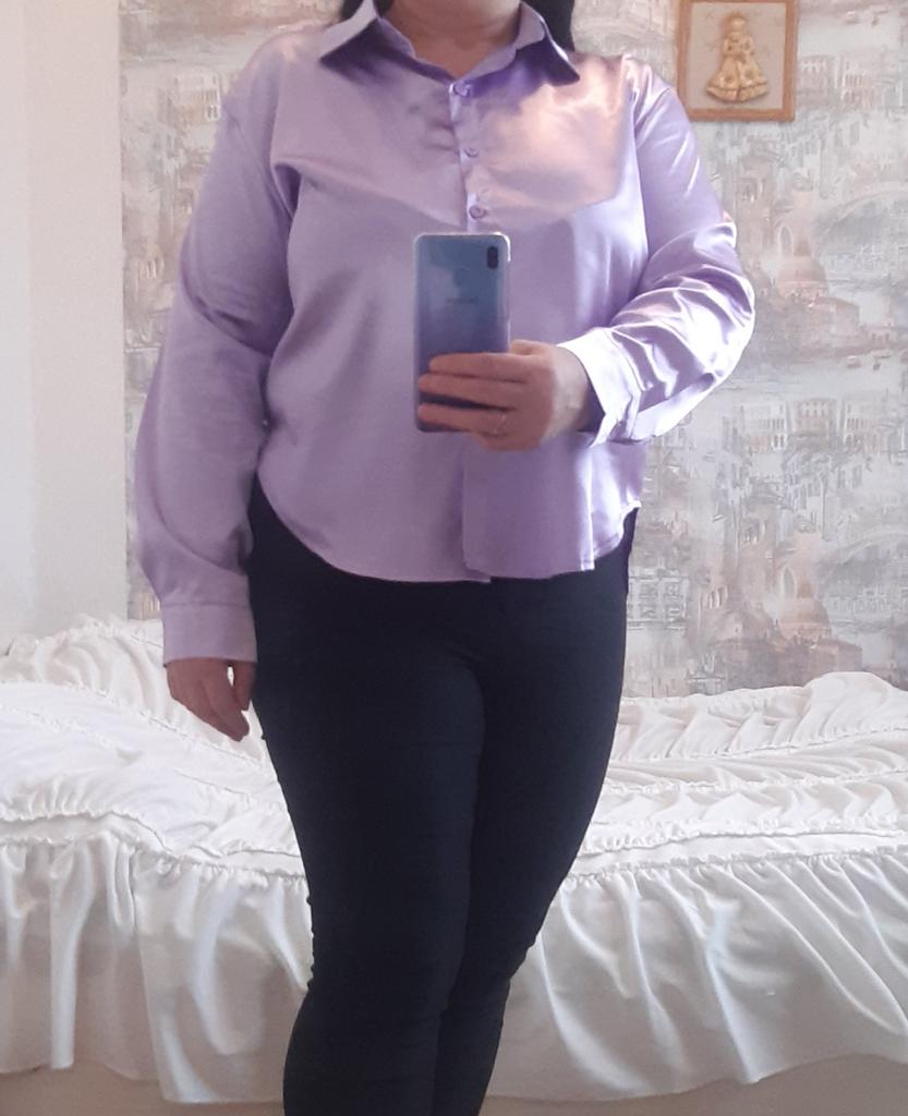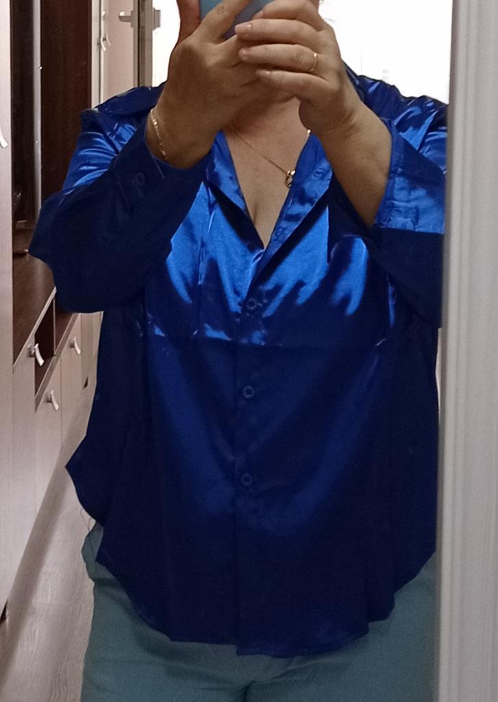 Blouse of high quality tailoring, the color is a little darker than in the photo. Satin, shorter at the front than at the back. Very beautiful, I recommend it.