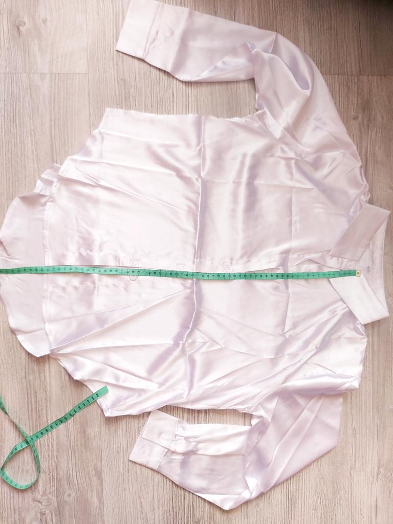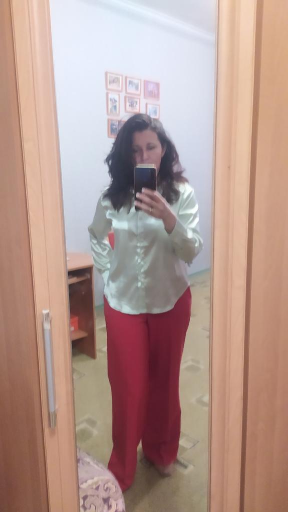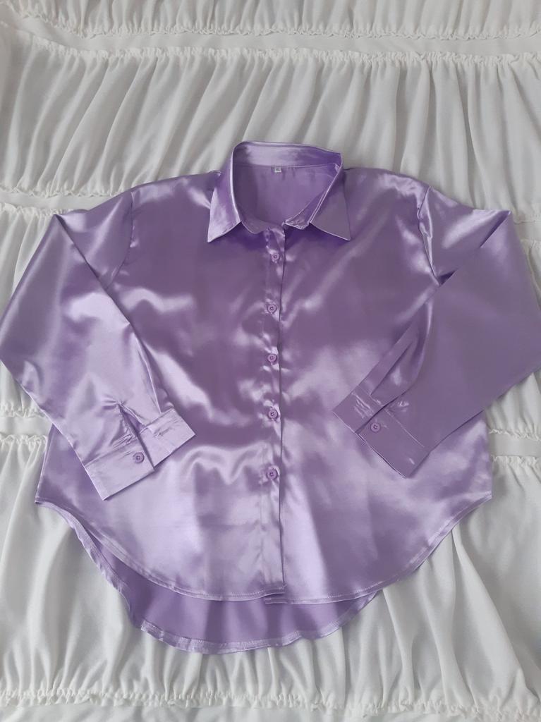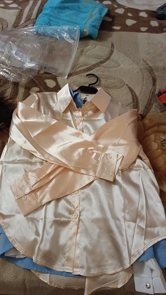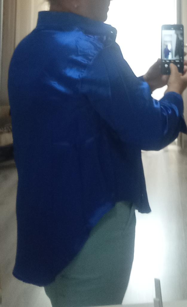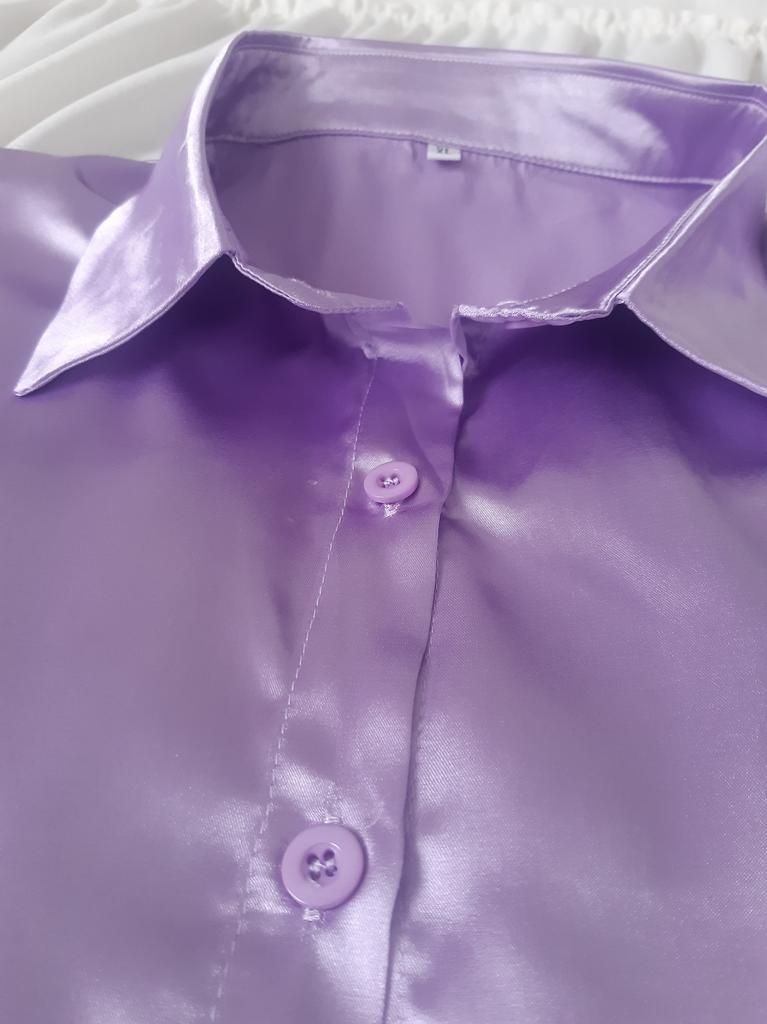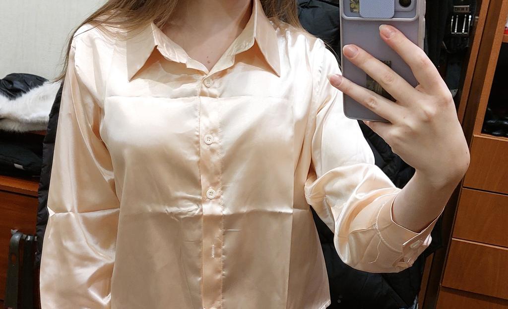 Blouse of high quality tailoring, the color is a little darker than in the photo. Satin, shorter at the front than at the back. Very beautiful, I recommend it.