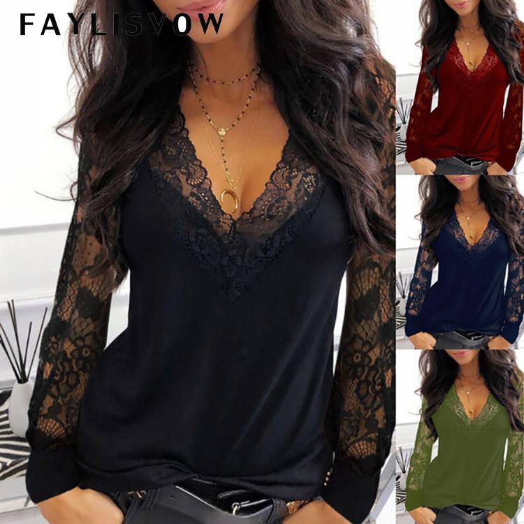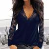 Casual V-neck Lace Long Sleeve T-shirt for Women Spring Winter Clothes Sexy Solid Color Black Tee Shirt Office Lady Top