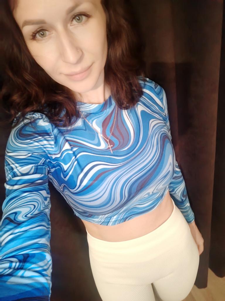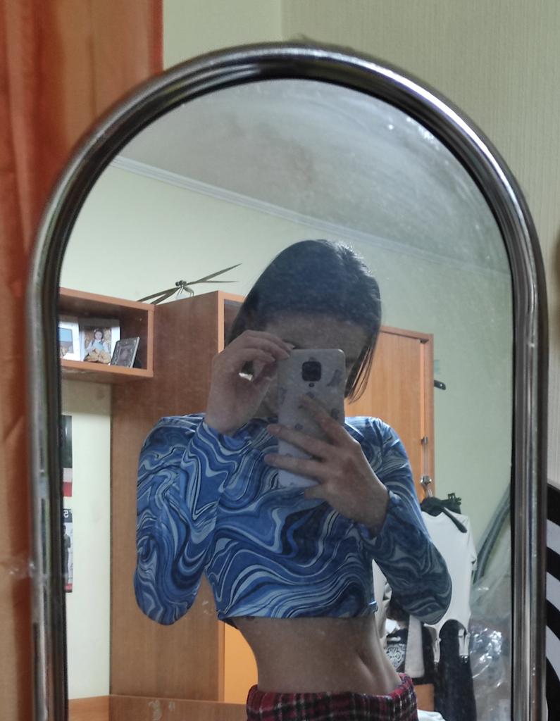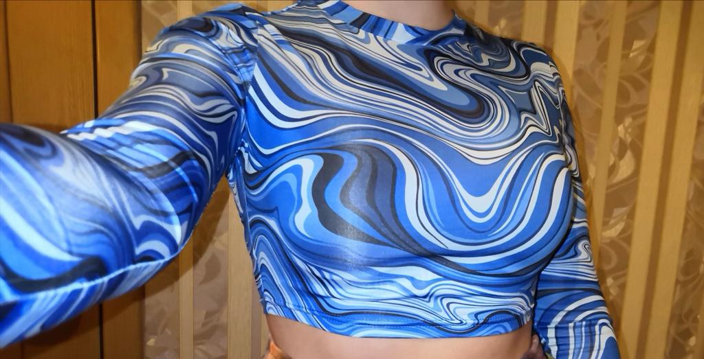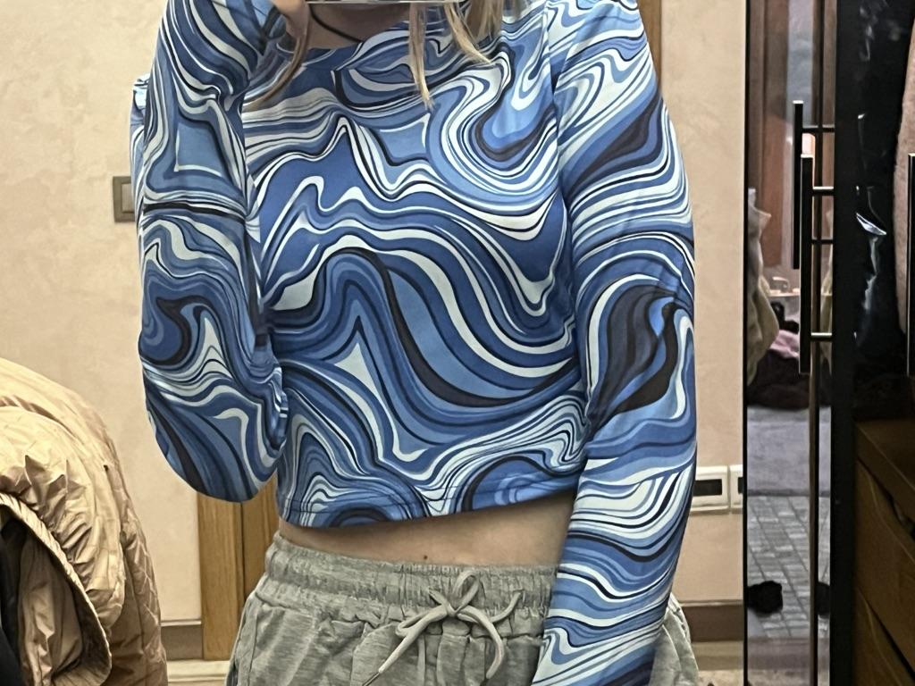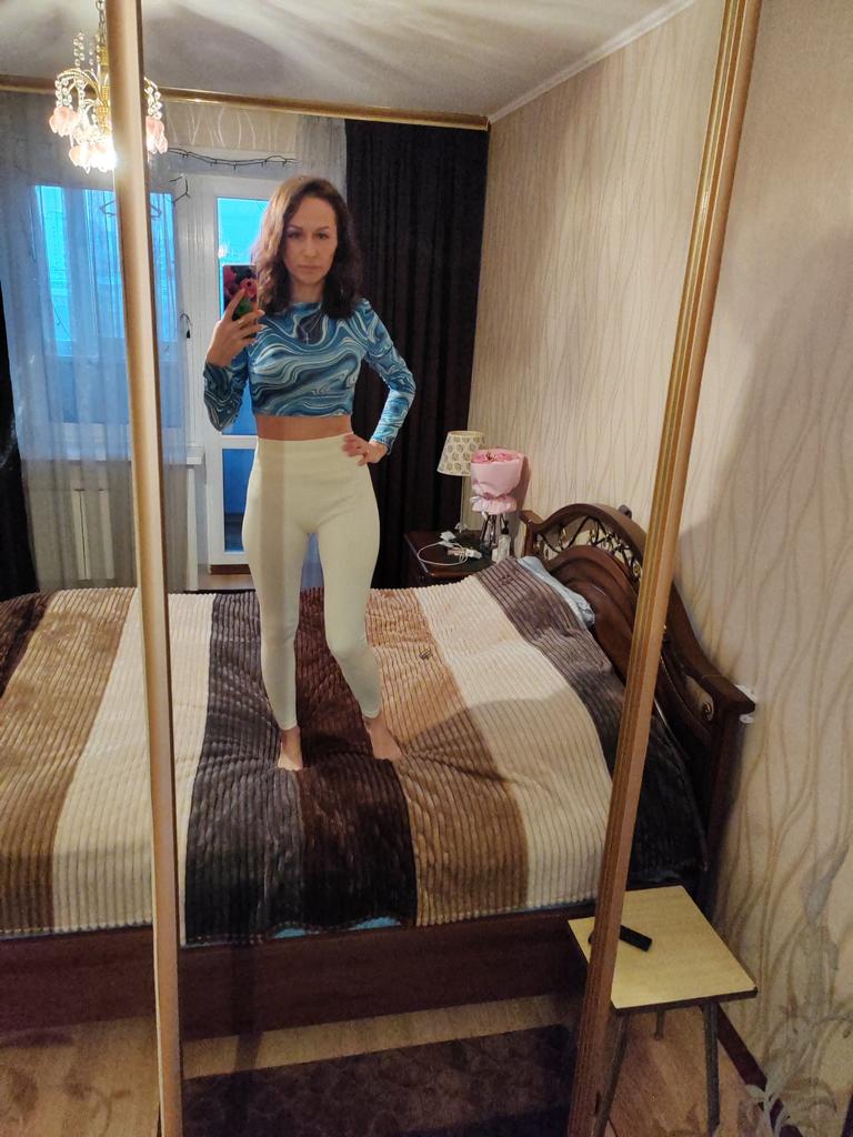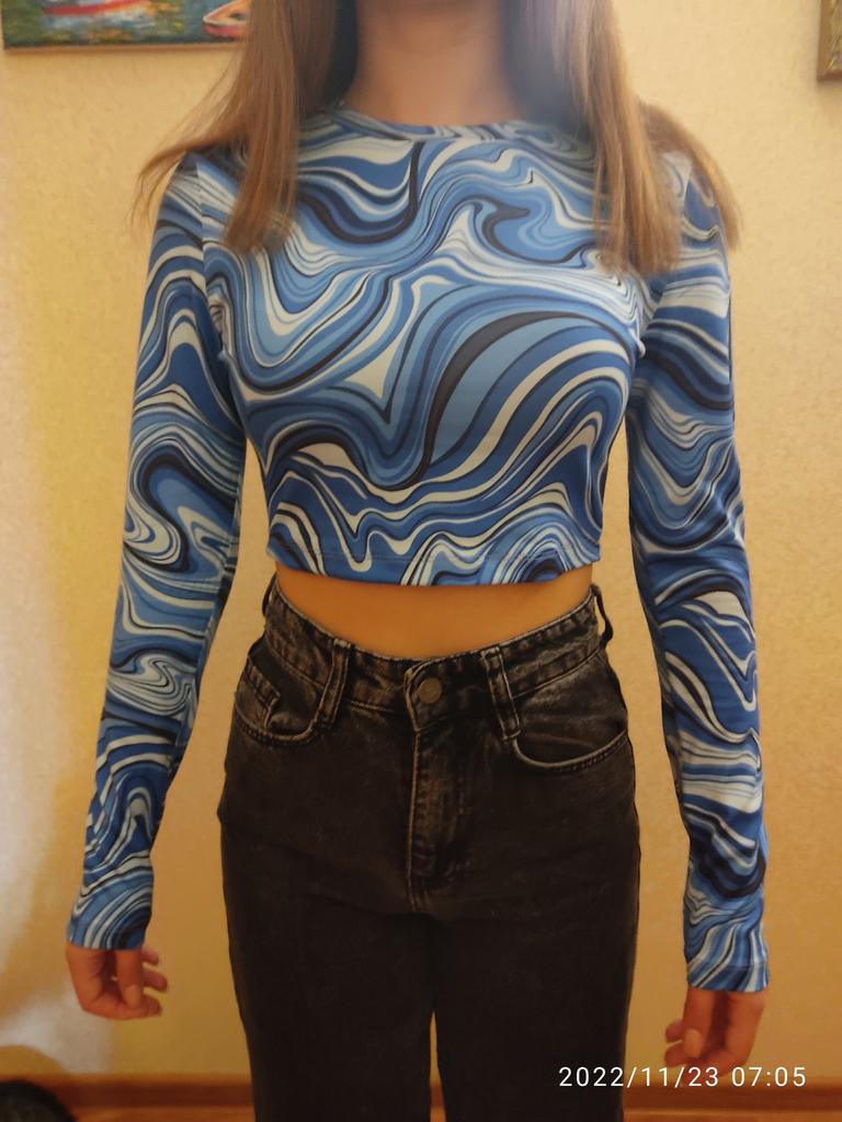Stylish crop top 🔥 Material is like of a swimsuit, very pleasant to the body. On the parameters 84-60-85, height 167, size xs sat beautiful. Details: -the sleeves are long enough; -the model emphasize the figure; -the neck has circle form; -the top is above the navel; Can be combined with shorts, jeans,skirts . Good quality !