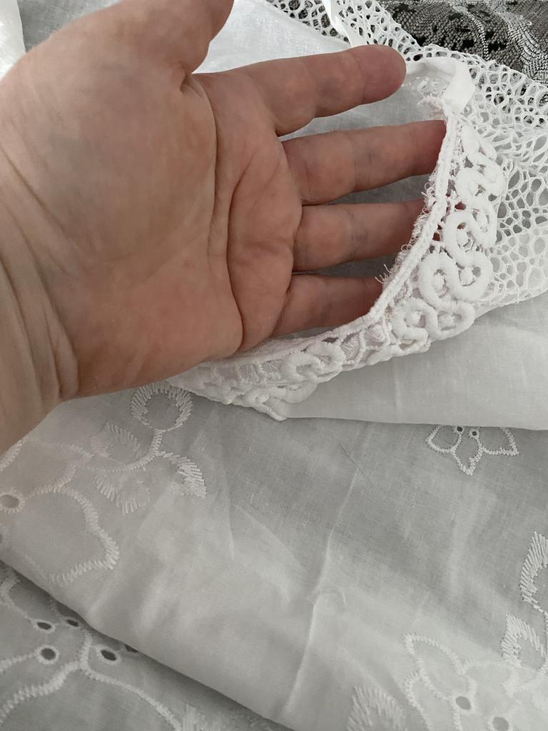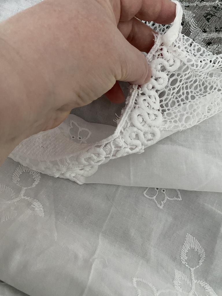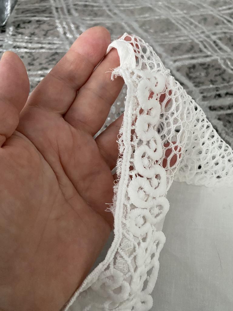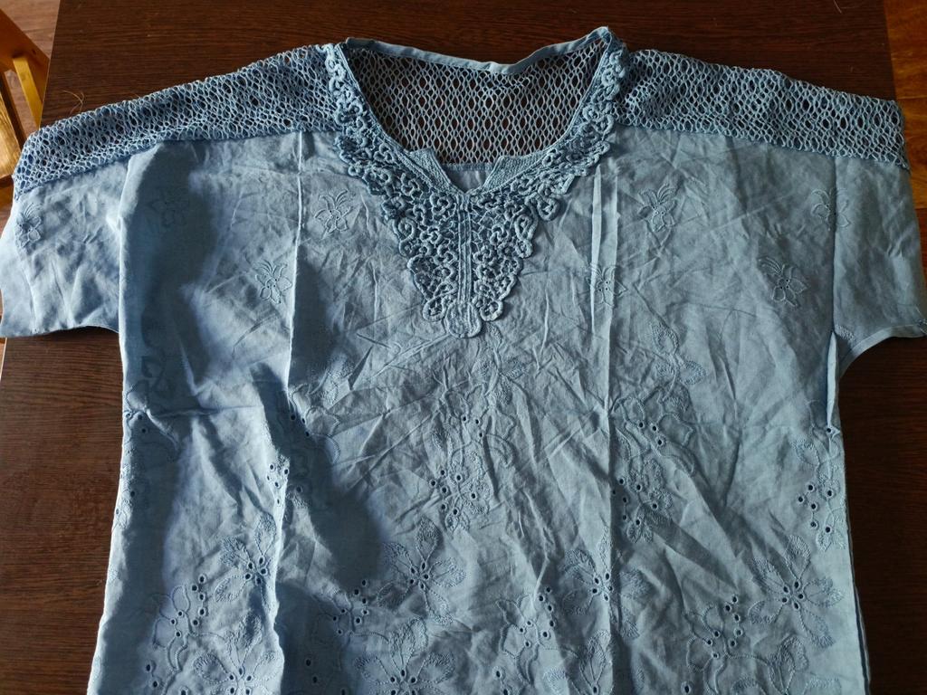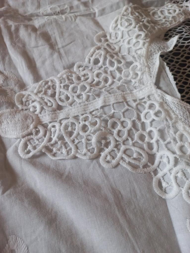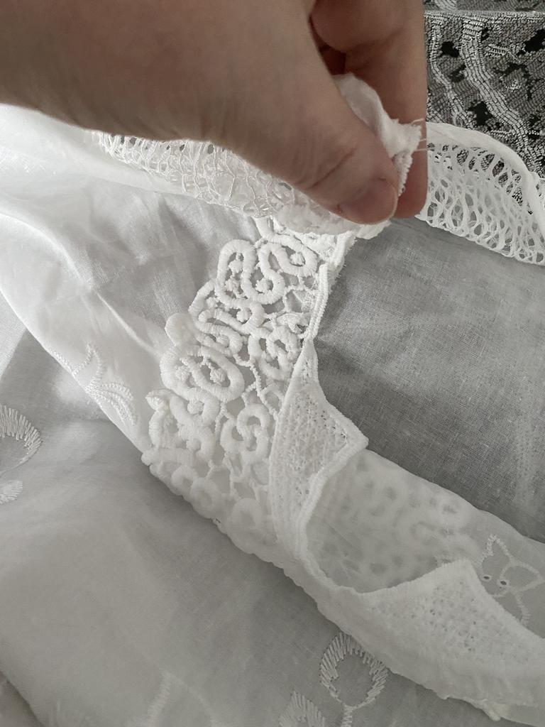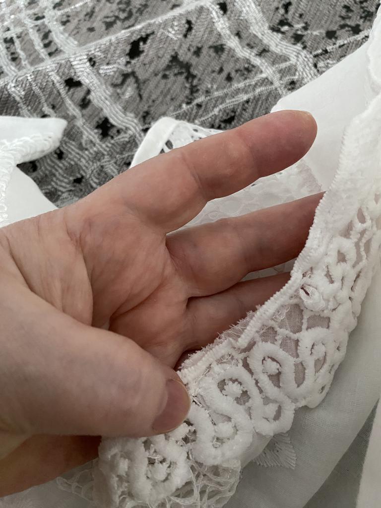 The blouse is carelessly sewn. Threads stick out, the richelieu is sewn on asymmetrically.