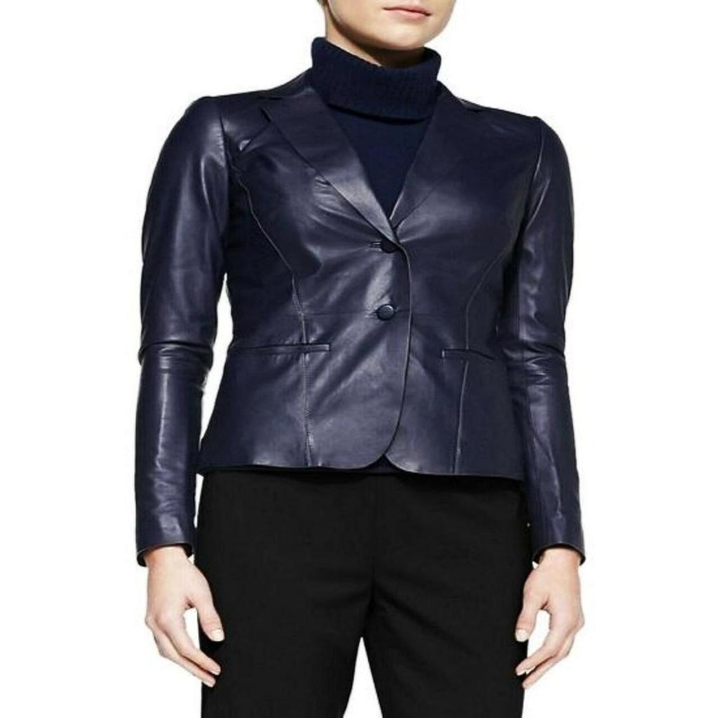 Noora Women's Navy Blue Lambskin Leather Blazer, Casual Formal Blazer, Slim Fit Office Wear Blazer.