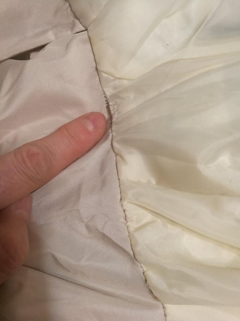 The quality of the fabric is like the lowest quality jacket material. In the photo, the fabric is thick, like on down jackets. I do not recommend