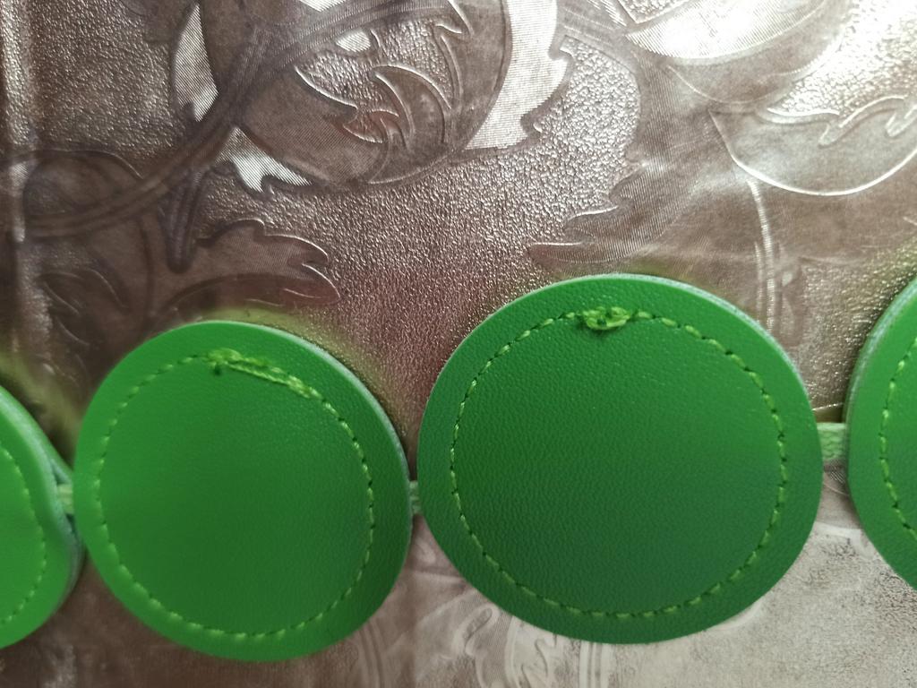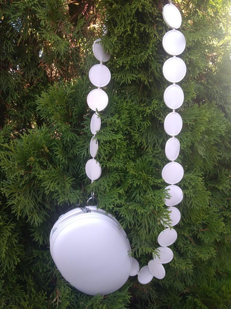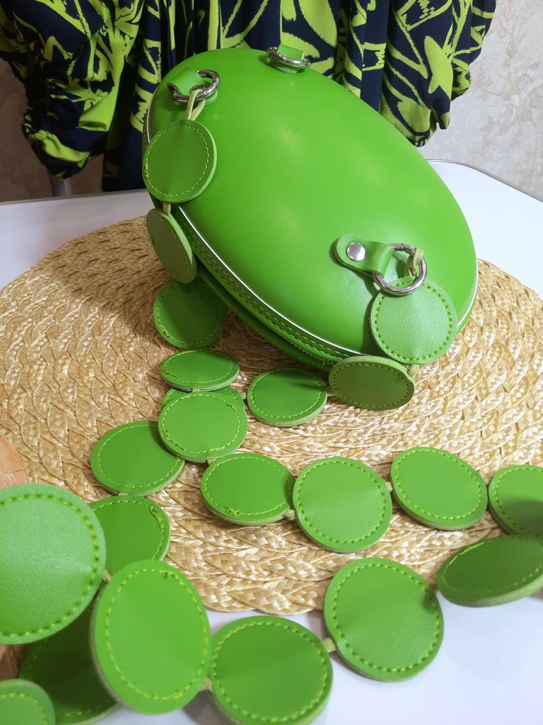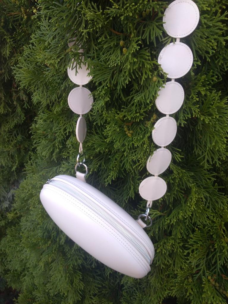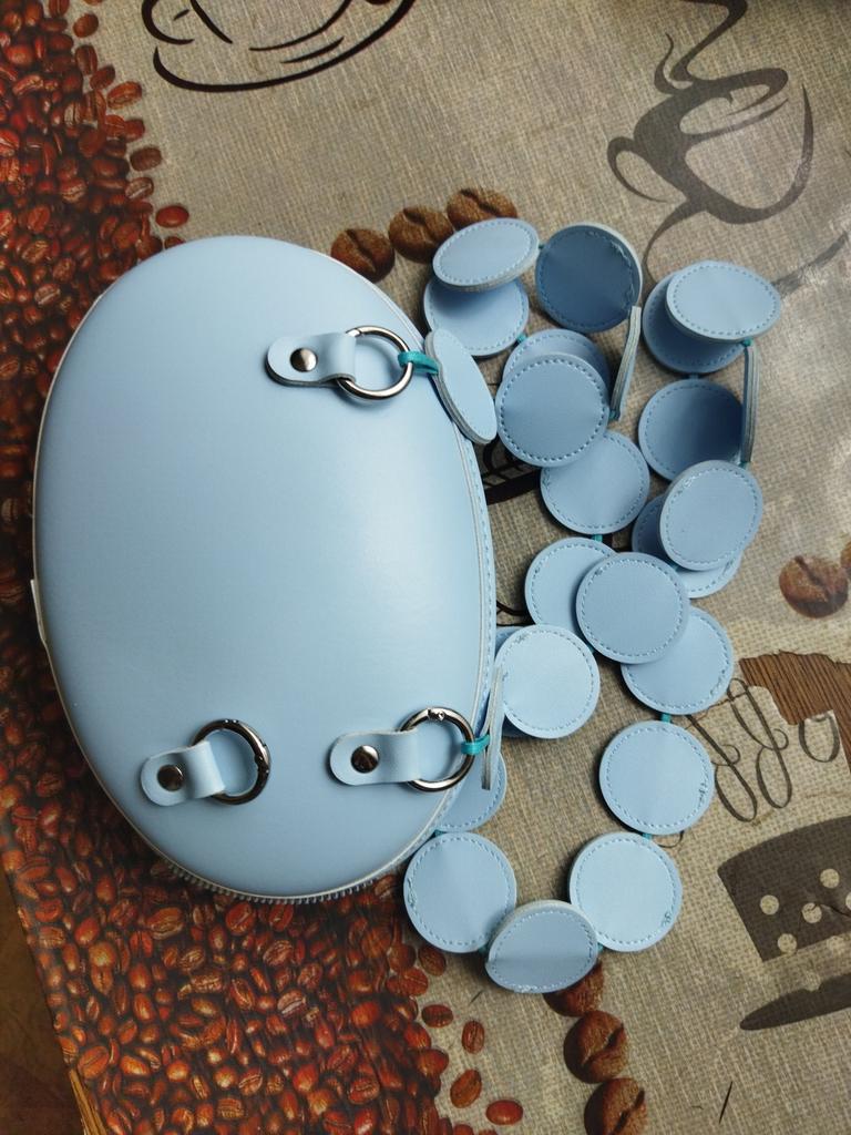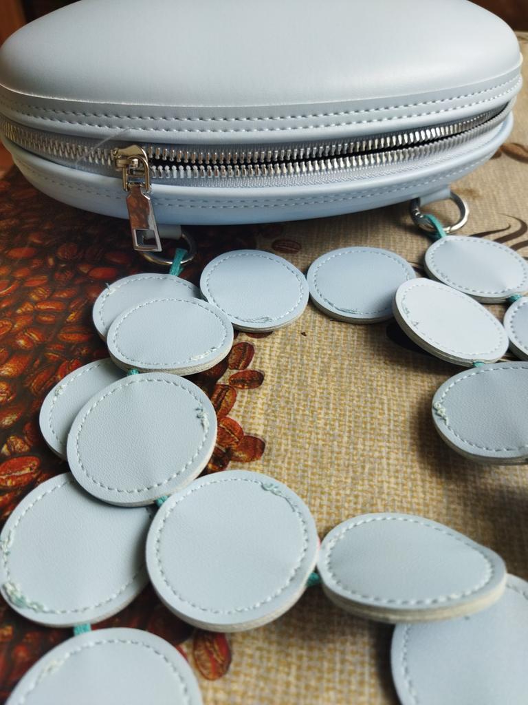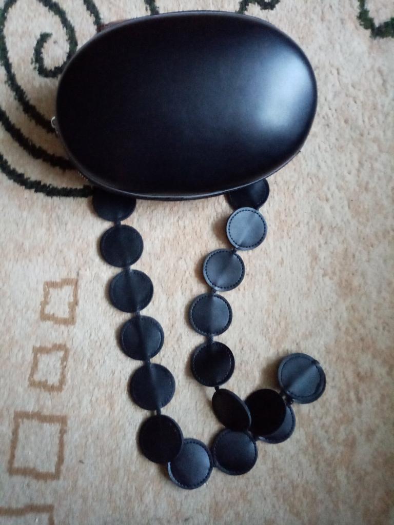 Handbag of an unusual shape. Sewn neatly. There is one belt, long, made of leather circles. Inside without lining, one compartment. A phone and a small wallet will fit.