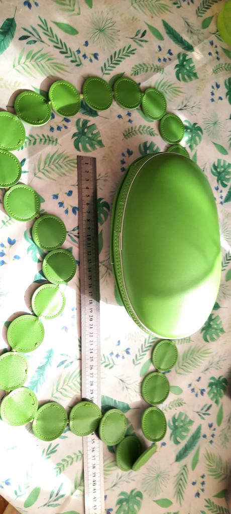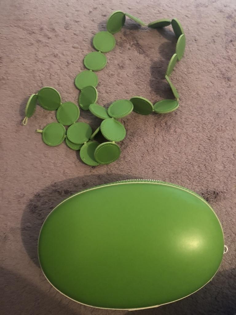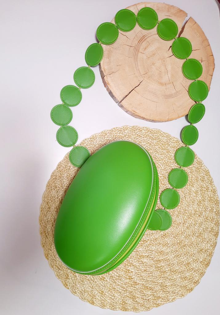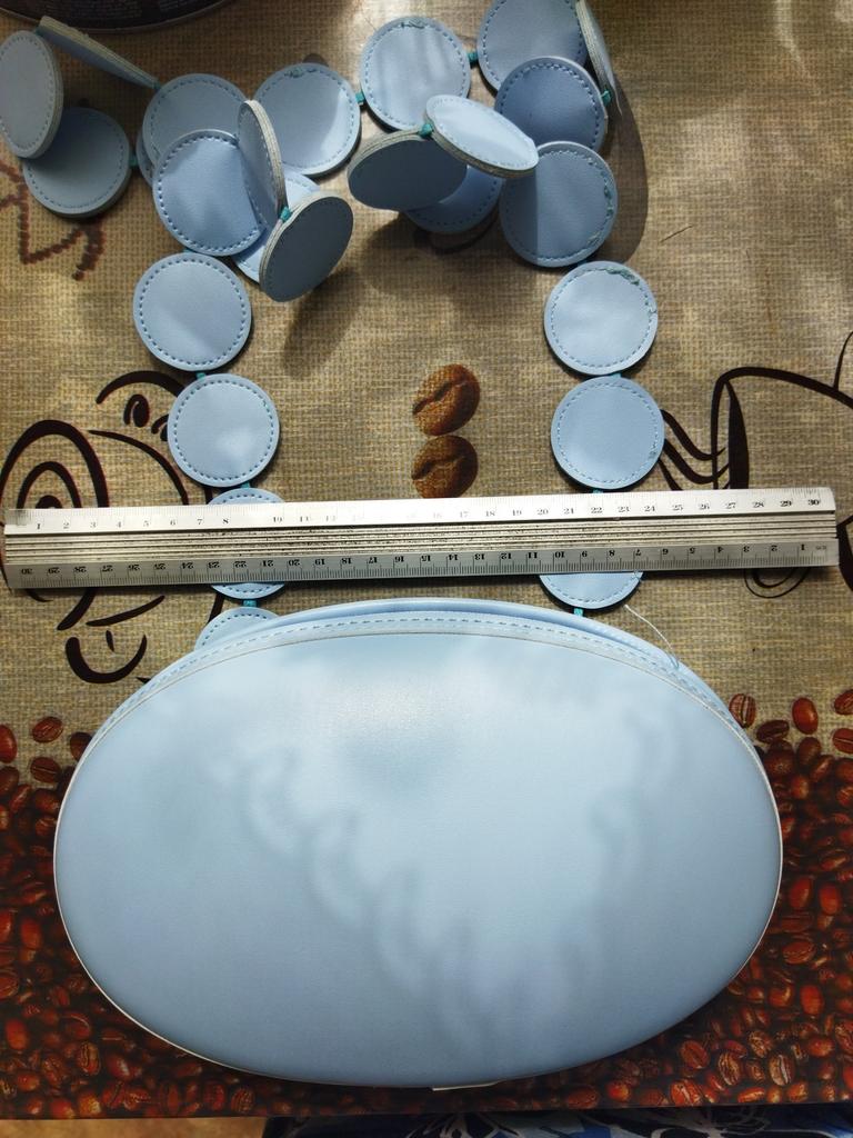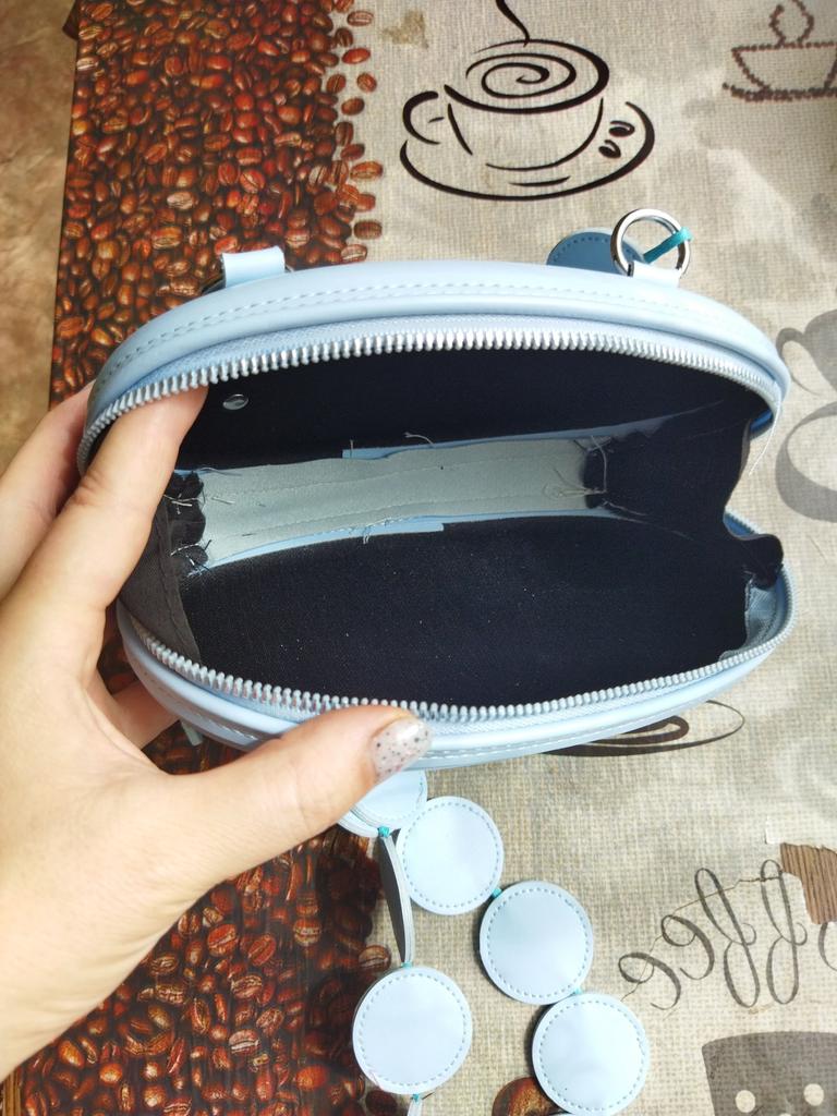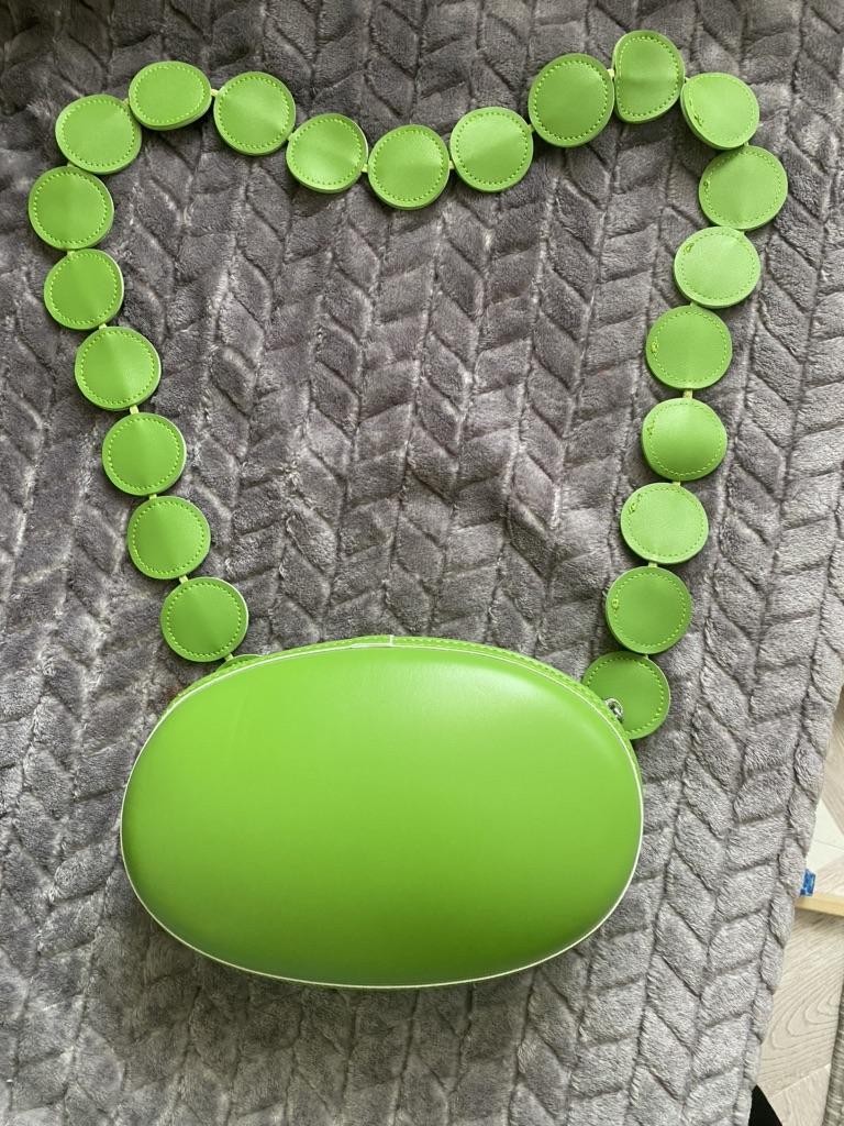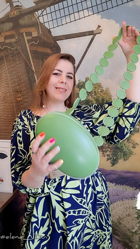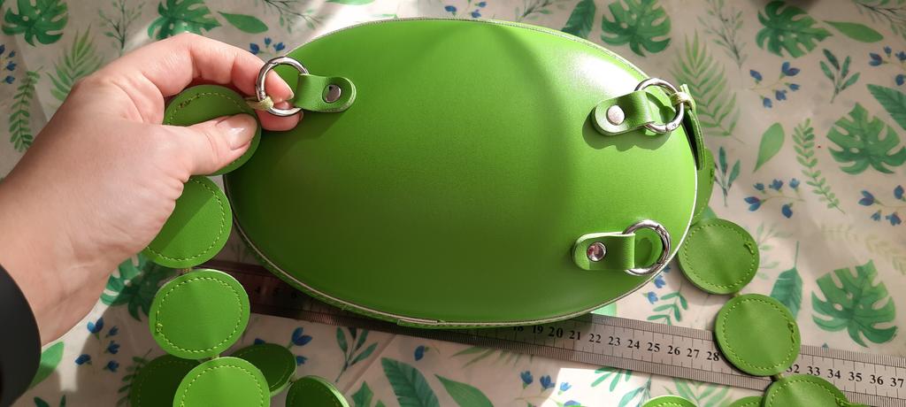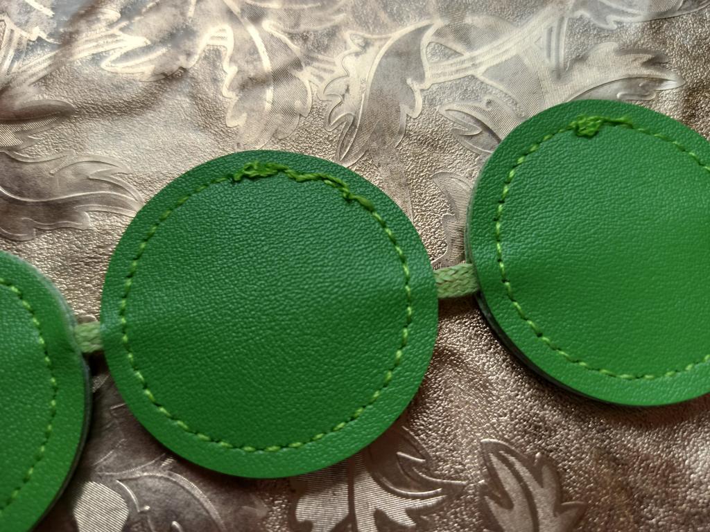 Handbag of an unusual shape. Sewn neatly. There is one belt, long, made of leather circles. Inside without lining, one compartment. A phone and a small wallet will fit.