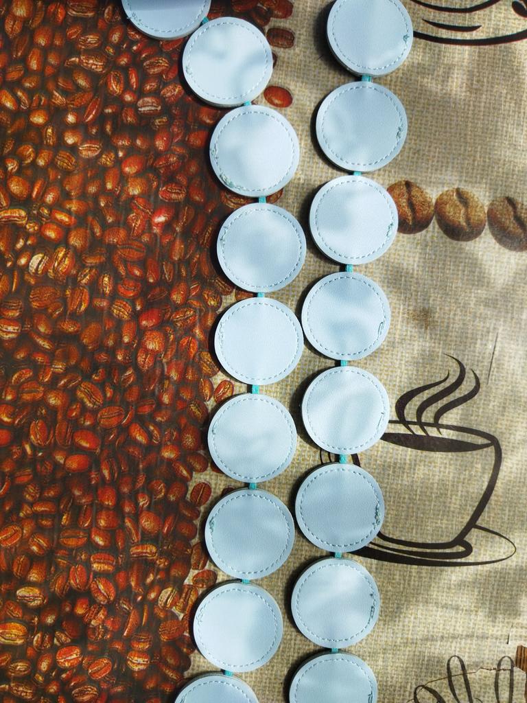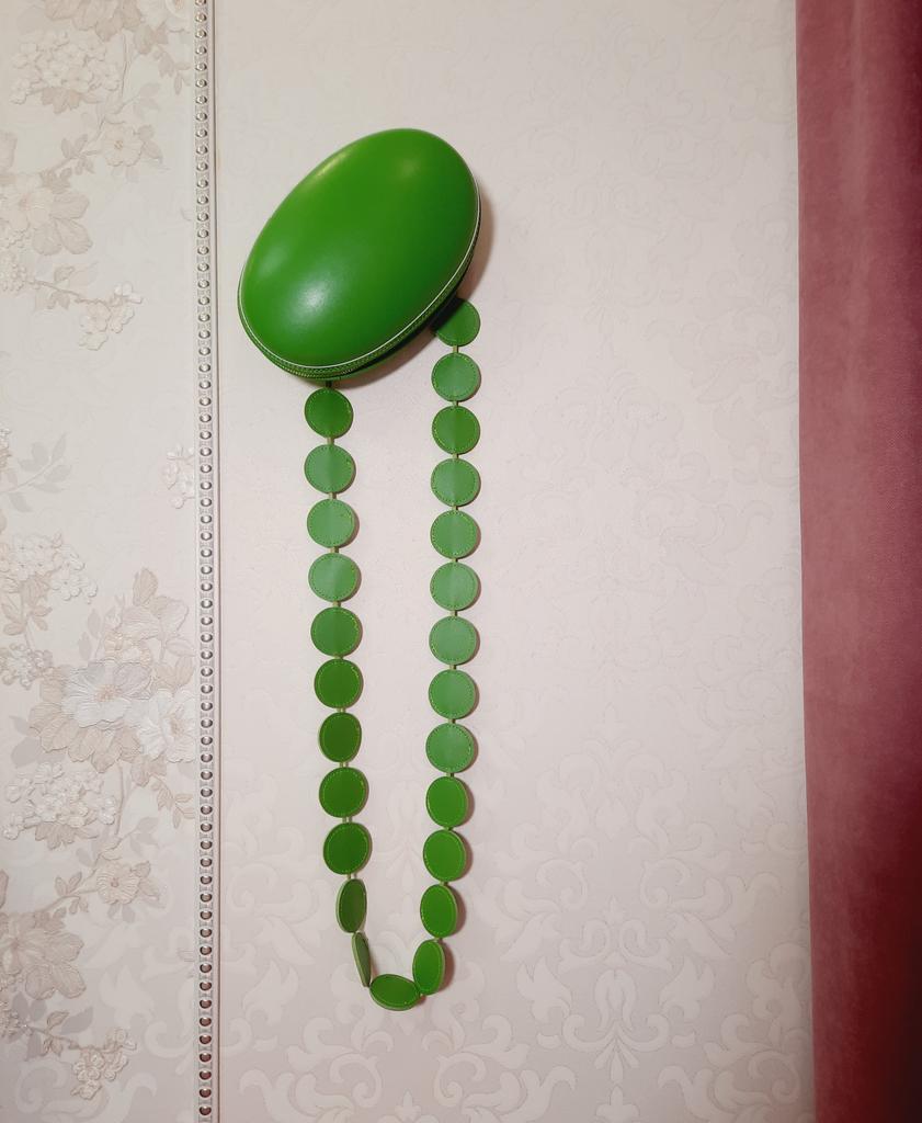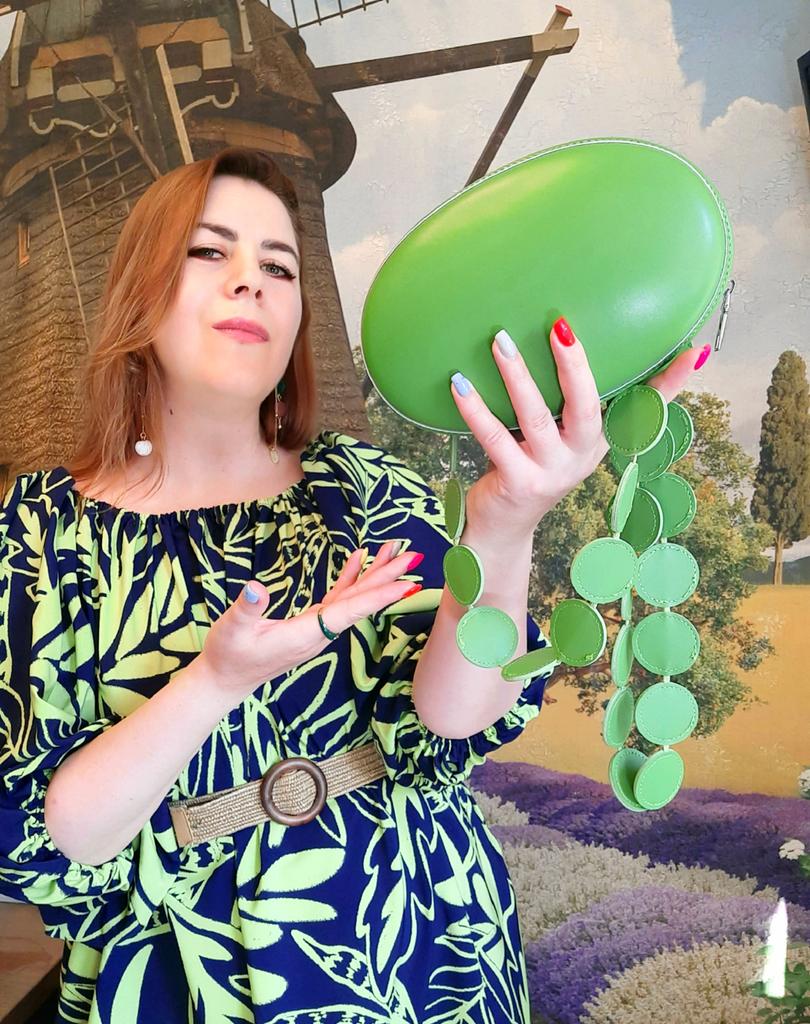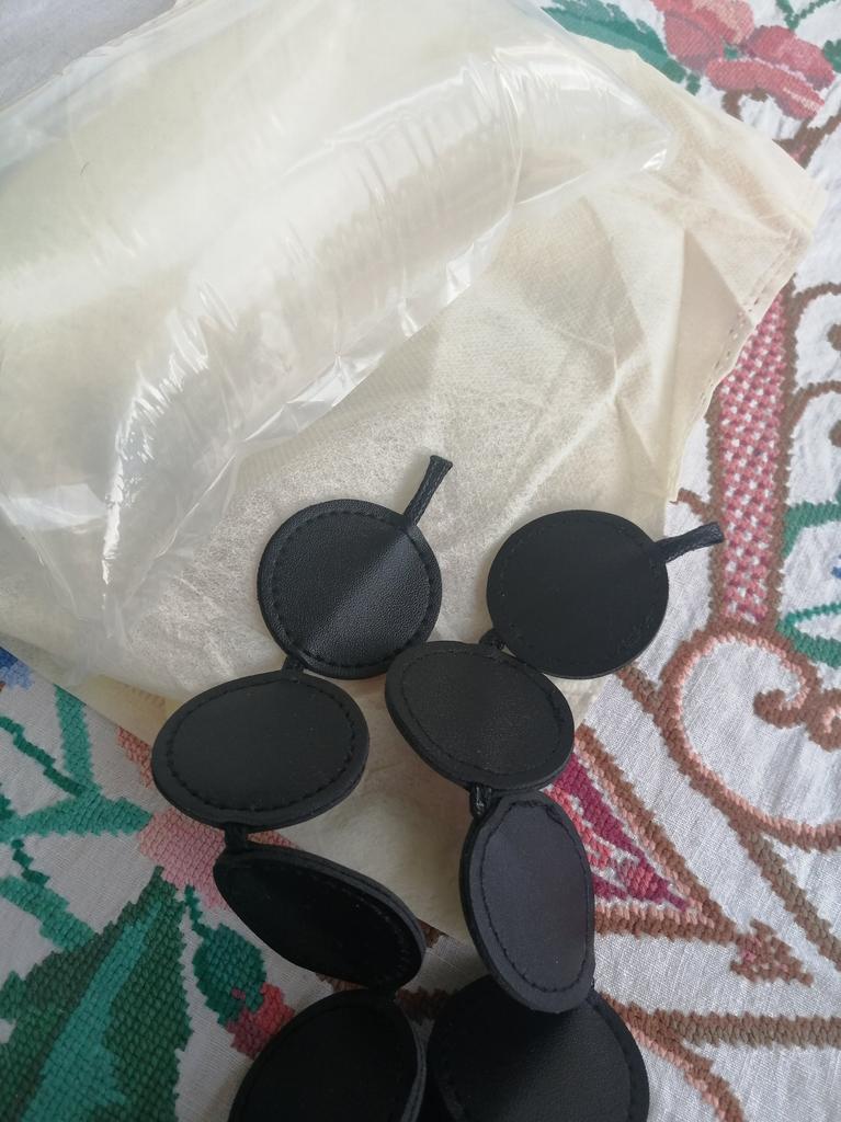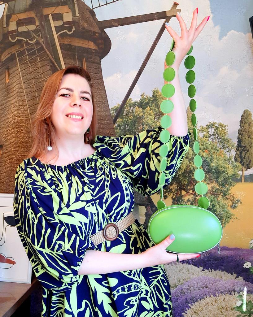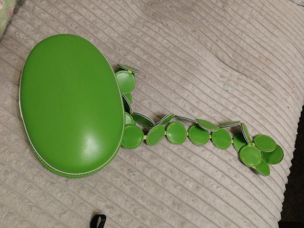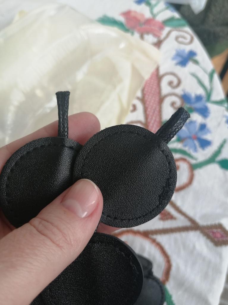 Handbag of an unusual shape. Sewn neatly. There is one belt, long, made of leather circles. Inside without lining, one compartment. A phone and a small wallet will fit.