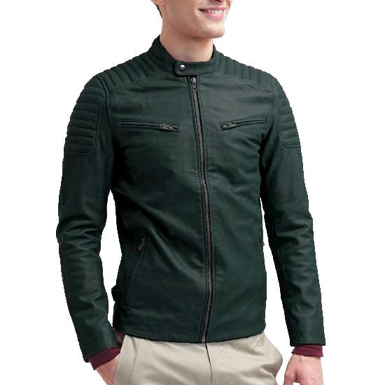 Noora Men's Green Motorcycle Biker Leather Jacket Quilted Leather Jacket Snap Collar