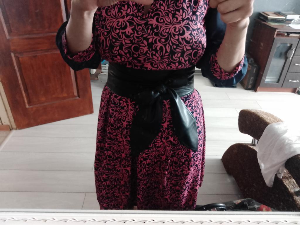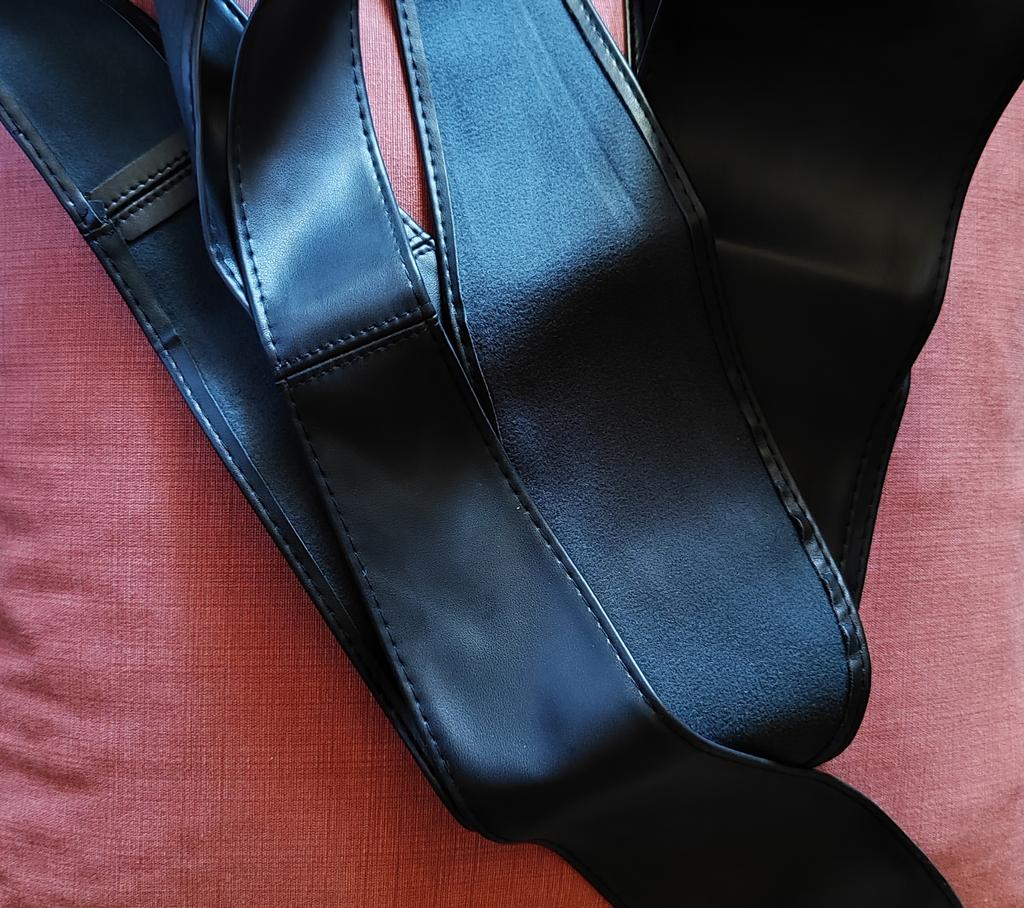 The soft eco-leather belt is quite long. There is a slight unpleasant odor. I hope it wears off. The seams are very even.