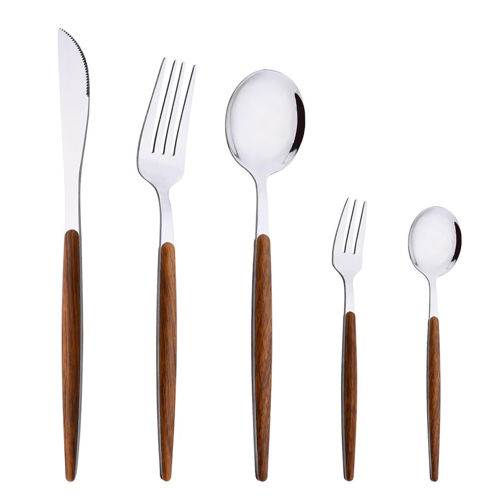Stainless steel silverware set with wooden effect handle, elegant look will make good match your existing tableware. This silver flatware set is a perfect choice for wedding, Thanksgiving, housewarming, camping, birthday parties,dinner parties. Exquisite Craft and Elegant appearance make it a great gift choice.