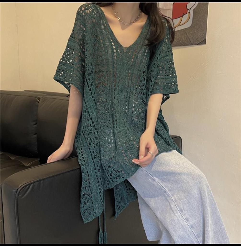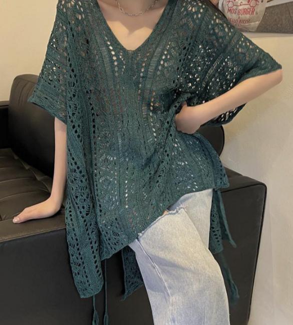 DIMANAF 2024 Plus Size New T-Shirt Women Knitting Bat Sleeve V-Neck Hollow Summer Style Basic Tops Tees Loose Clothing