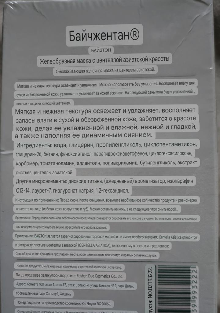 Night mask with Centella Asiatica The set contains 20 pieces, which makes the purchase especially profitable, because one mask is enough for 2-3 applications. The consistency is creamy, and the smell is neutral.. This mask has excellent skin care properties: it effectively moisturizes the skin, tightens pores and helps fight acne. The application is very simple: in the evening, after cleansing the skin, apply the mask and wash it off in the morning. As a result, you will get fresh and rested skin.. I was delighted with this product and can confidently recommend it! I wish everyone successful shopping! 🤗