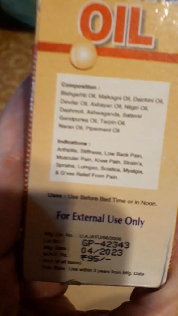 Unfortunate shipment, with very long delivery times, the two bottles arrived, one almost empty, the second missing a quarter of the product. Burdened by customs duties and postal charges, not indicated at the time of purchase. I must also acknowledge Jomm, who refunded me for the almost empty bottle in euros, and customs and postal charges in points. This unfortunately is happening very often for extra-EU orders coming from India, that's why I gave three stars. The product is quite effective for muscle and bone pain. Greetings.