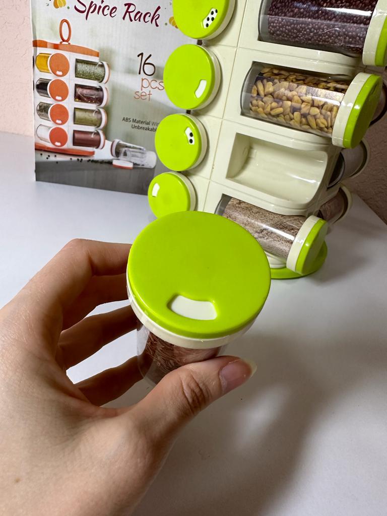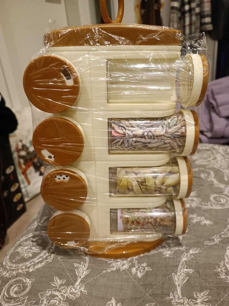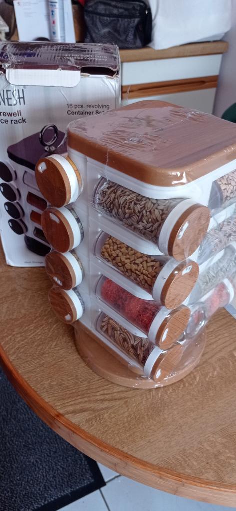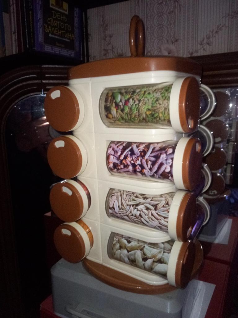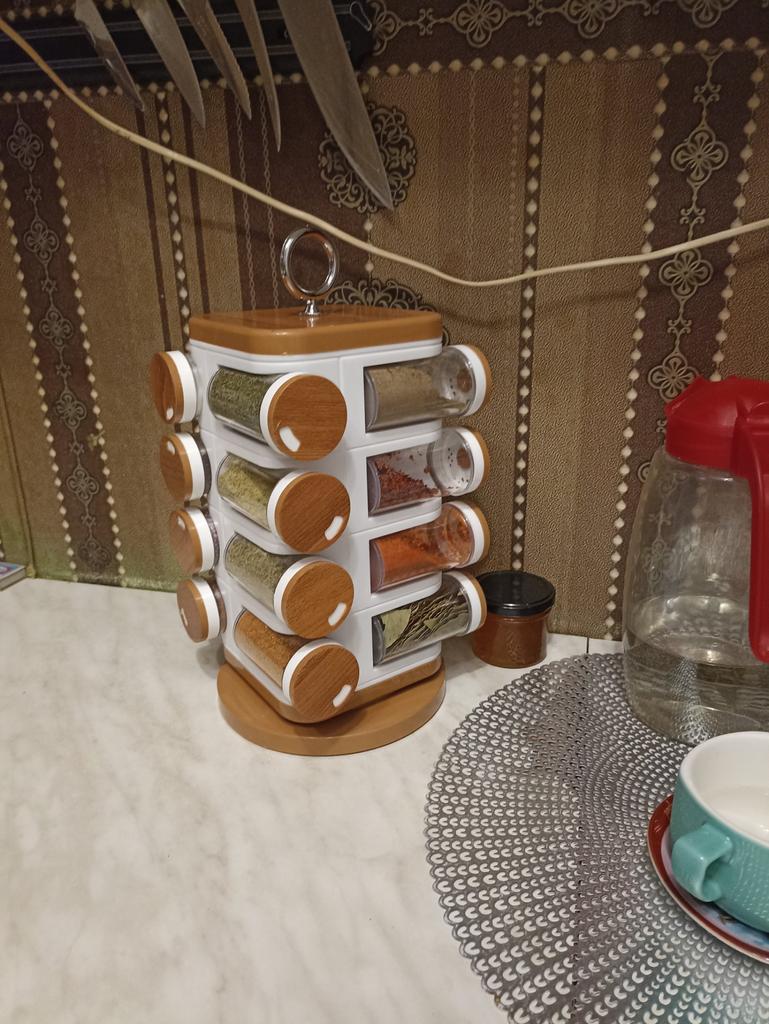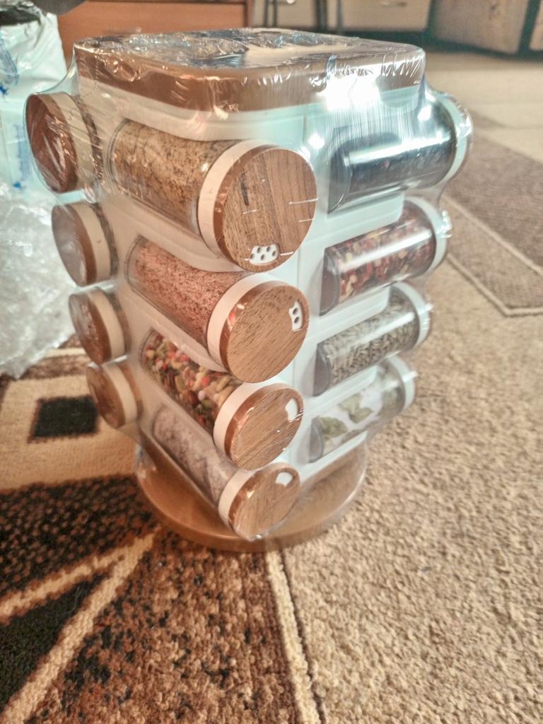 Satisfied, SUPER. Great item for the kitchen. 16 containers for spices. The rotating set is very convenient. Saved a lot of space in the closet. Just great. Thanks Joom, I'm glad.
