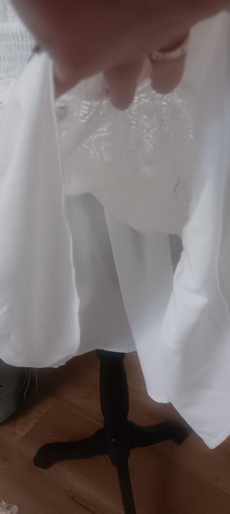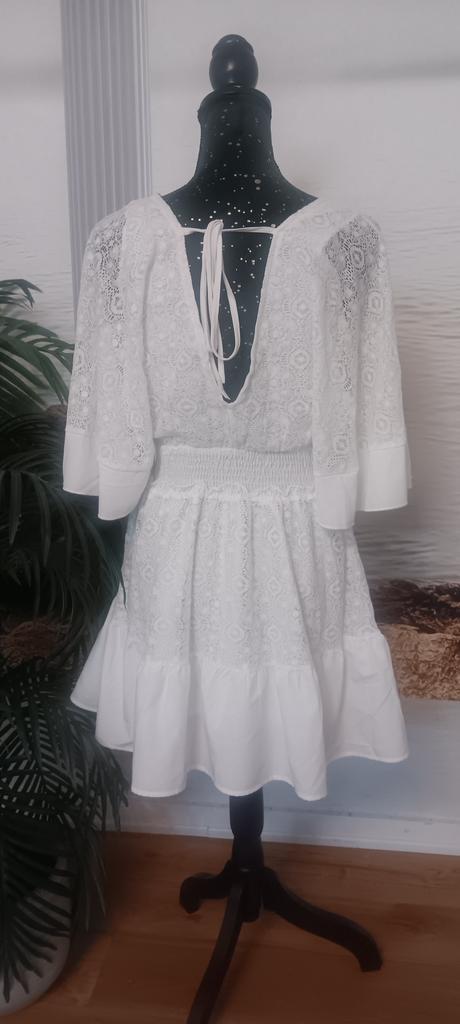 Sweet little dress! Fits me perfectly. You have to order it in your original size. It only comes in white. Thank you! 5 stars!🌞👍
