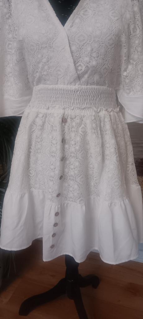 2022 Summer Hook Flower Hollow Womens Clothing Casual Sweet Button Ruffle Lace Dress Elegant Short Bat Sleeve White Dress 22195
