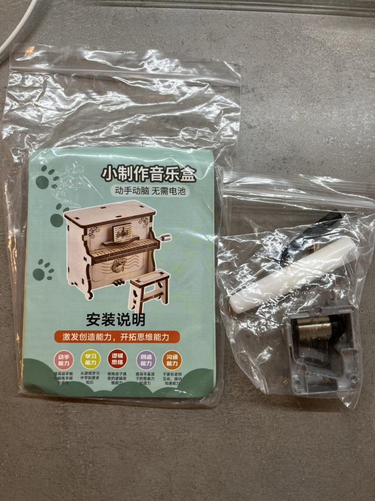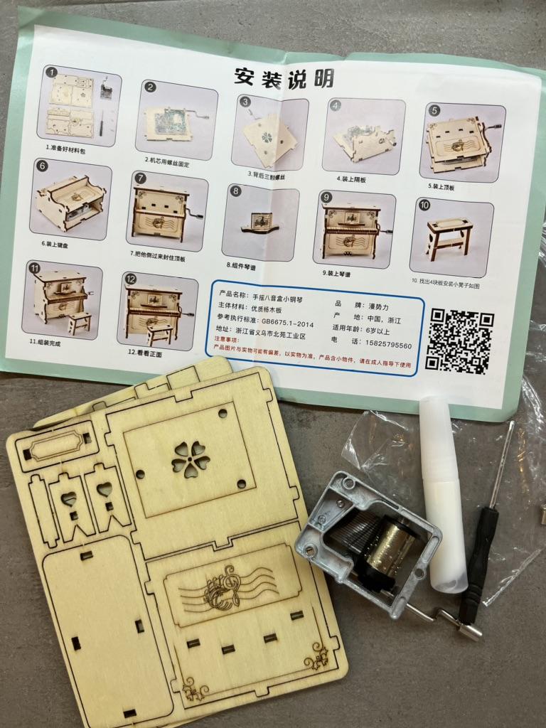 The instructions are in Chinese, but with pictures, so it's not a problem. It is going to be "hard", but strong. The set includes 2 wooden boards with parts, a separate bag with a musical mechanism, cogs and a screwdriver, a small saw that cleans chips well.