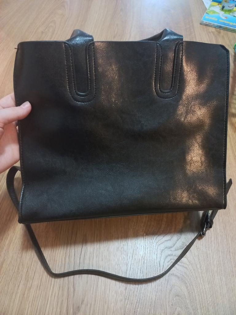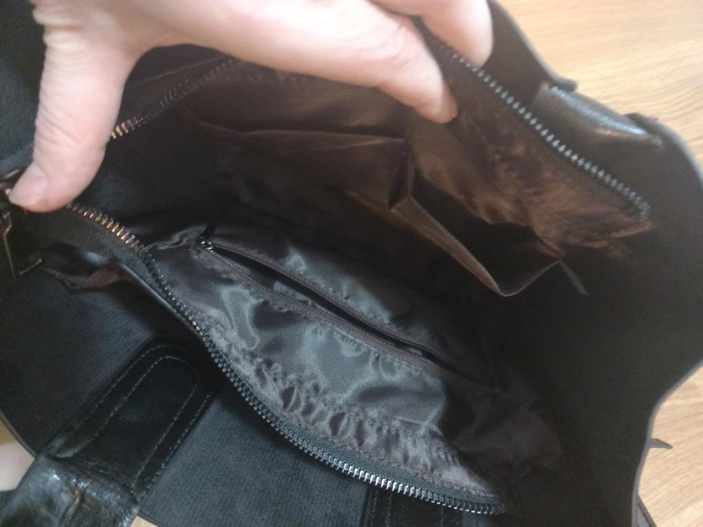 The bag is black. Neat, not rigid, does not stand up straight. No smell. As for the leather, I doubt it. You can't get to the inside, all the seams and edges are sealed. No sample of the material. One compartment with a lock. Everything is as in the photo. The size is small, in my opinion, and there is a slight disproportion in length and width. But it is good for everyday use.