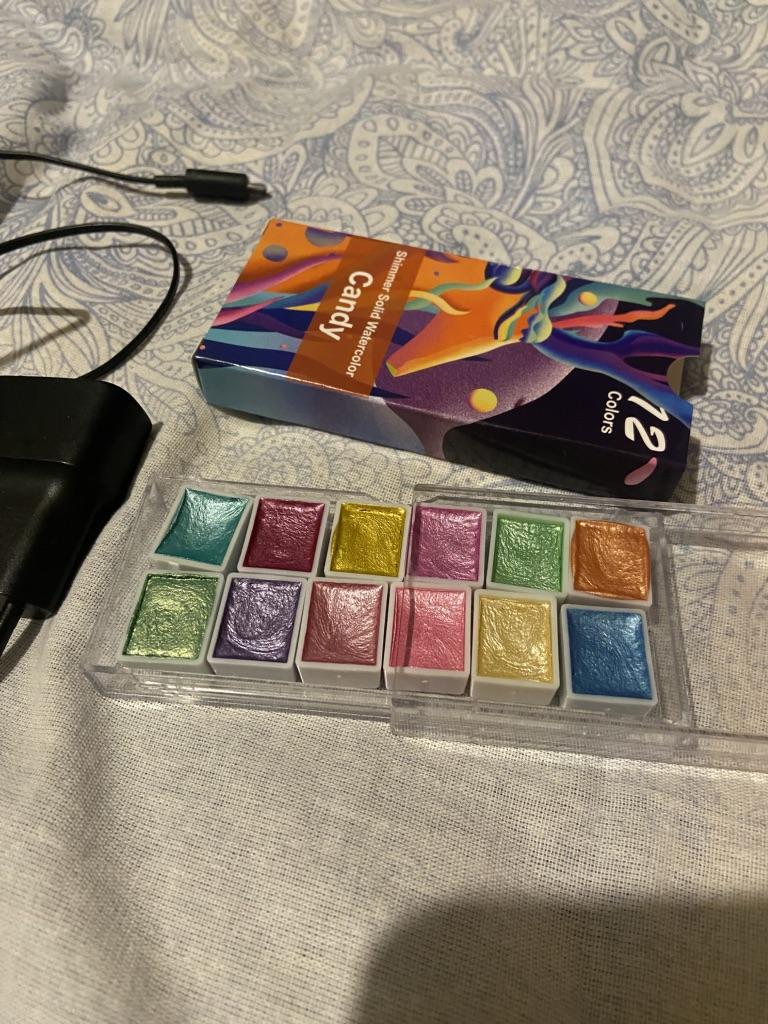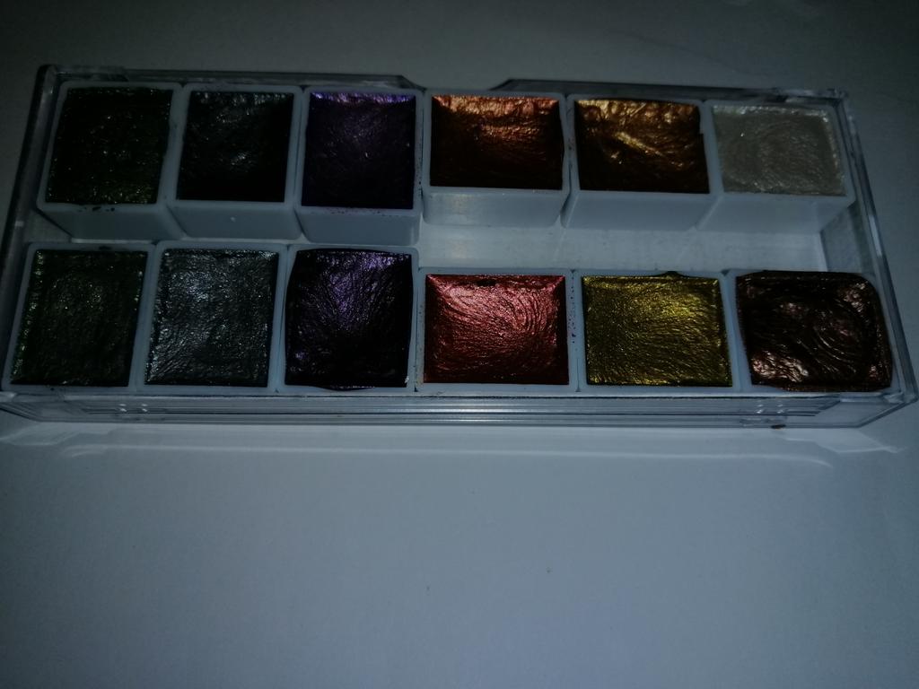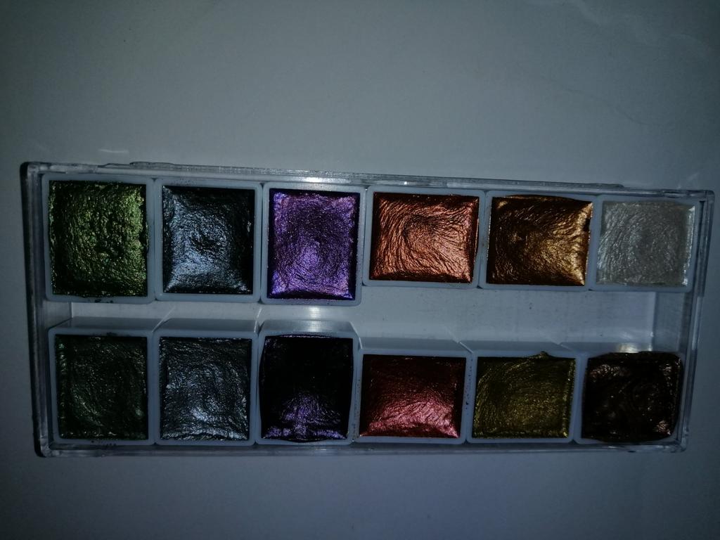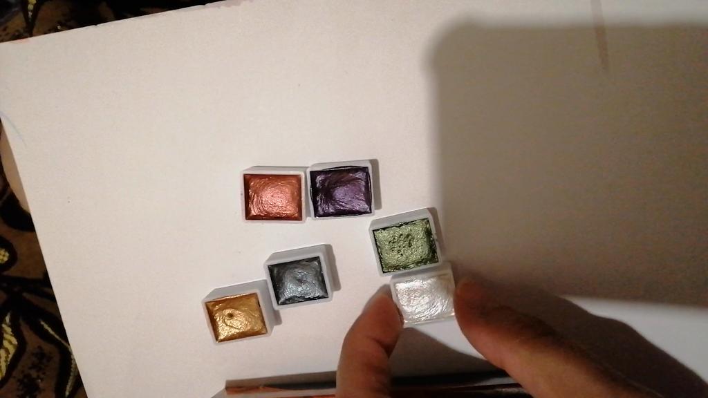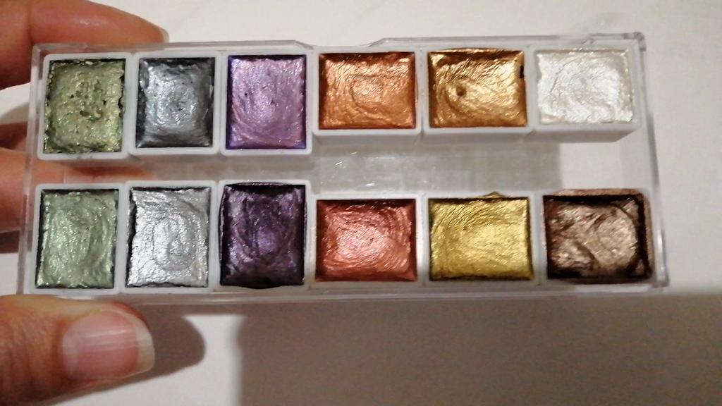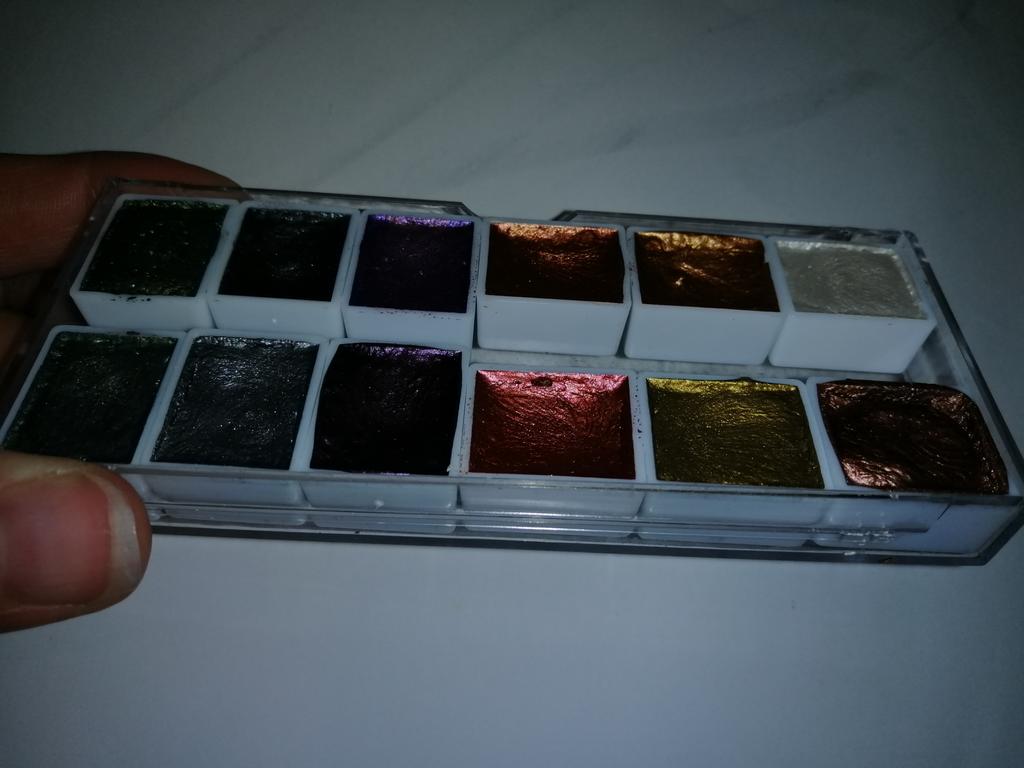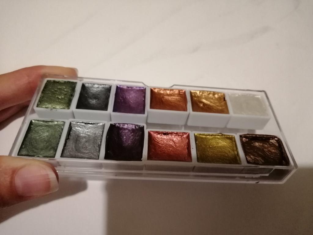 I really liked the shimmer paints, they have a good shine, no extraneous smells, great packaging, but out of 12 cuvettes, only 2 are full!, all the others have a clear dent, as if someone had already tested them, this is unpleasant because the paints are not cheap. I will try it in drawing, I will add feedback on the quality.