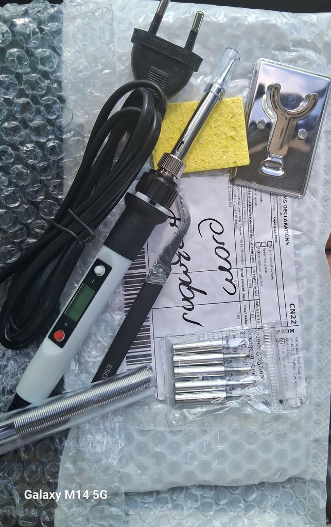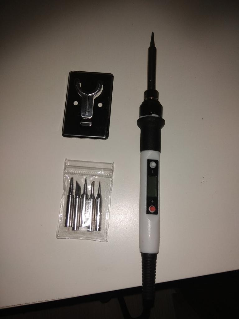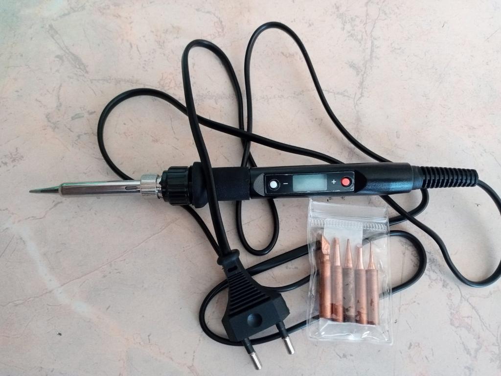The soldering iron works fine. The display and buttons are all in order. The product is whole.. The tin, stand and soldering iron attachments did not arrive as described in the description..