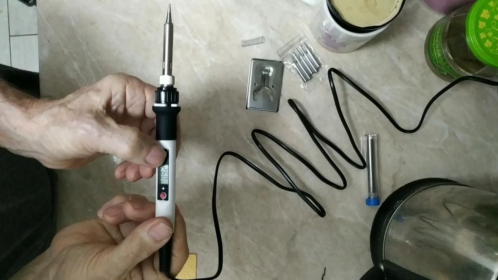 The soldering iron works, heats up extremely quickly, and has temperature control. You can calibrate the temperature by pressing two buttons simultaneously. The soldering iron itself, by the way, is a complete copy of the JCD908S, the ceramic heater is also easy to change.