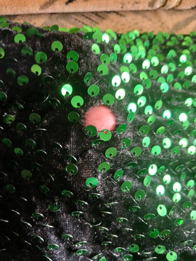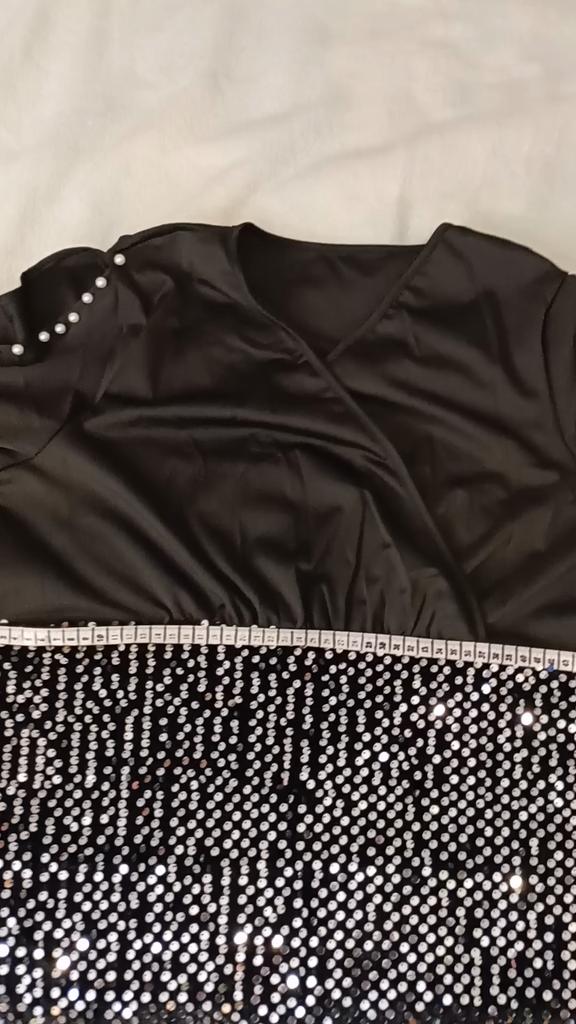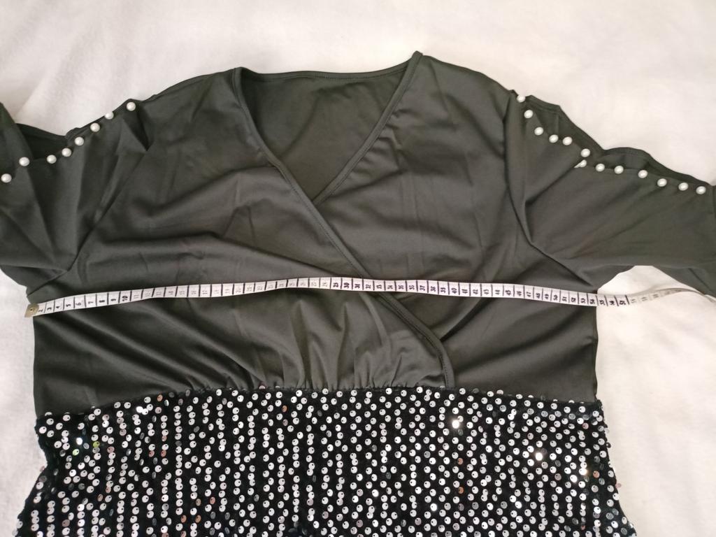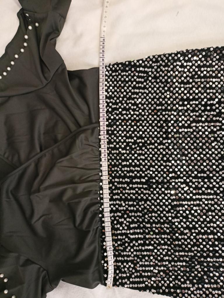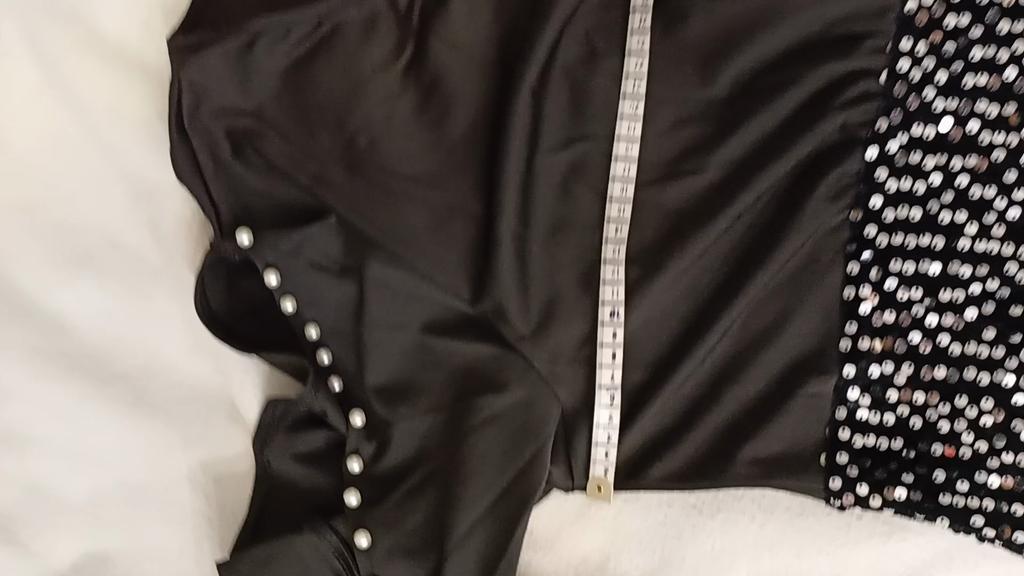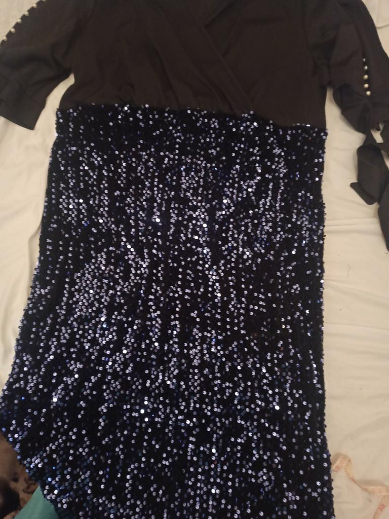 A little tight on the stomach and hips. Bottom part is transparent. Scratching the sequins.