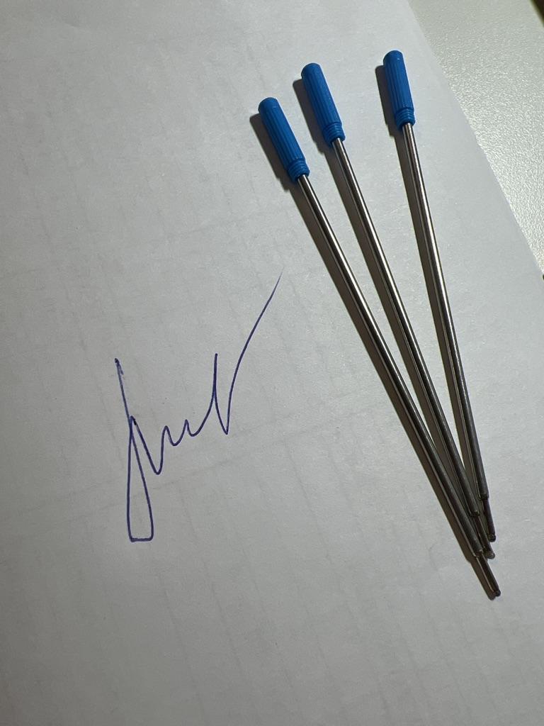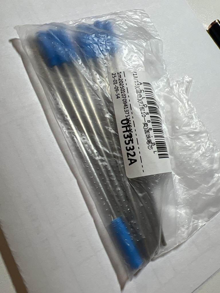 All 10 refills arrived, I tried one, it writes softly, the color is dark blue, the tip is sealed with silicone. Thank you