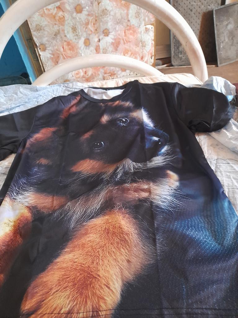 I bought it for my grandson, but I wear it myself. (He doesn’t like such colored people). Our dog is a copy of the one in the photo. So, I’m walking with him in this T-shirt. Nice thin fabric. I couldn’t help but brag)))