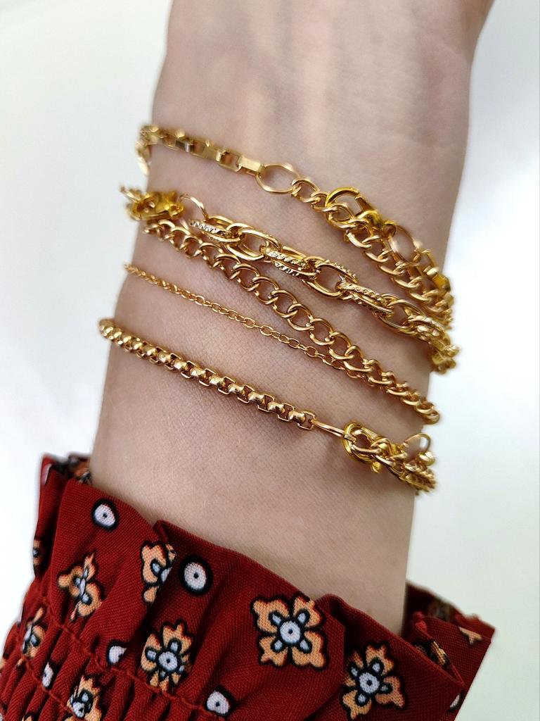 4 pieces bracelet,can be worn separately or all together,gold finish,lobster clasp with extention chains.Came in presentation gift box ,seller added few gifts.Delivery took 3 weeks to Ireland.Happy Shopping!