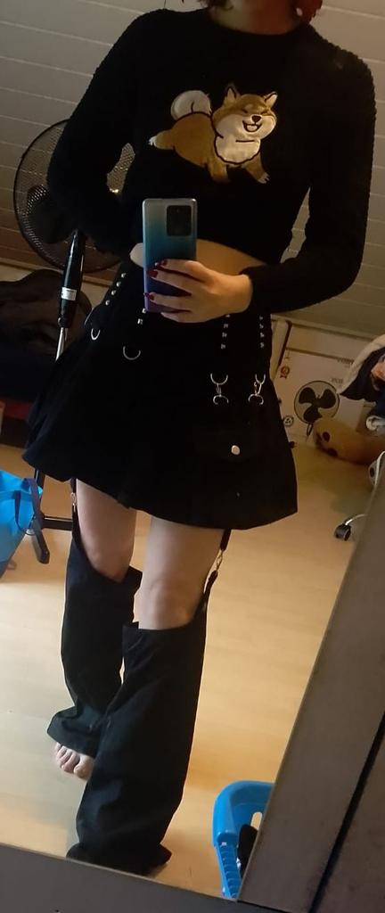Fits me great and arrived quite quickly. The pant legs are a bit long but I guess you should wear this skirt with platform shoes. The material isn't bad at all and I personally give it a big + because the bag is real. My cell phone doesn't fit in it, but it's enough for a small wallet. Something else came to me that I have no idea what it is supposed to be. It looked like lipstick at first but when I take the cap off the thing has a spray nozzle. The thing itself is empty but has a small hole at the bottom like a refillable lighter. I have no idea what to do with it xD Especially not with the two red mini cords But hey, I ordered the skirt and received it great. However, I recommend that everyone measure themselves before buying and look at the size chart so that the long trouser legs don't surprise you too much