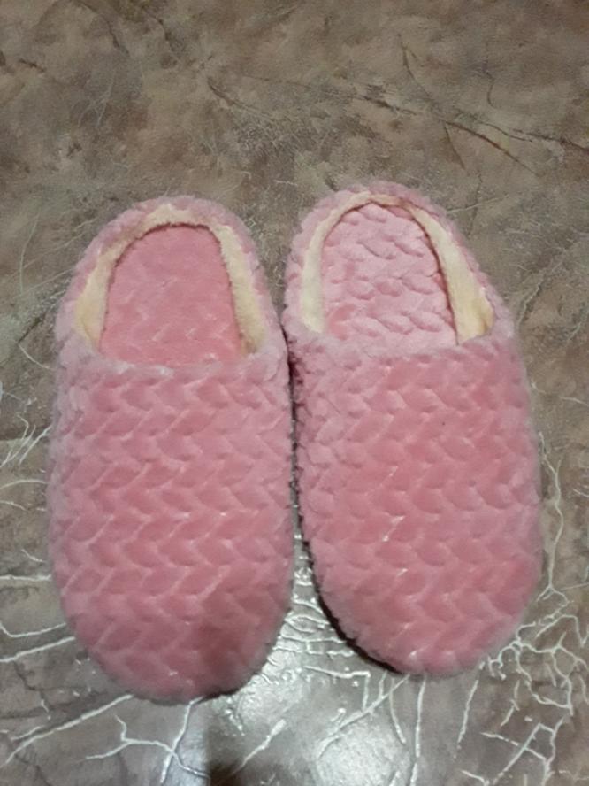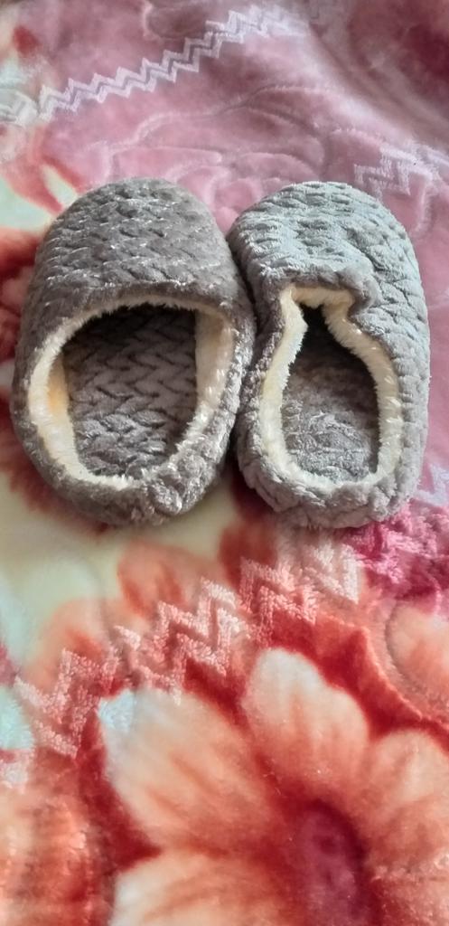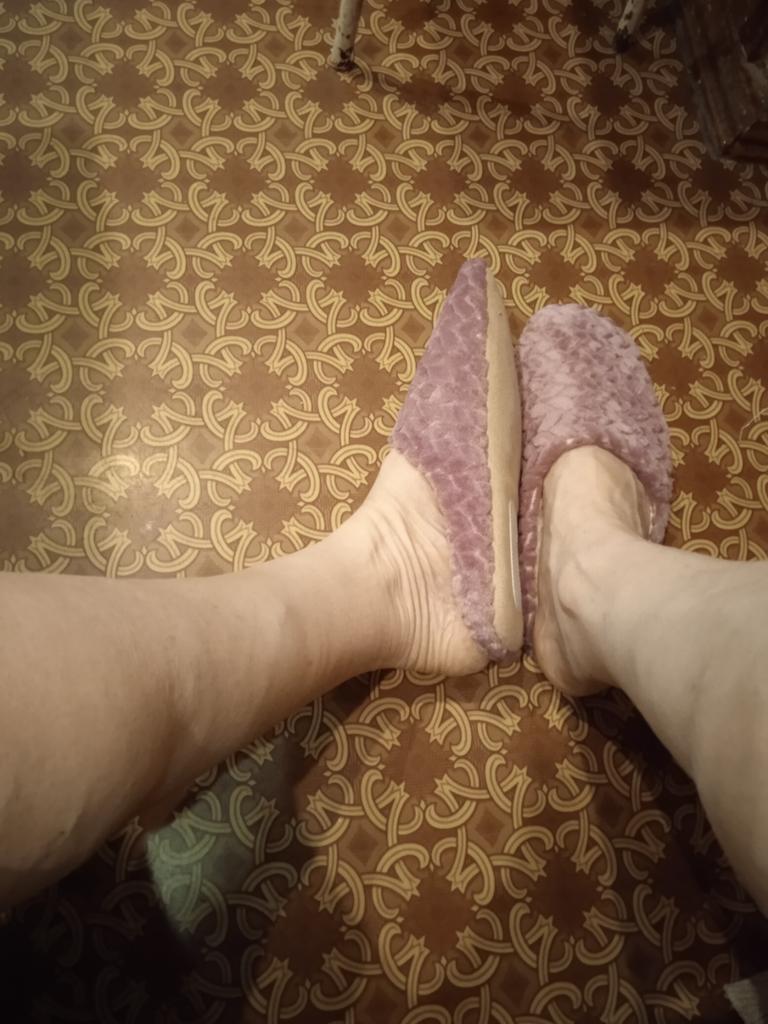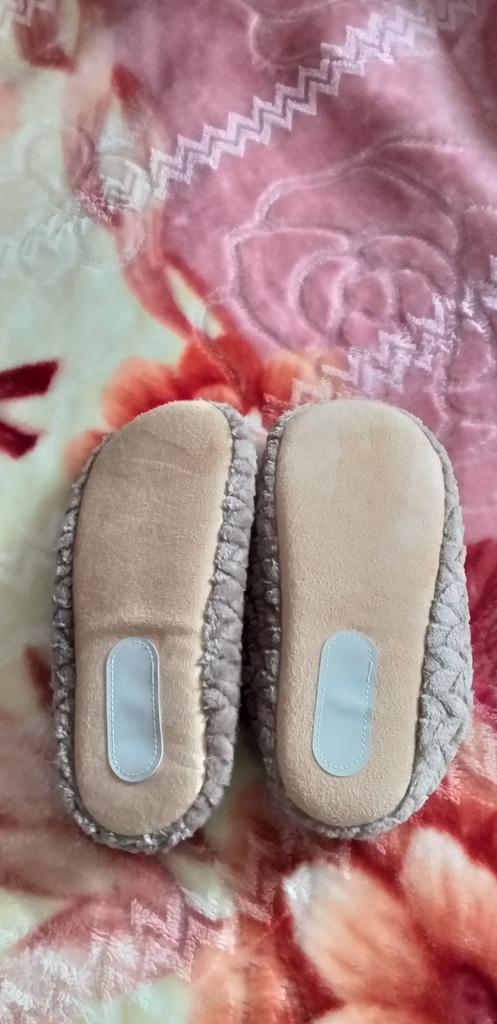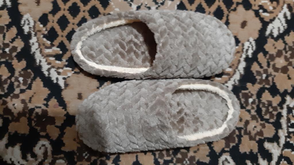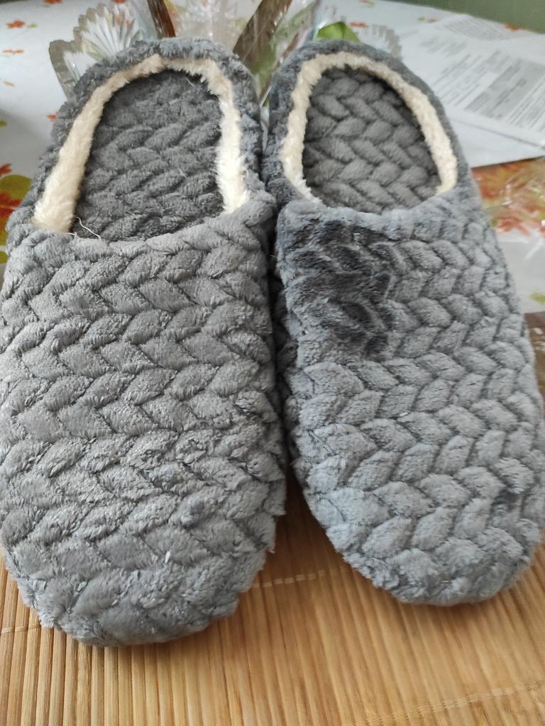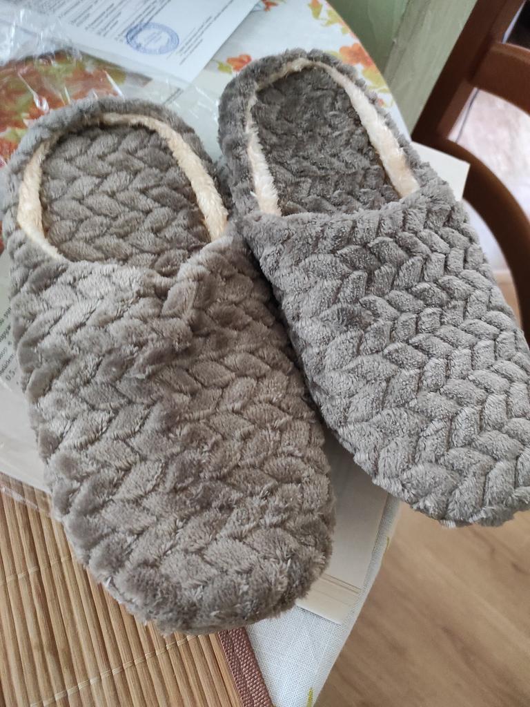 Slippers size 44 45 for a thirty-ninth size. They look as if they forgot to sew the sole to them. Next to them are other slippers size 38-39 (with a sole).