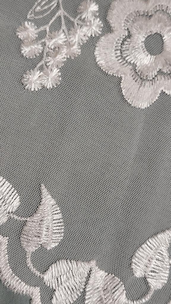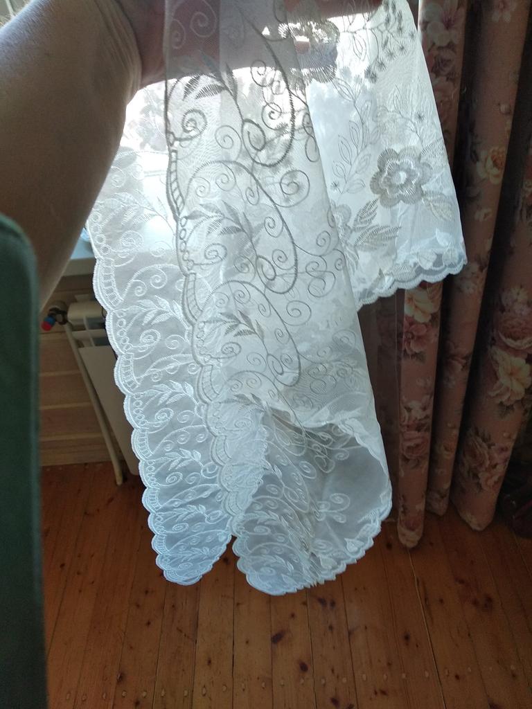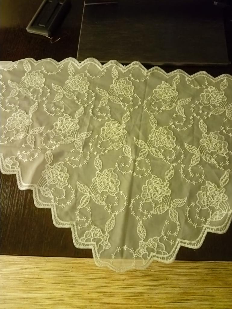 The scarf is a black net embroidered with gold flowers. In the photo the flowers are not yellow, but tobacco colored. And so everything is as in the photo.