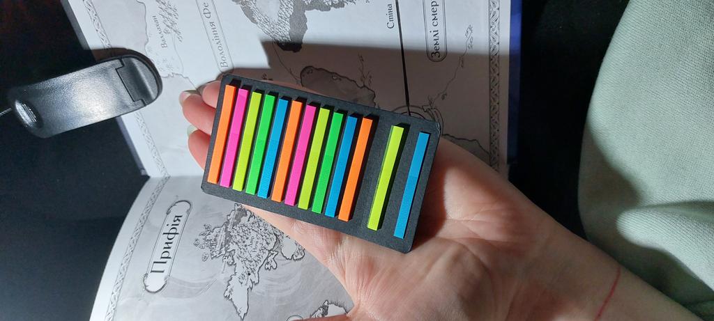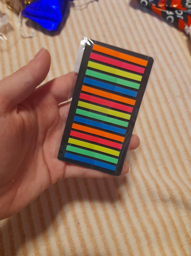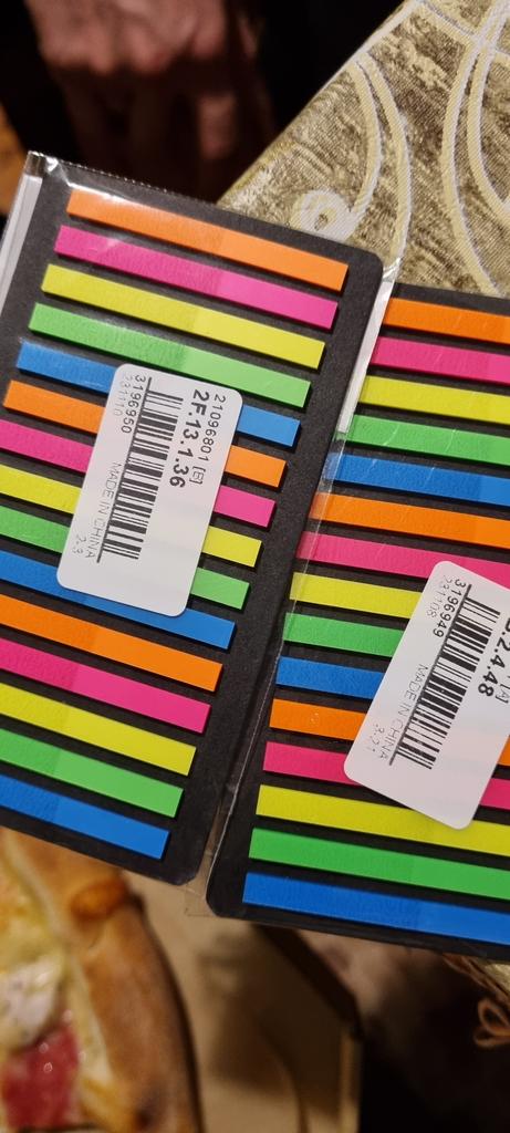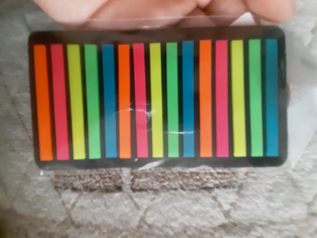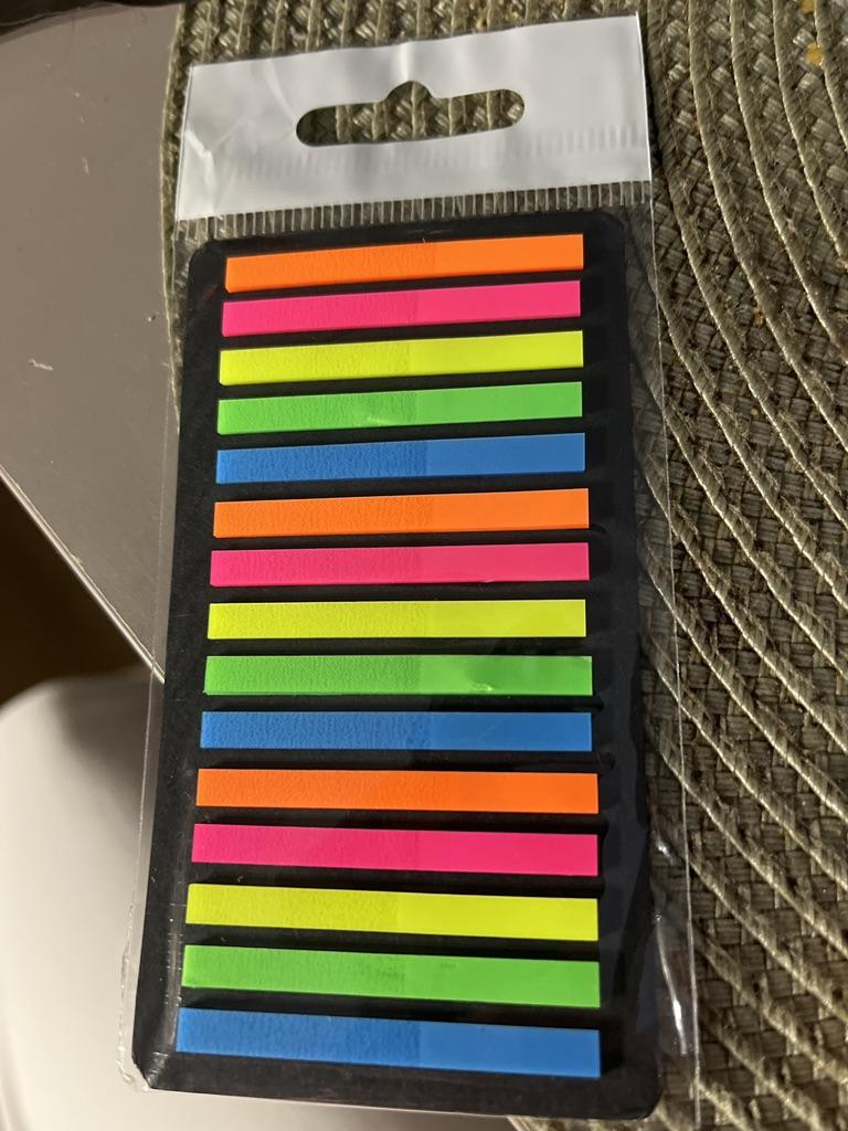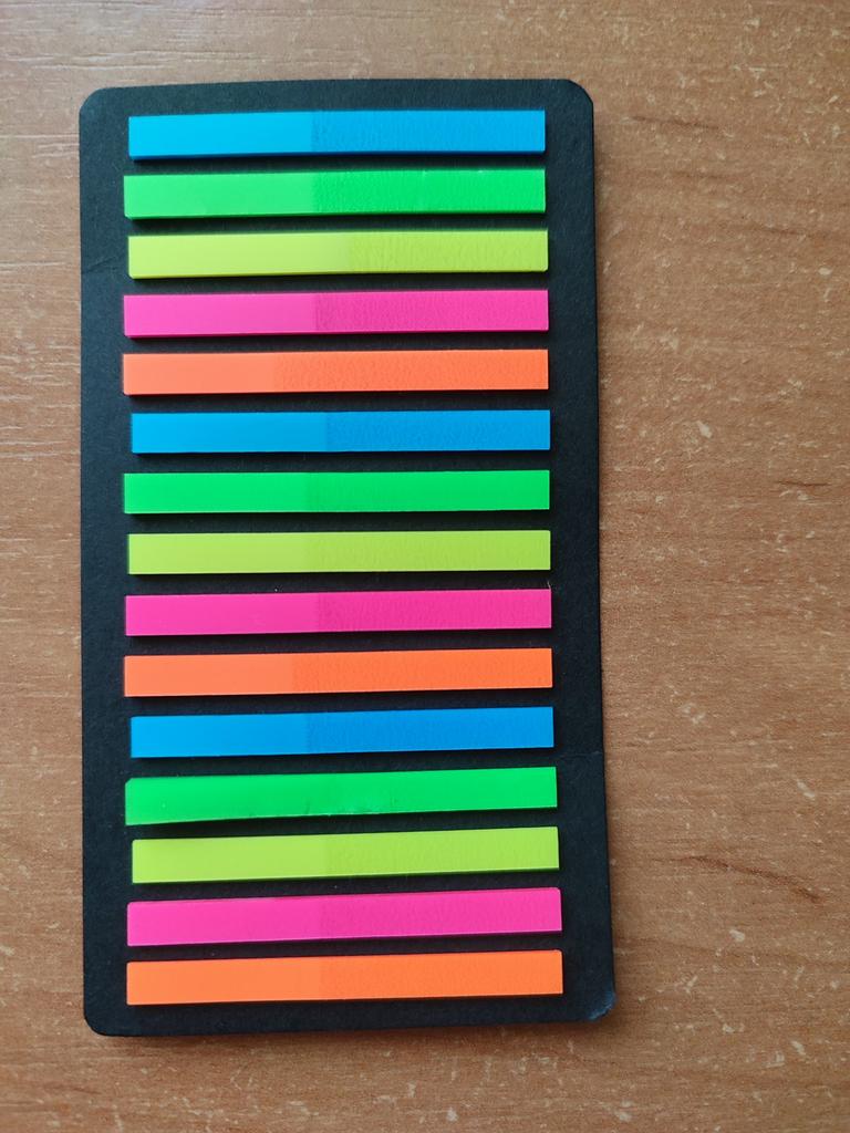 Very good and convenient stickers for highlighting text. High quality, bright. I can't say anything bad. They stick perfectly, but if you remove them, they tear off the top layer of paper. That's why you need to be careful. Ordered on September 17 - received on October 13. The purchase is satisfied.
