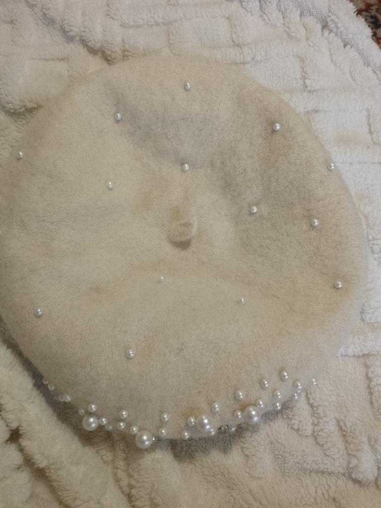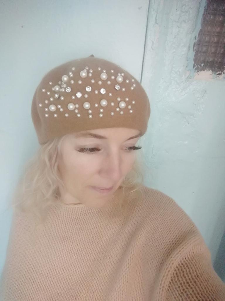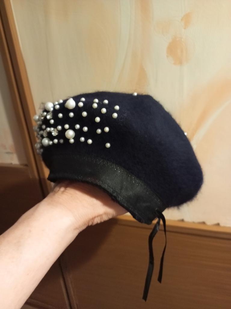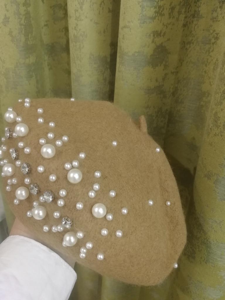 The beret is not bad, for a small head size, 55-56. There is a ribbon inside for tightening, if suddenly it is too big for someone. Pearls on rivets, will hold tightly.