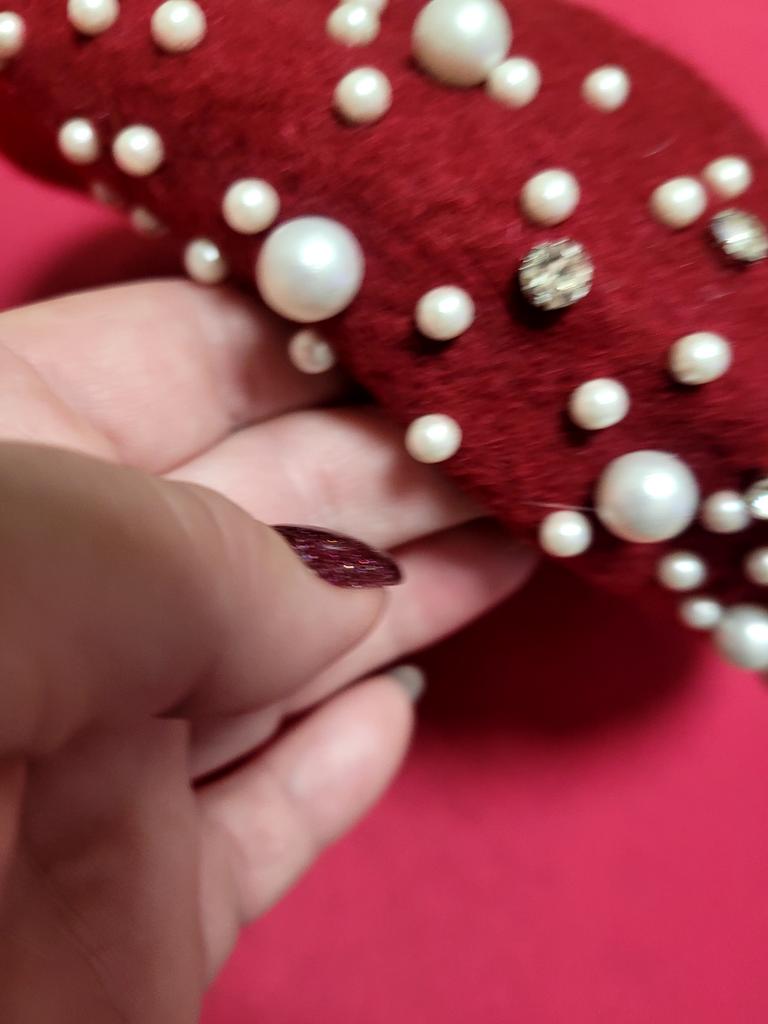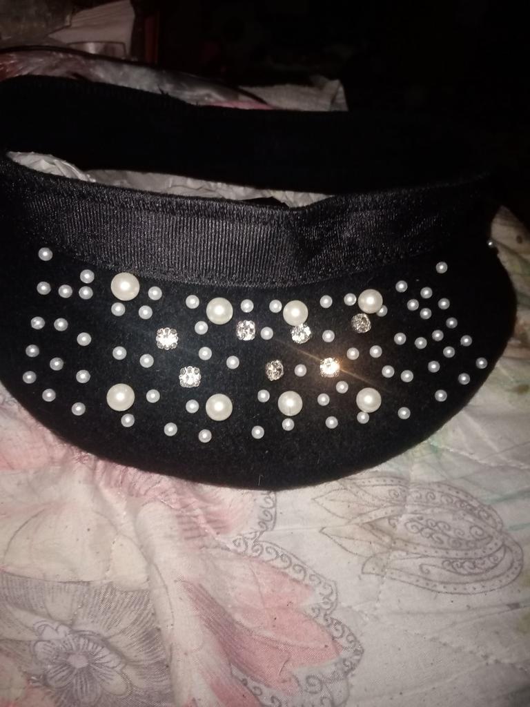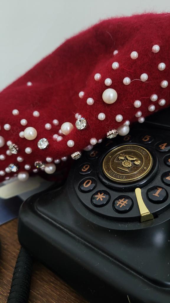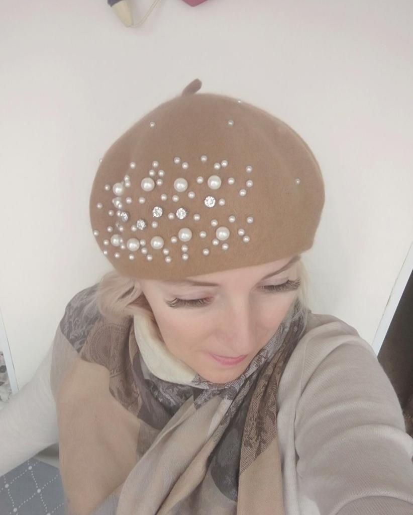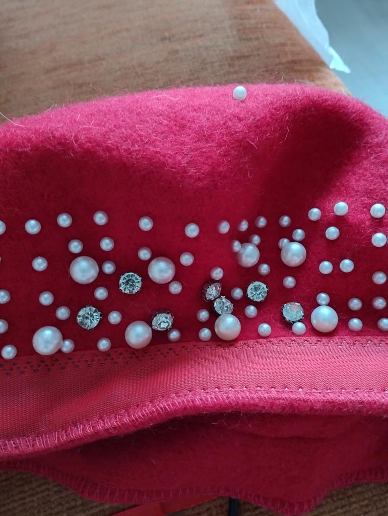 The beret is not bad, for a small head size, 55-56. There is a ribbon inside for tightening, if suddenly it is too big for someone. Pearls on rivets, will hold tightly.