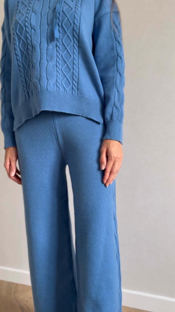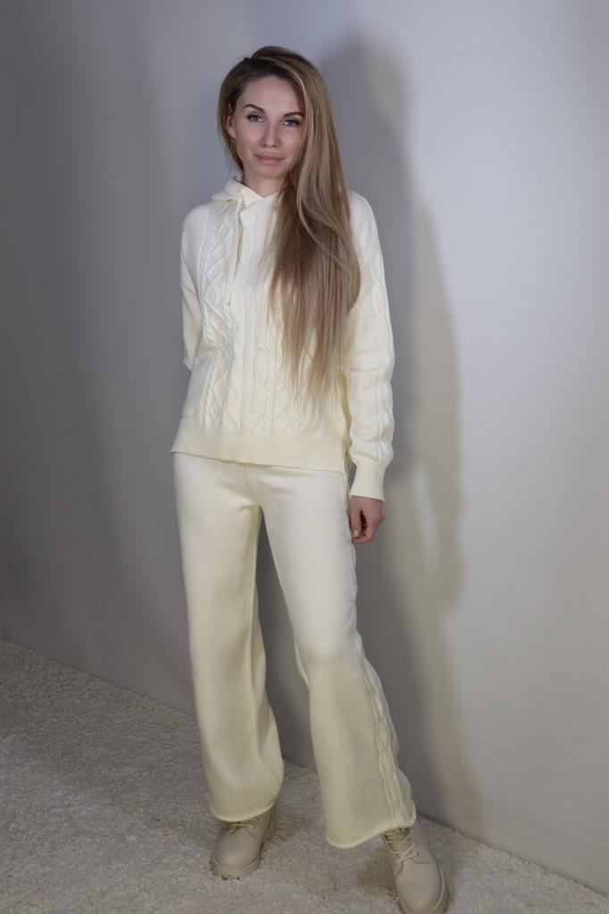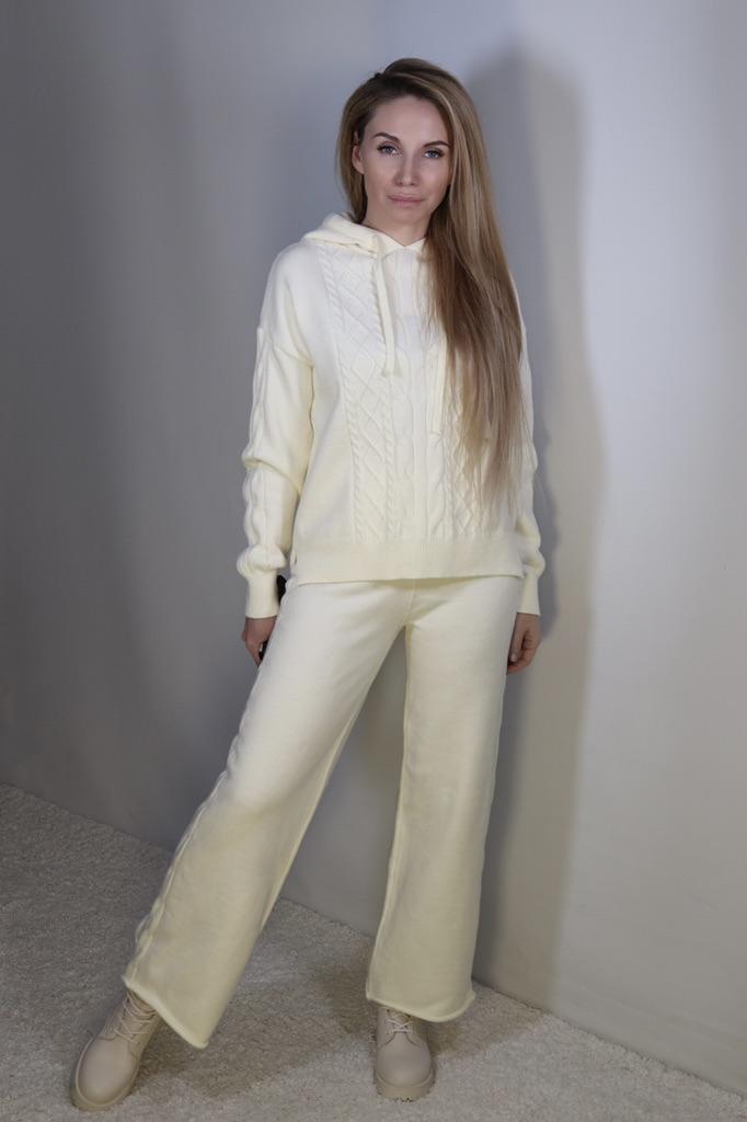 Women Autumn Hooded Neck Solid Color Knitwear Wide Leg Pants Two Piece Set