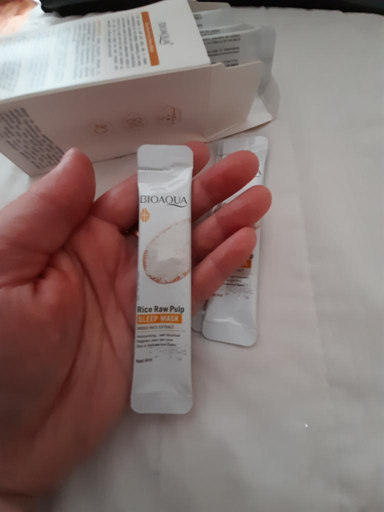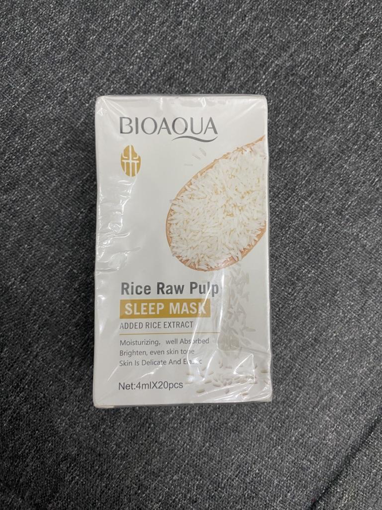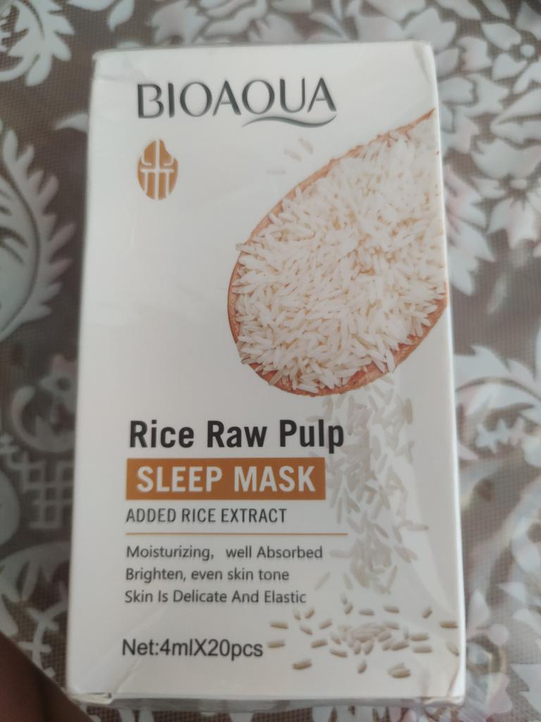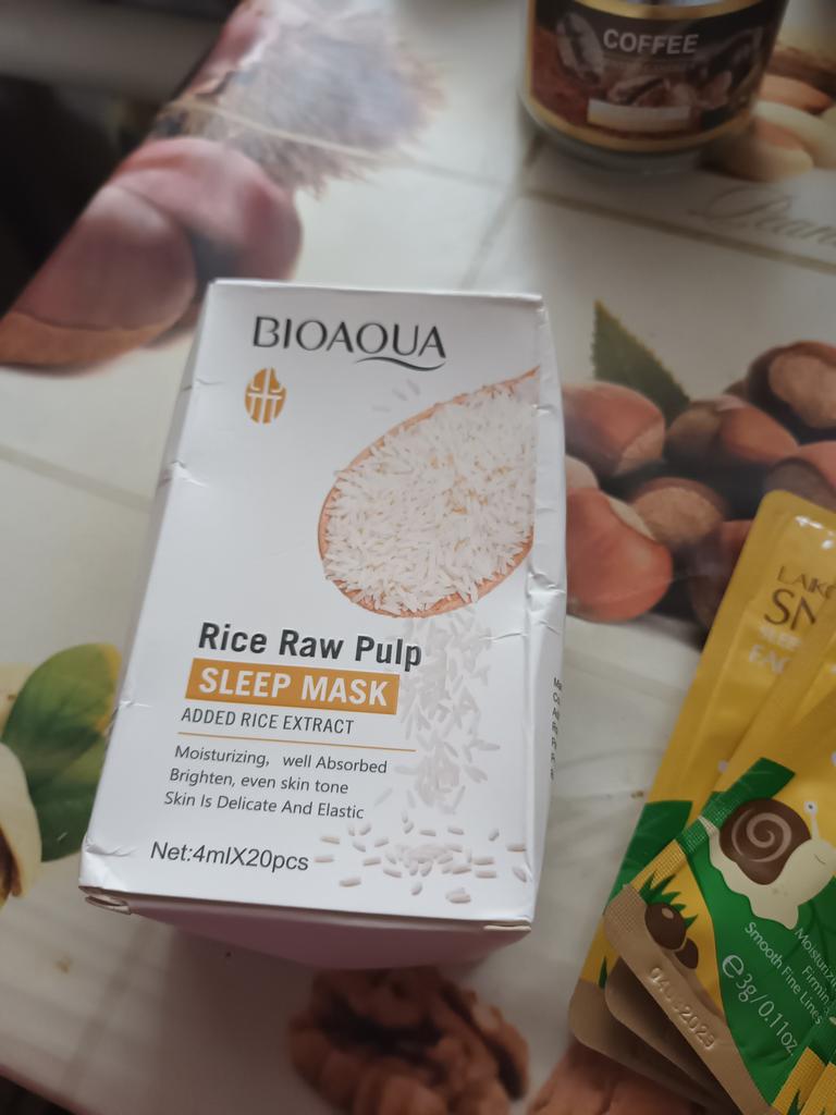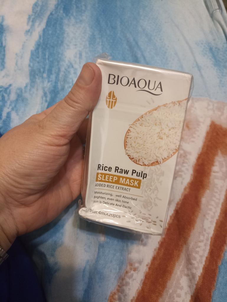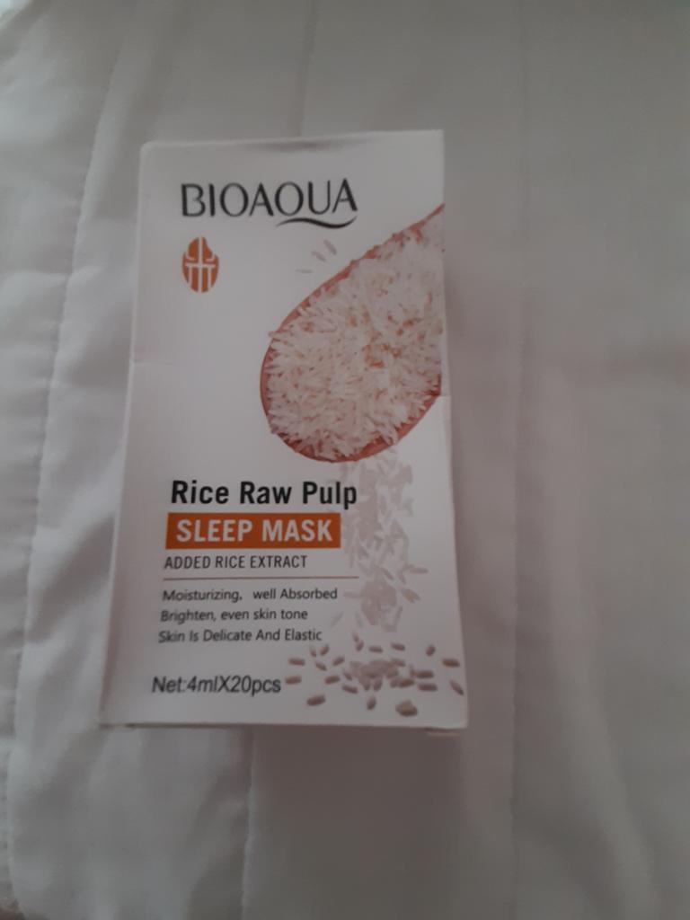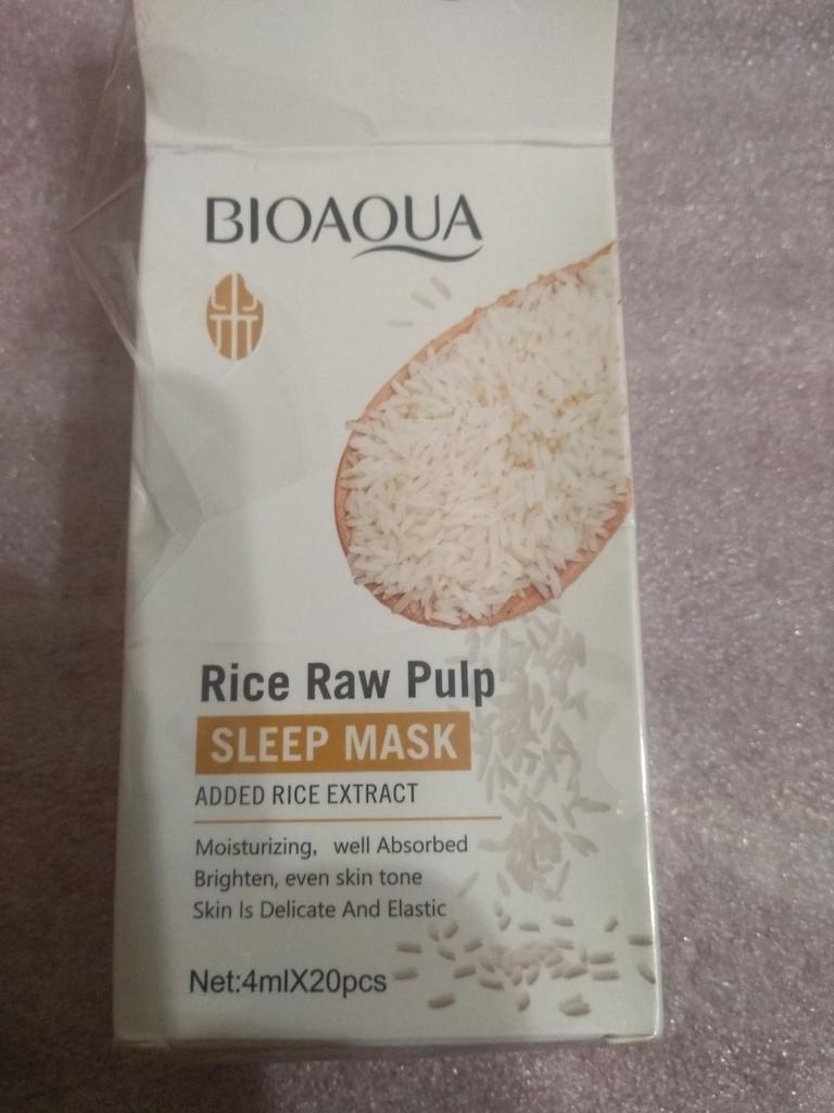 Rice raw sleep mask/rice night mask Free from microplastics/ does not contain microplastics 😊 I have had bad experiences with this brand. This was the first BioAqua product I ordered from here.. I used the masks for two weeks to see/disprove the result. Well, there will be no result. I don't know how others have found this mask, really. All products are kind of heavy, some ingredient seems to block the absorption of products by the skin. This mask is the same - even in the morning it still feels like something is on the skin. Only the smell is pleasant. I have oily skin, with huge open pores, I'm recovering from retinoids, and I'm still using topicals. That is, my skin should absorb the composition in just a second, but - not with this brand. Regarding packaging: I never take into account slightly crumpled packaging or any mechanical damage to the cardboard, I understand that these are purely logistical problems. I have half a pack left. I definitely won't use it..