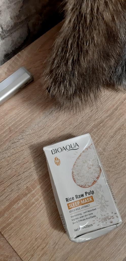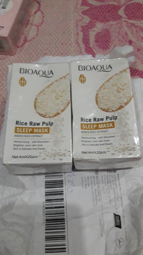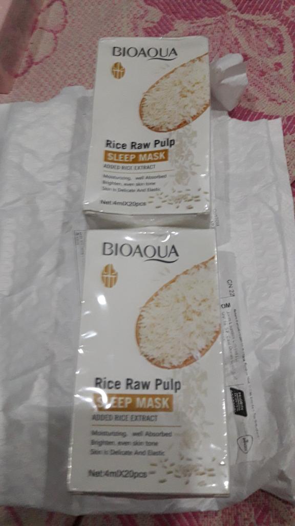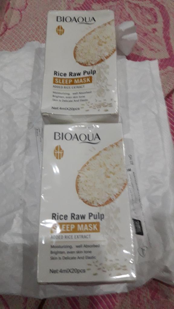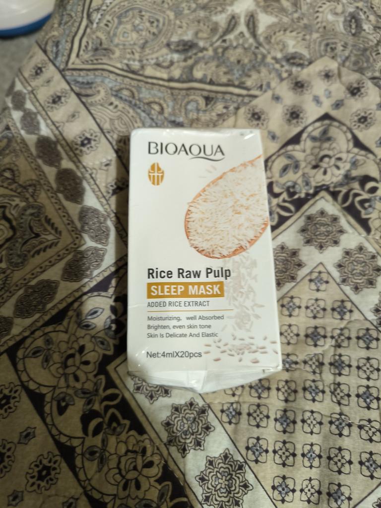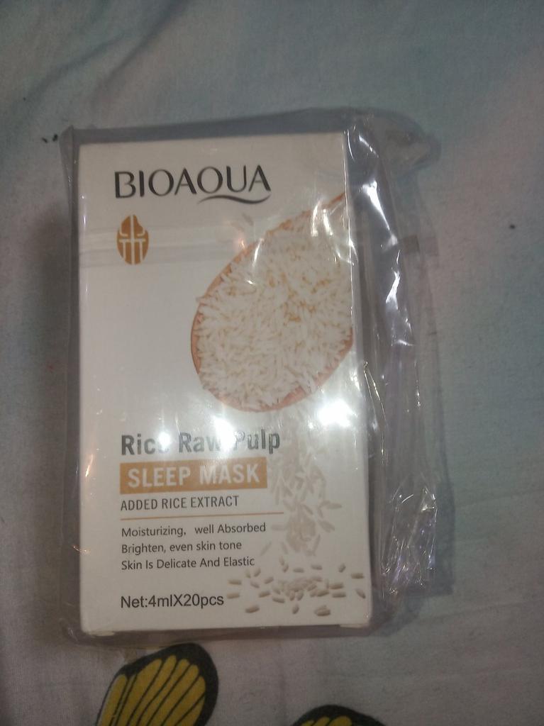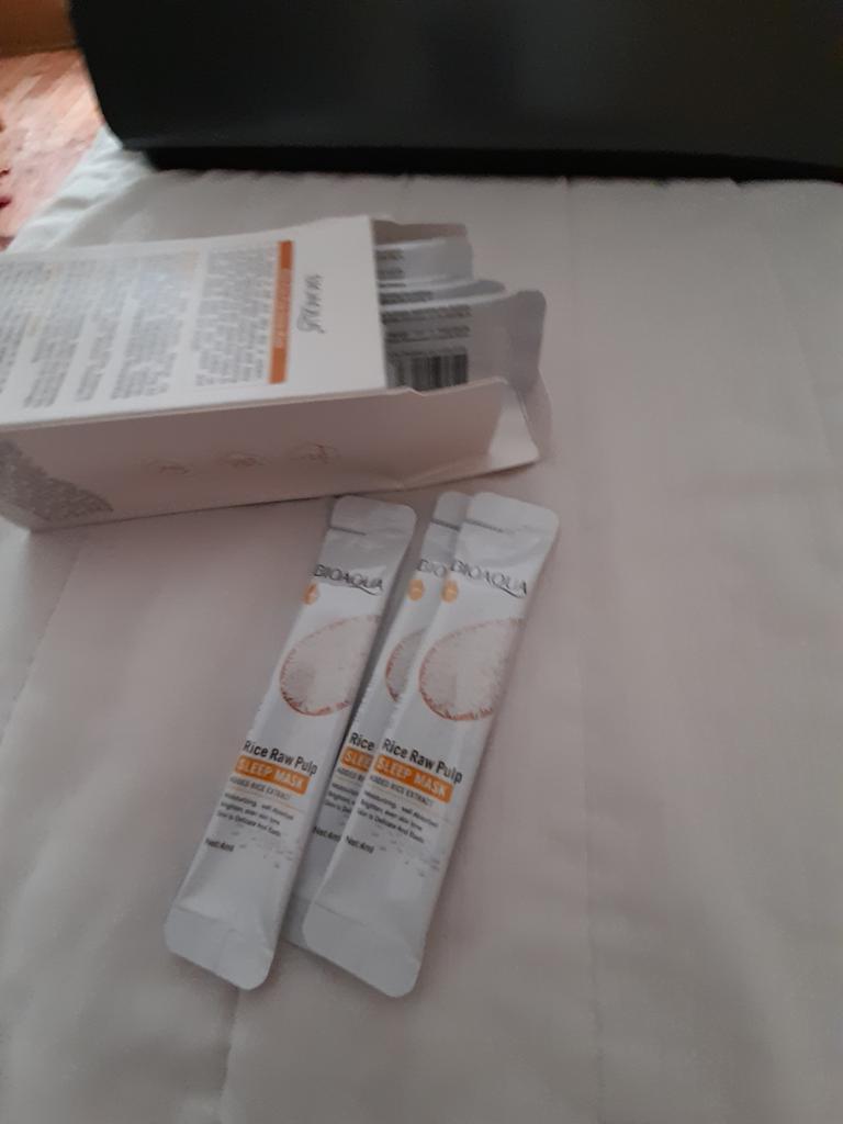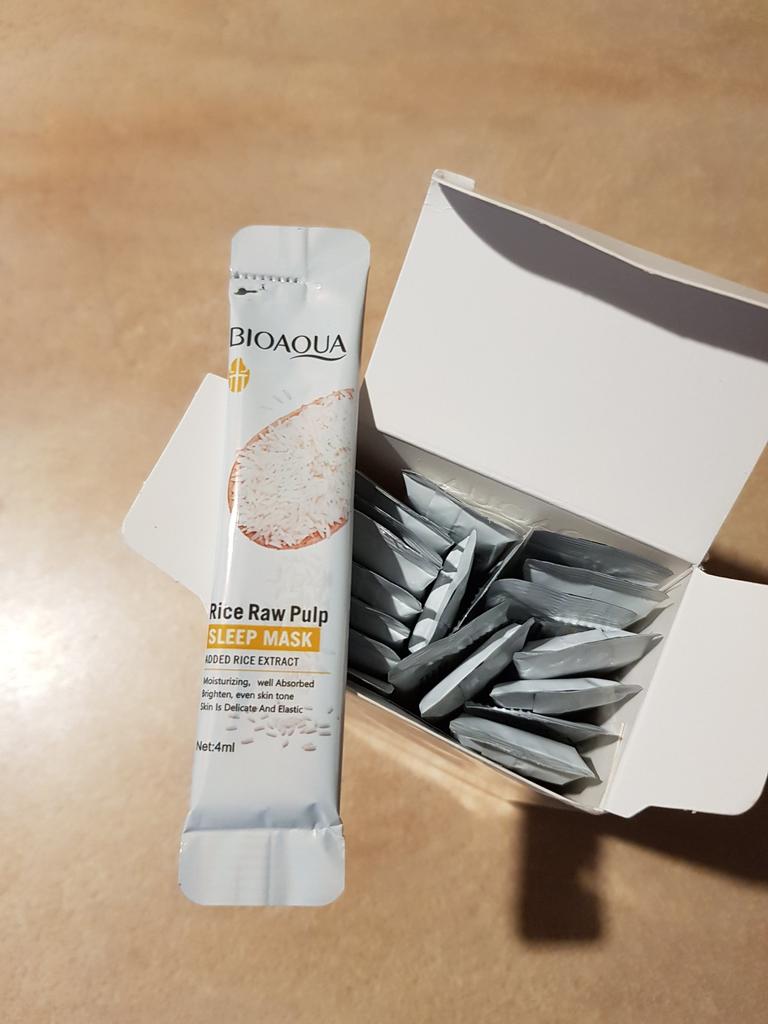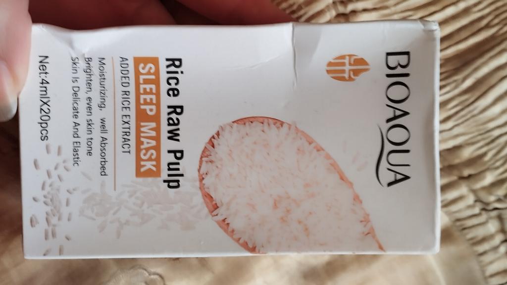 Rice raw sleep mask/rice night mask Free from microplastics/ does not contain microplastics 😊 I have had bad experiences with this brand. This was the first BioAqua product I ordered from here.. I used the masks for two weeks to see/disprove the result. Well, there will be no result. I don't know how others have found this mask, really. All products are kind of heavy, some ingredient seems to block the absorption of products by the skin. This mask is the same - even in the morning it still feels like something is on the skin. Only the smell is pleasant. I have oily skin, with huge open pores, I'm recovering from retinoids, and I'm still using topicals. That is, my skin should absorb the composition in just a second, but - not with this brand. Regarding packaging: I never take into account slightly crumpled packaging or any mechanical damage to the cardboard, I understand that these are purely logistical problems. I have half a pack left. I definitely won't use it..