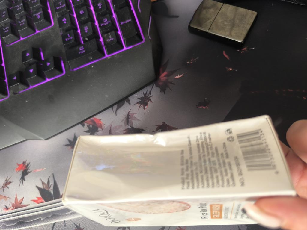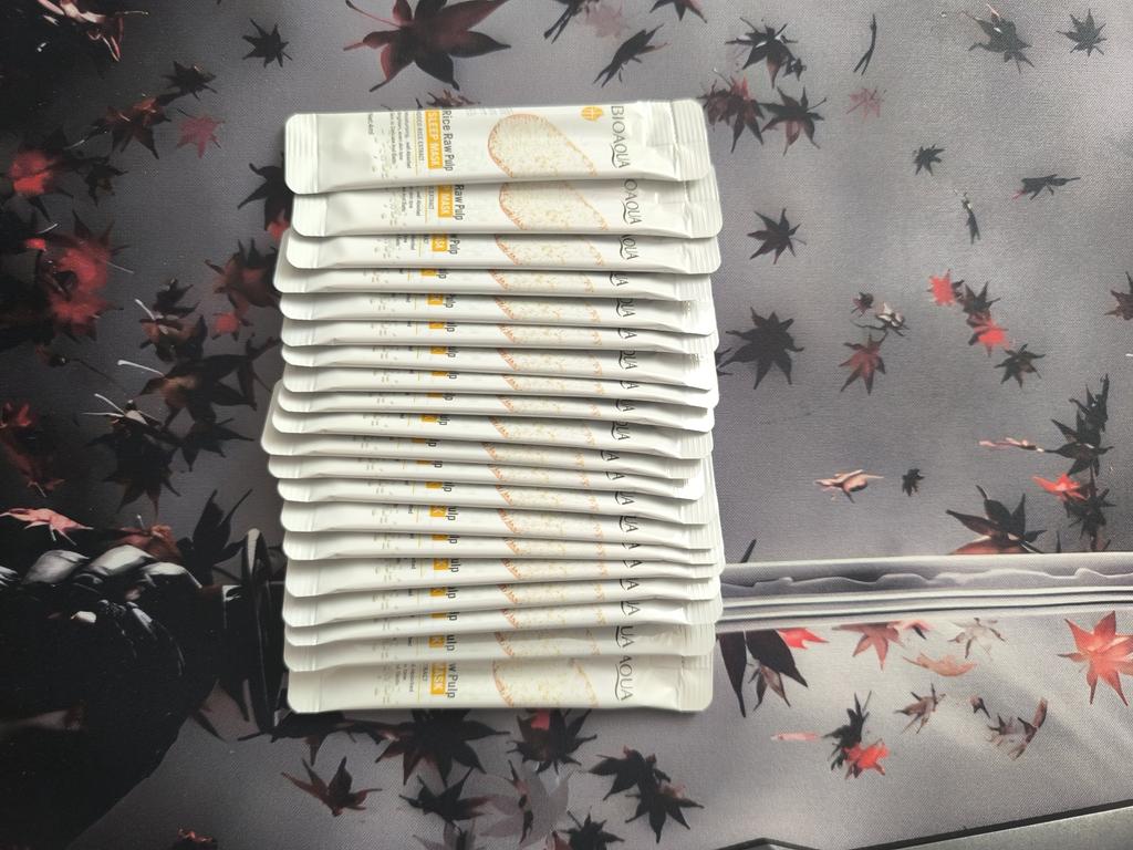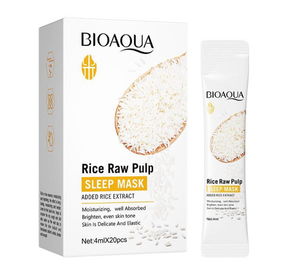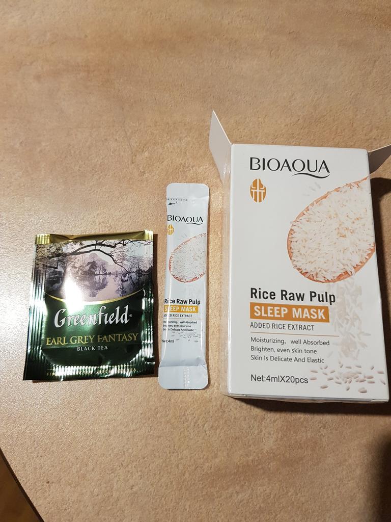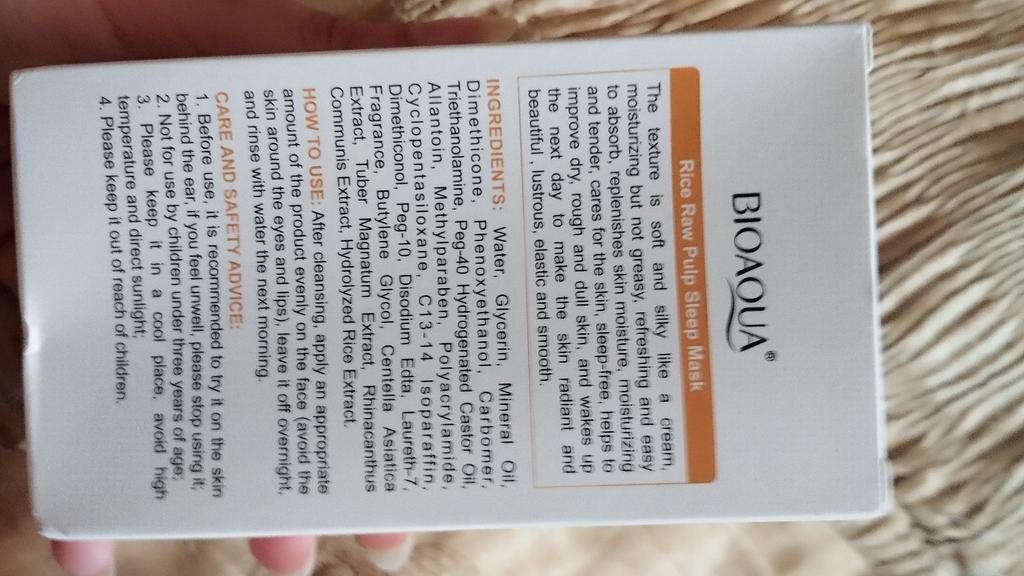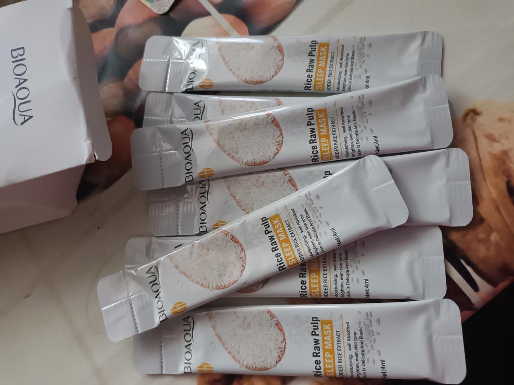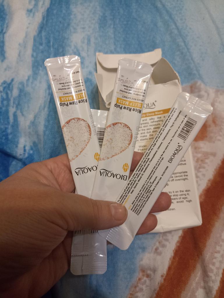 Rice raw sleep mask/rice night mask Free from microplastics/ does not contain microplastics 😊 I have had bad experiences with this brand. This was the first BioAqua product I ordered from here.. I used the masks for two weeks to see/disprove the result. Well, there will be no result. I don't know how others have found this mask, really. All products are kind of heavy, some ingredient seems to block the absorption of products by the skin. This mask is the same - even in the morning it still feels like something is on the skin. Only the smell is pleasant. I have oily skin, with huge open pores, I'm recovering from retinoids, and I'm still using topicals. That is, my skin should absorb the composition in just a second, but - not with this brand. Regarding packaging: I never take into account slightly crumpled packaging or any mechanical damage to the cardboard, I understand that these are purely logistical problems. I have half a pack left. I definitely won't use it..