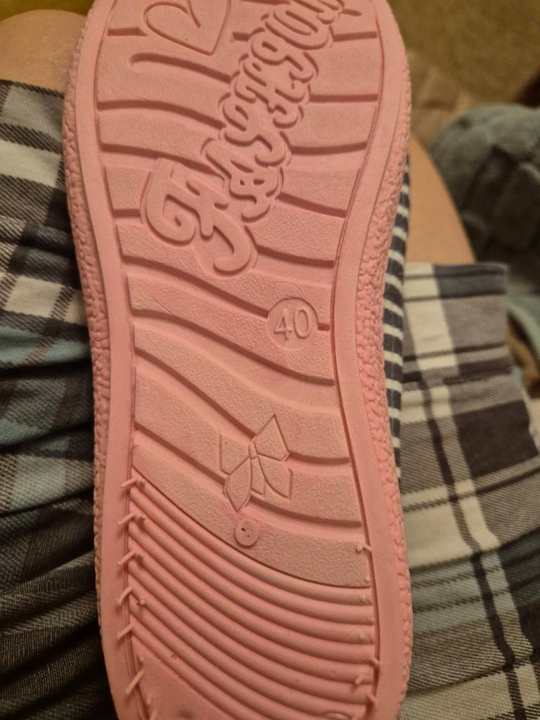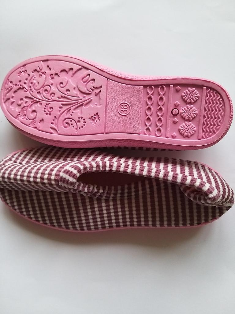 Thanks to! As in the photo, very bright pink sole. Nice slippers. Soft, not heavy. Comfortable. I took them for my mother for 25 cm, the toe rests, but for me for 24.5 they are great, my foot is narrow.