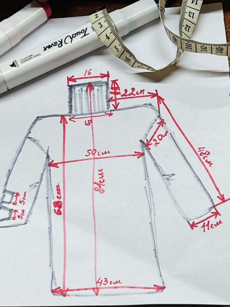 The neck is high. When turning up the neckline, the seams are on the front side.