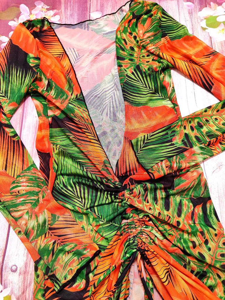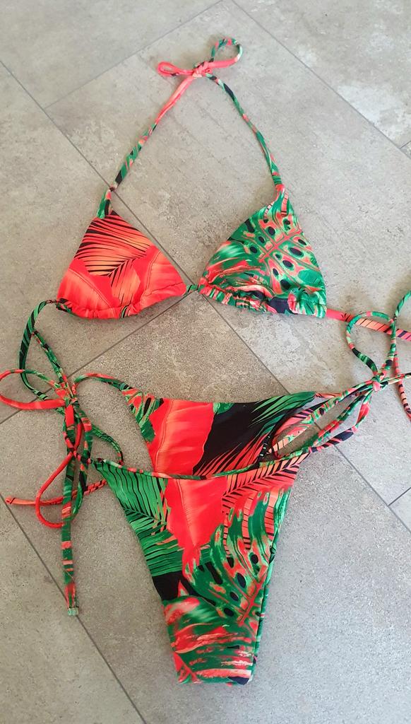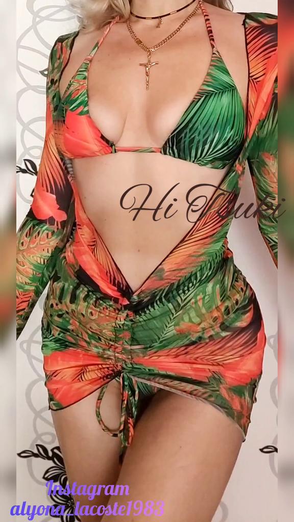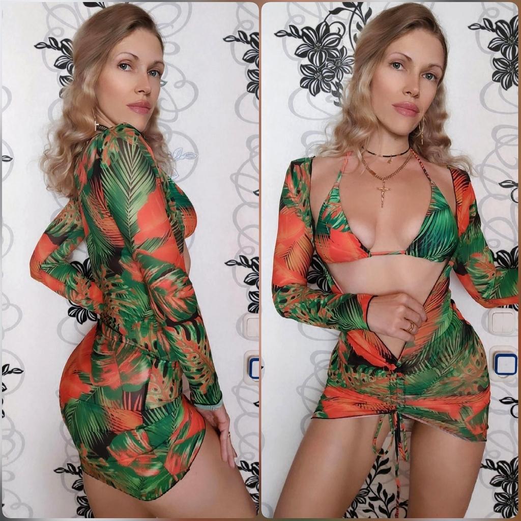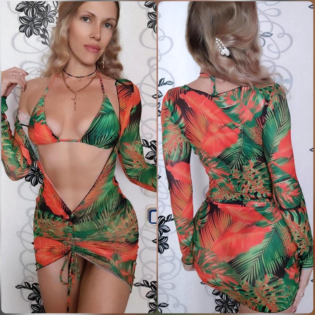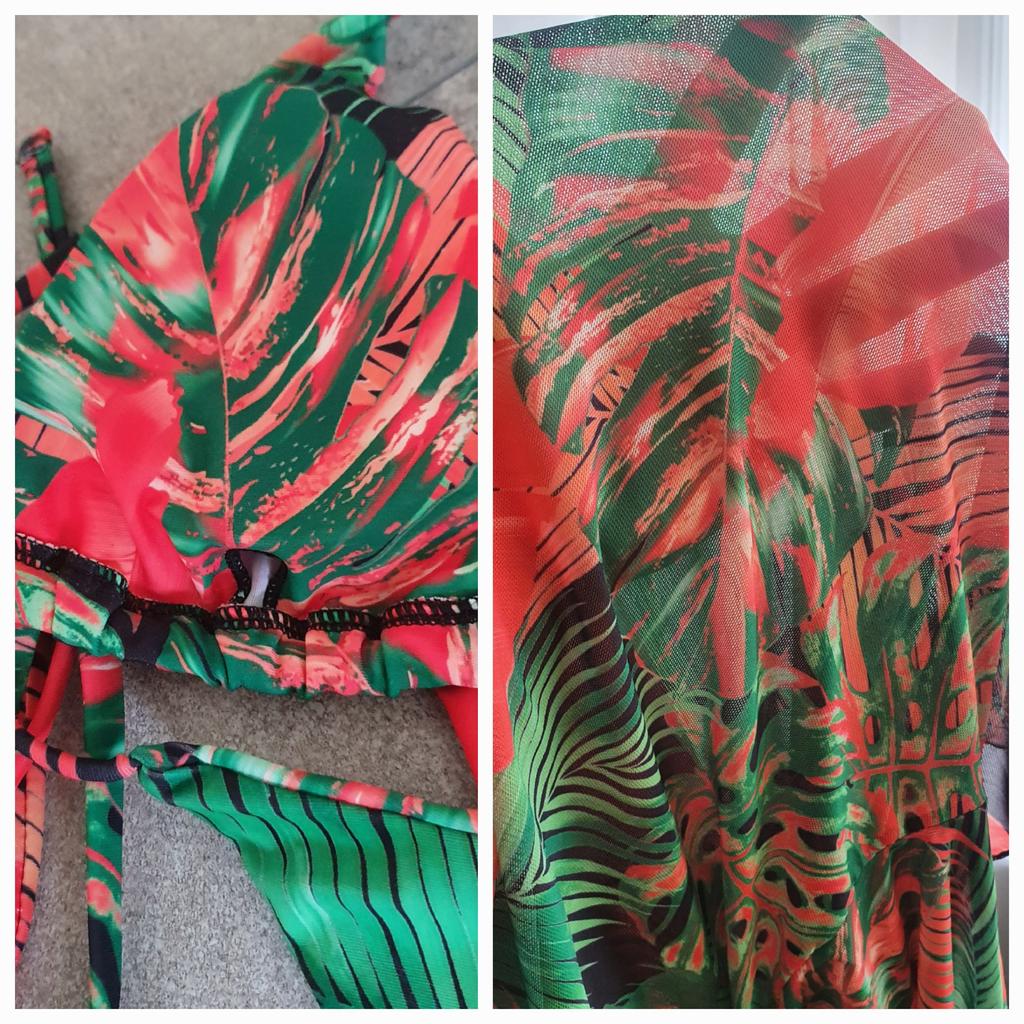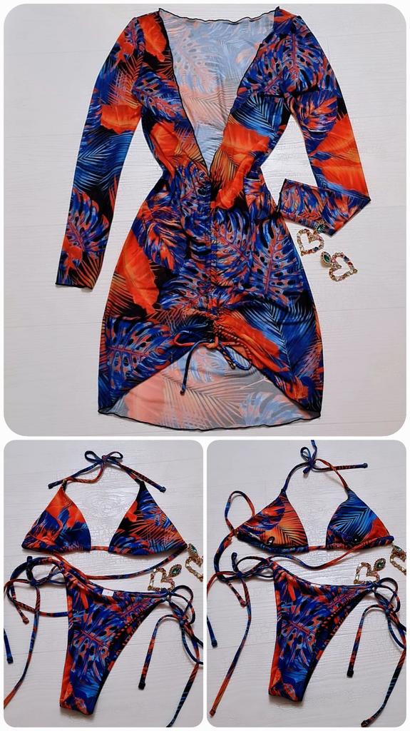 Women's Split Three Piece Set Printed Net Red Tie Dyed Lace Up Drawstring Swimsuit Bikini Sets