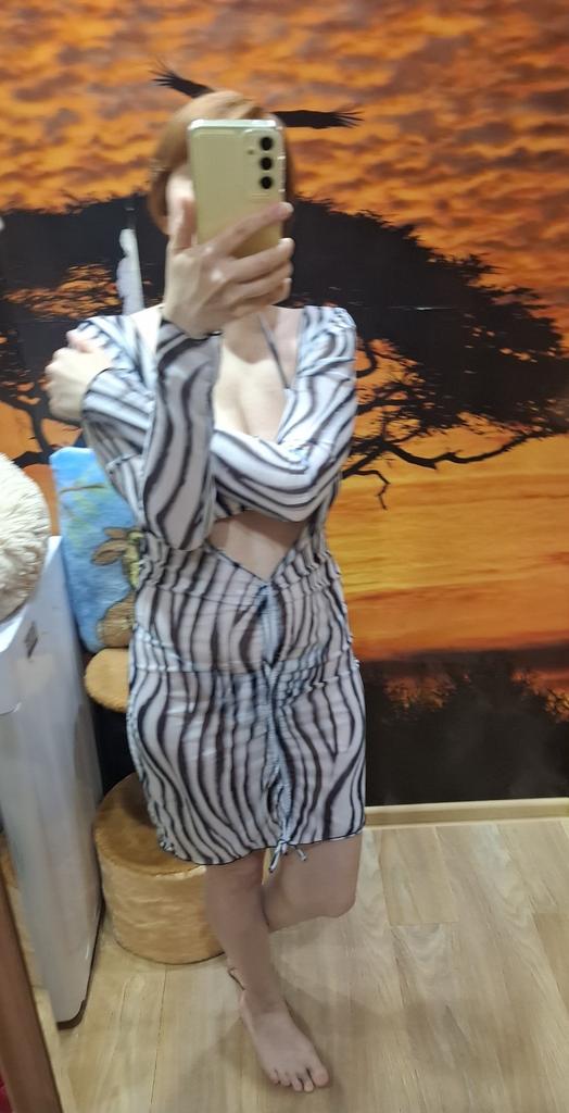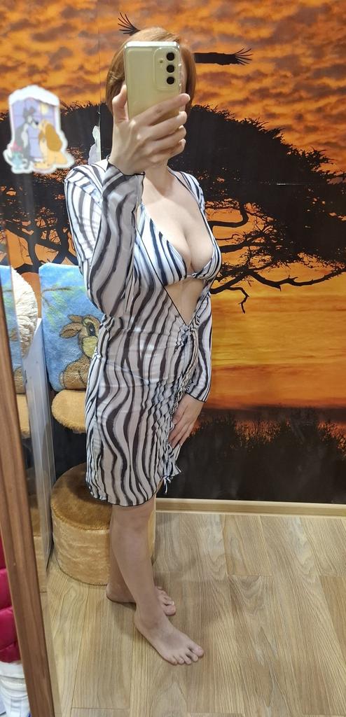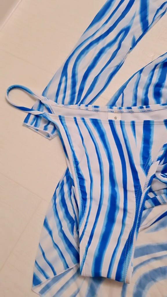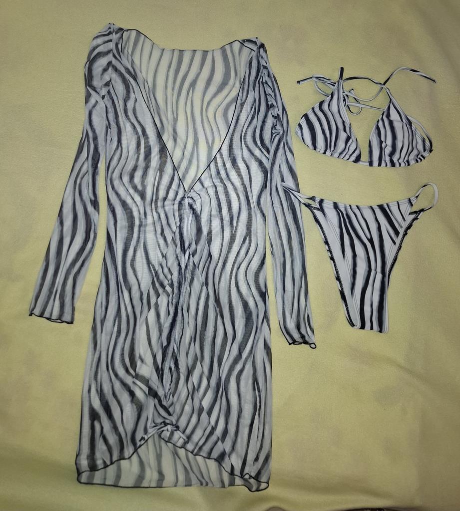 Swimsuit with dress ● For my parameters 84-60-85, height 167 cm, I took size S - it fits perfectly. ●top: - cups can be removed; - you can tie the top like you want; ●Bottom: - V-shaped form, opened on the sides; ●Dress: -transparent; -long sleeves; - the size is regulated by a lace; The swimsuit is perfect for a beautiful tan and for chic photo shoots on the beach. Recommend.