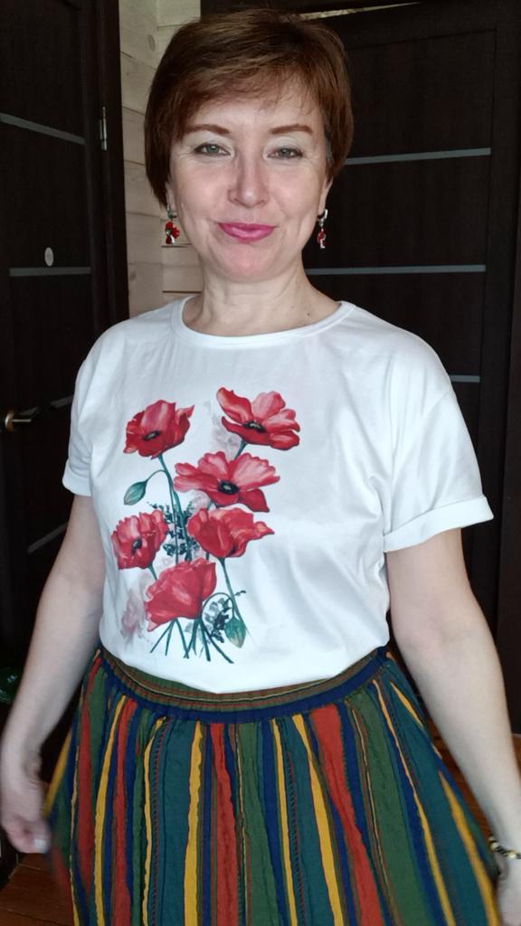 Bright! Cool! XXL fits my 80 cm waist perfectly. The skirt is slightly flared. Natural material with a white petticoat. I will wear it with pleasure in the summer! I recommend it!