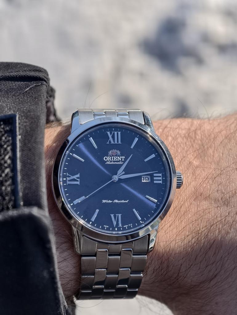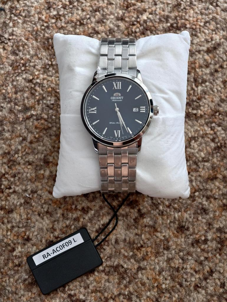 The Orient Contemporary Blue Dial Stainless Steel Automatic RA-AC0F09L10B is a refined dress watch designed for those who appreciate simplicity and reliability. Its minimalist blue dial offers clear, easy-to-read time at a glance, complemented by a sleek and slim profile that fits comfortably on the wrist. Powered by the robust F6722 automatic movement with 22 jewels, this watch ensures accurate and dependable timekeeping. The stainless steel case and bracelet provide durability and a polished, classic look, while the sapphire crystal adds excellent scratch resistance. Additional features include a power reserve indicator, date display, pull/push crown, and a see-through case back that reveals the intricate movement inside. The deployment clasp offers secure wear, and the watch is water-resistant up to 50 meters, making it suitable for everyday use. With a case diameter of 42mm and a thickness of 12mm, this timepiece strikes a perfect balance between elegance and functionality at an exceptional value.
