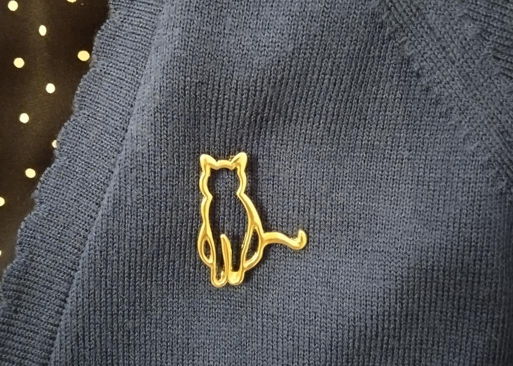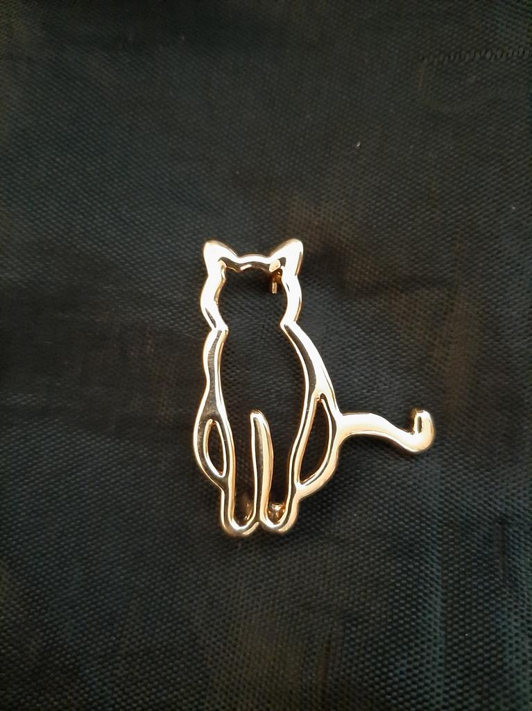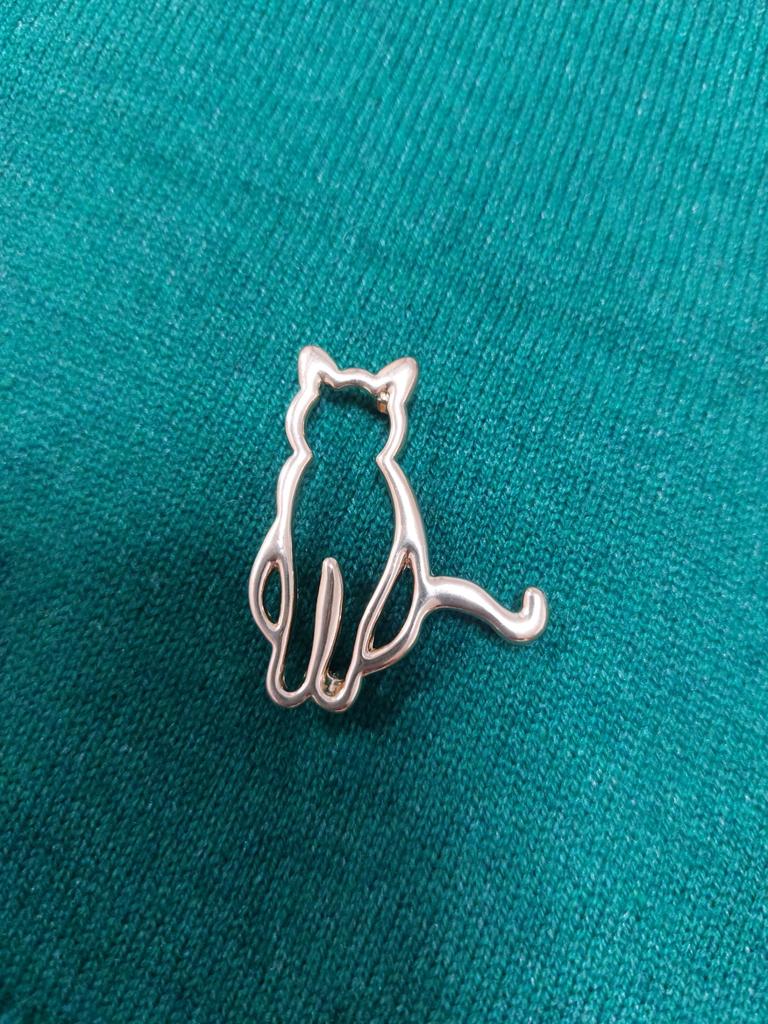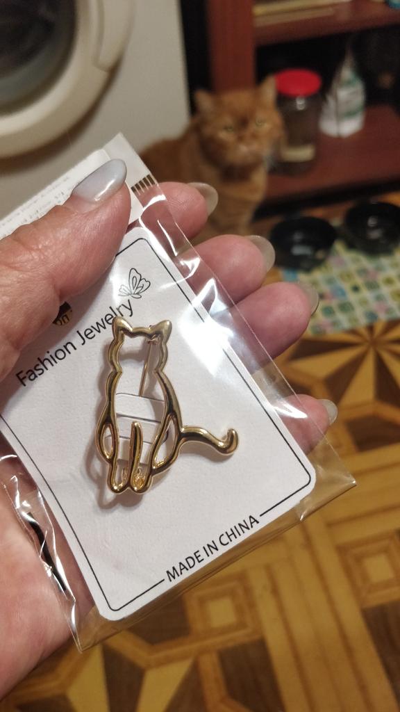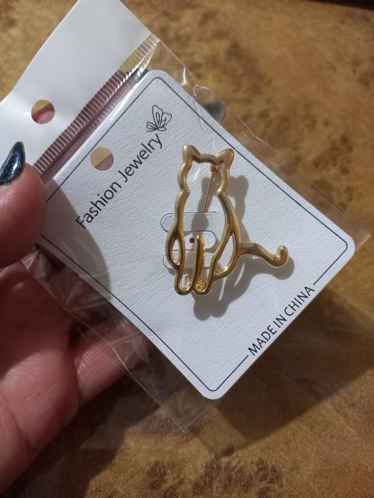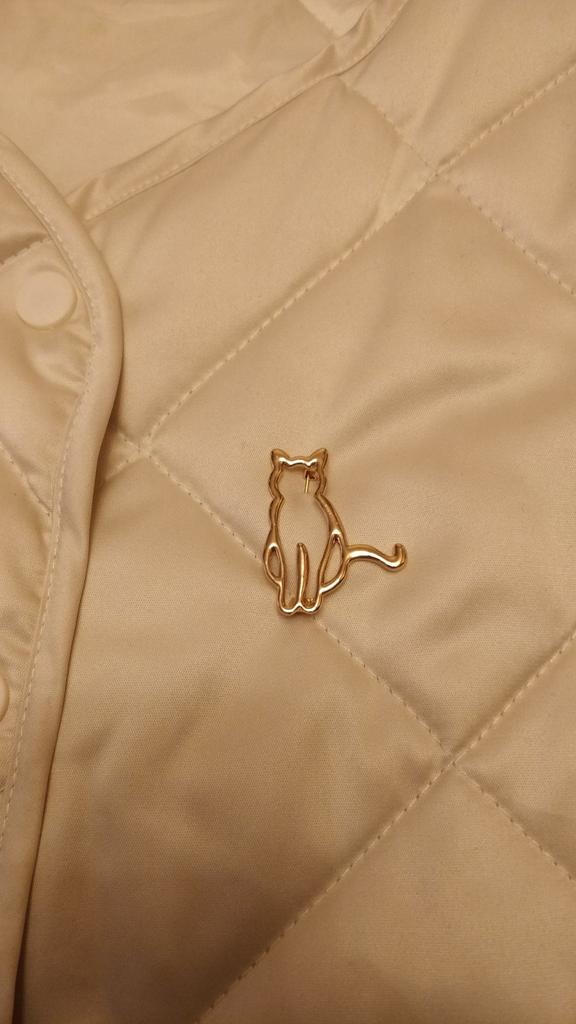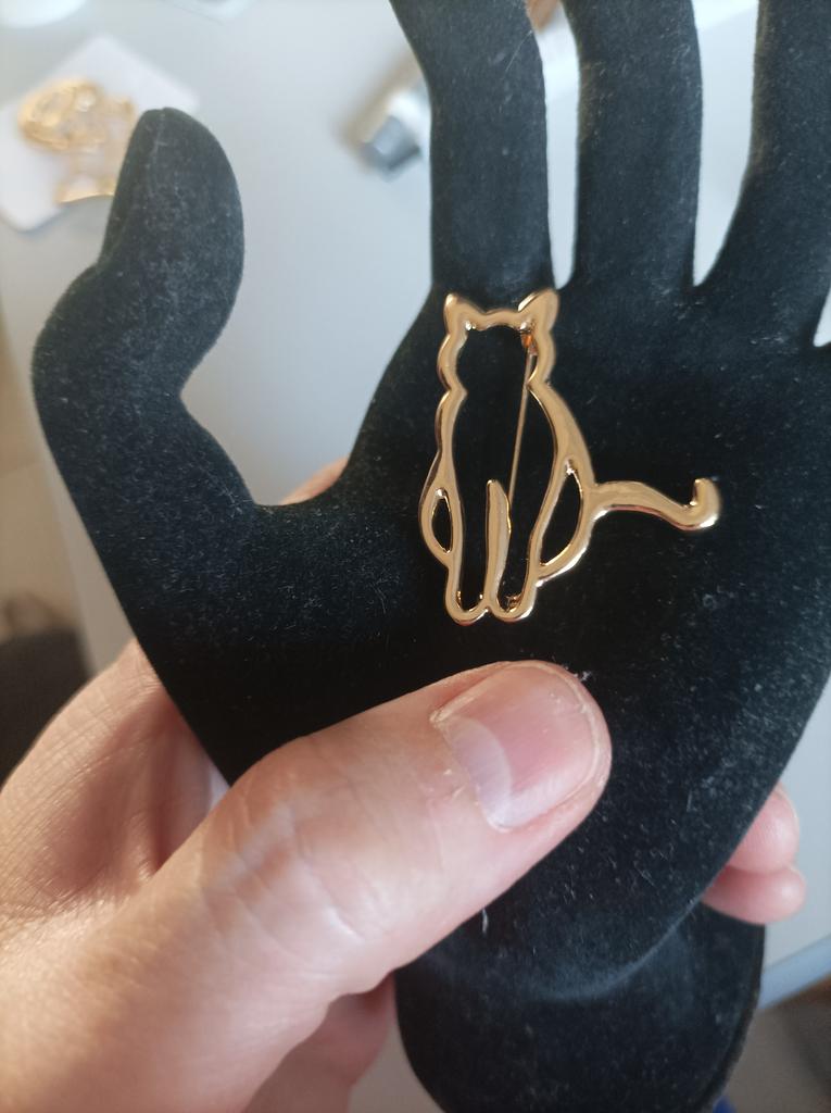 A beautiful cat, although it looks a little simple compared to many other brooches and not very fancy, but it looks like a gold brooch, so in addition to a beautiful cute cat that will look great on clothes, it will not feel like cheap jewelry. The brooch fits clothes made of coarser material, it will sag on thin ones.