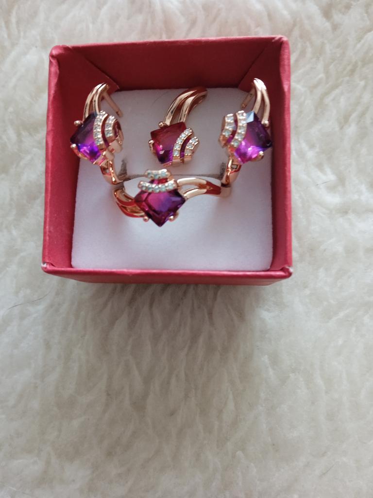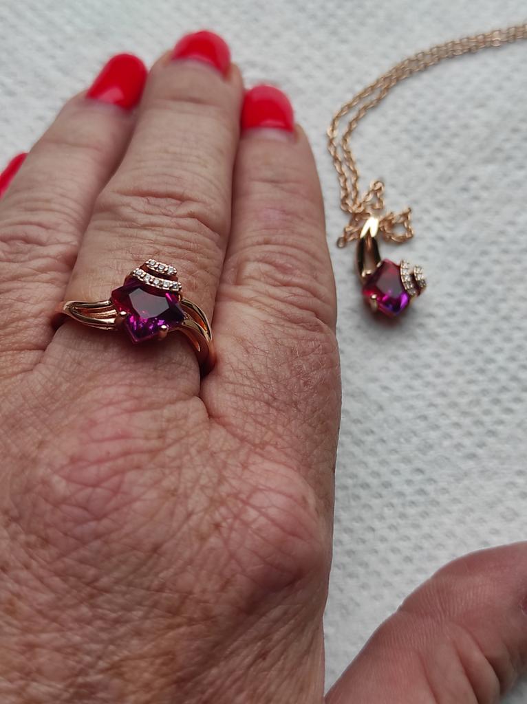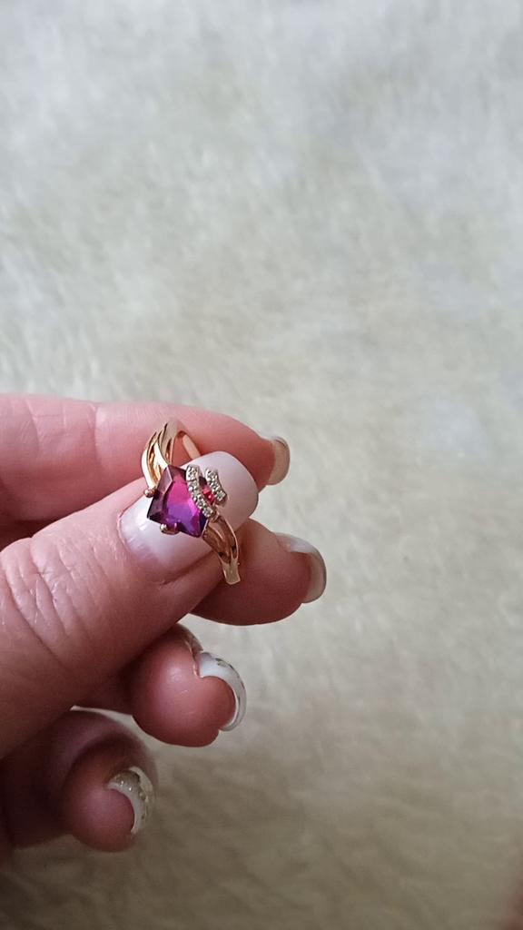 A chic ring from a trusted Kinel store 👌🔥 Material: copper, faux cubic zirconia, rose gold plating ☝️💥 Ring with a bright pink stone and sparkling rhinestones 👍💥 Size 8☝️ The ring is very beautiful, spectacular, elegant 👌🔥 Lightweight, comfortable on the finger The quality is excellent 👍💯, no defects . I recommend for purchase.