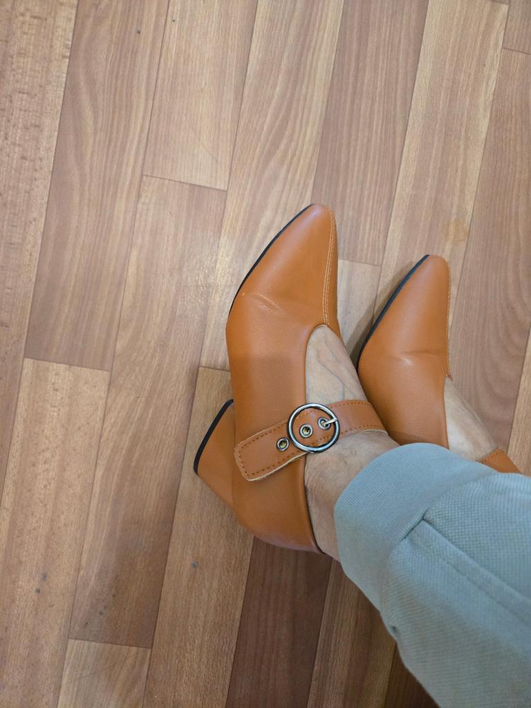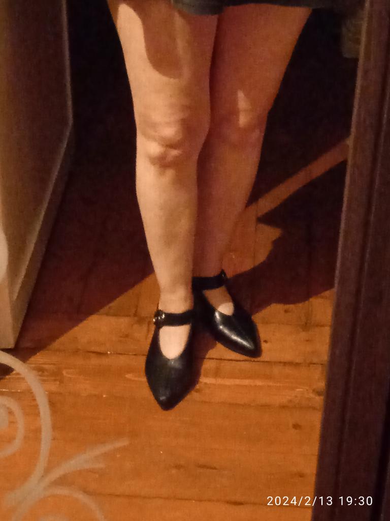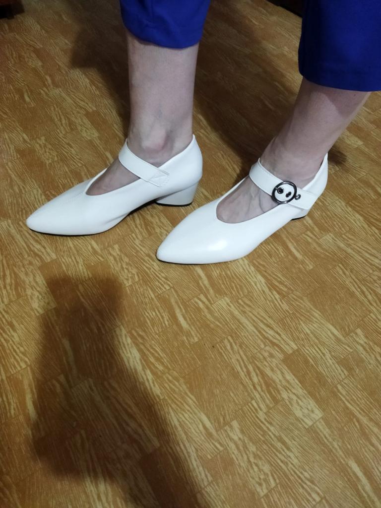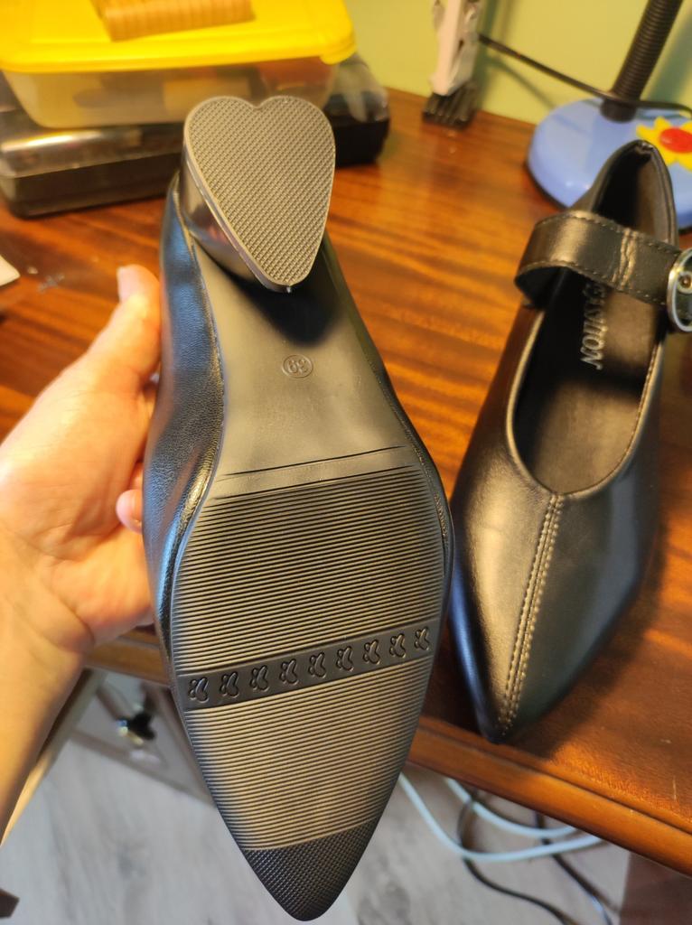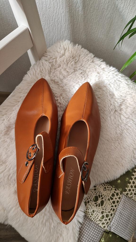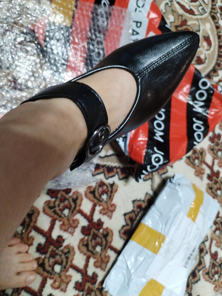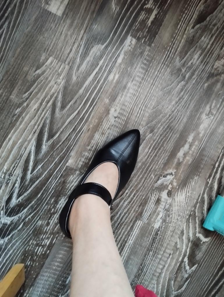 The shoes are successful, size 43 fit 40 (loose fit). Soft, comfortable. But - the strap with the buckle is short. It is designed for a foot with a very low instep. The pointed toe starts to be felt by the evening when worn. Conclusion: the shoes are for a narrow foot with a low instep, the feet should not be prone to swelling. The straps had to be cut off, they did not fit a high instep. The heel is comfortable. A pleasant bonus was the socks. Thank you!