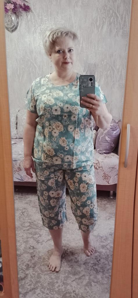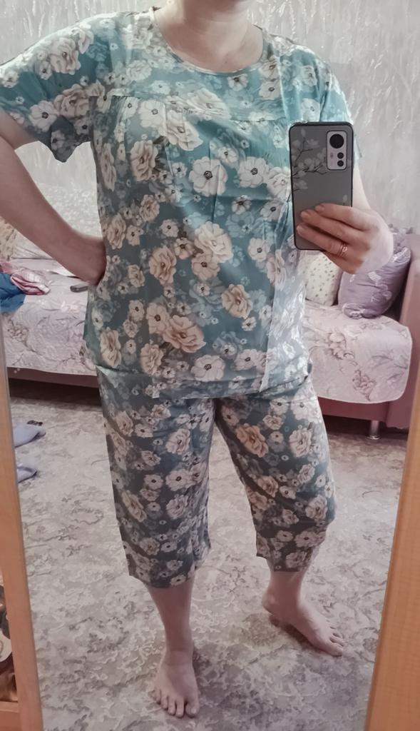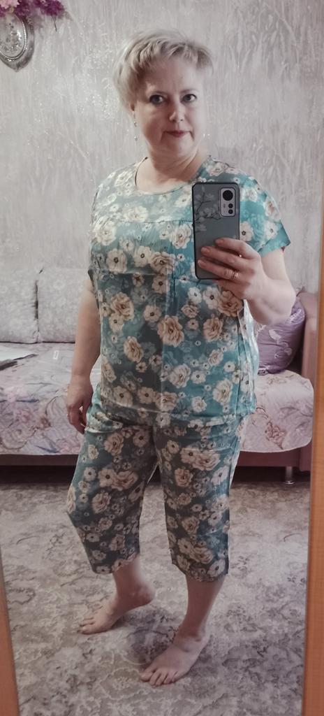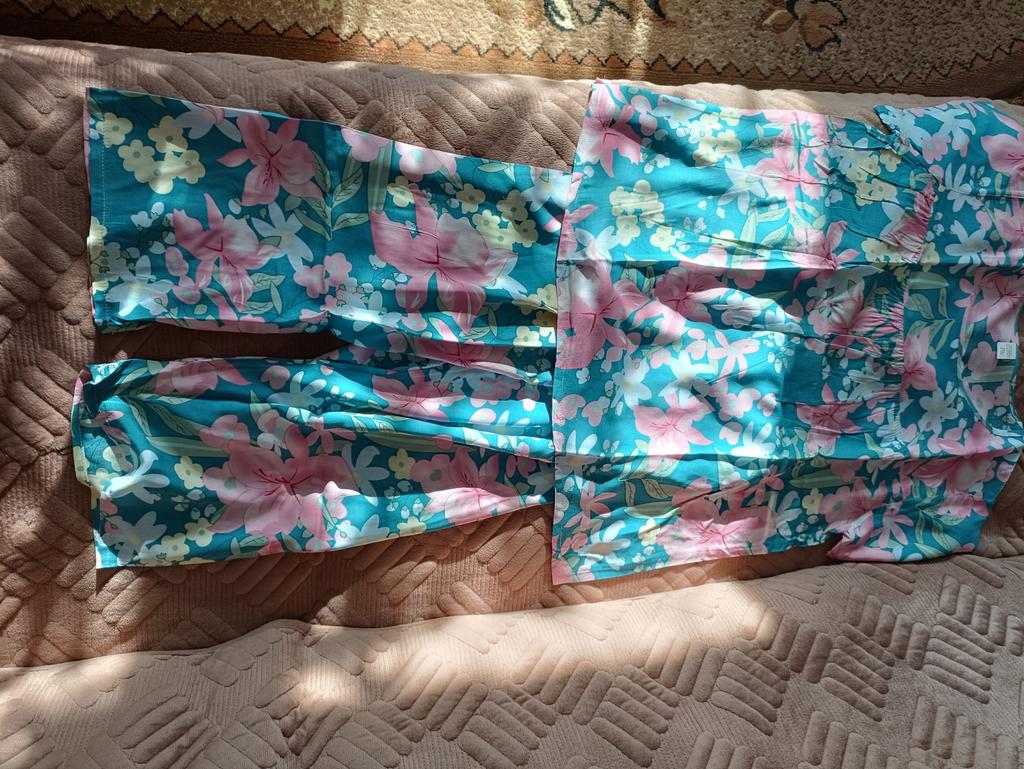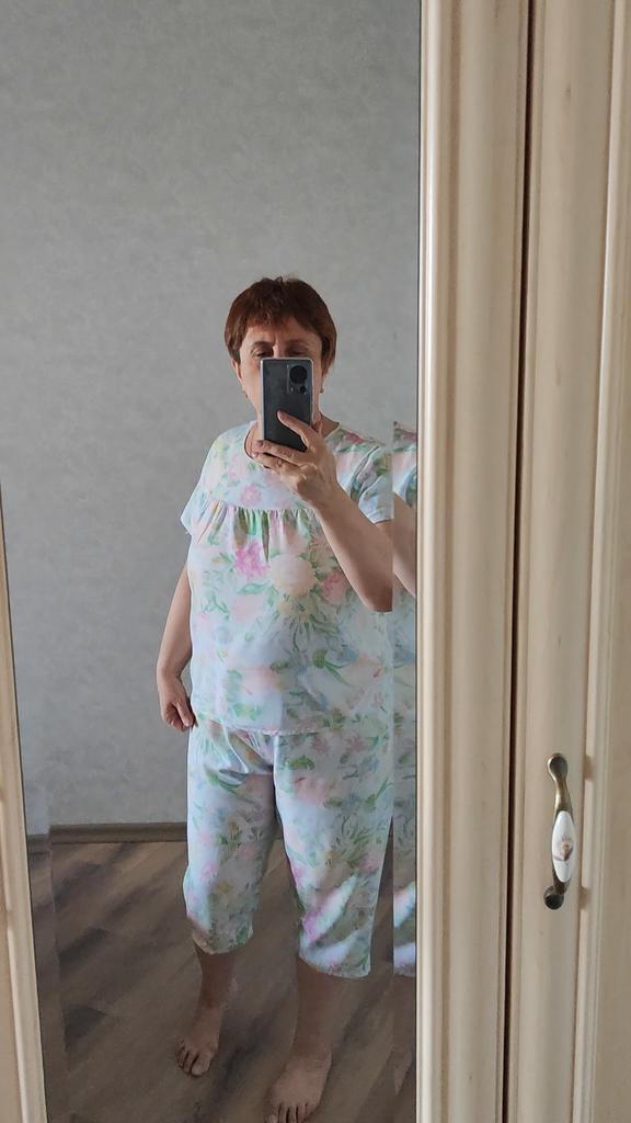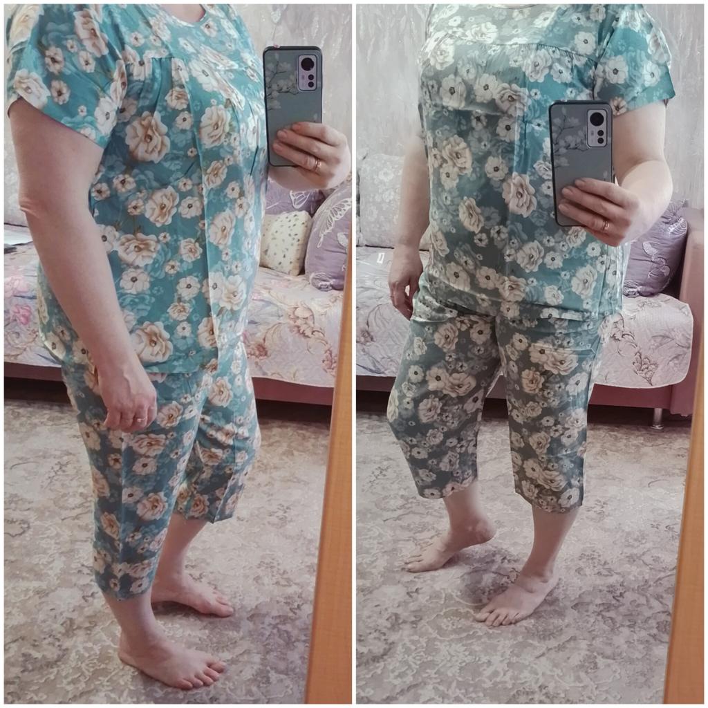 Perfect for summer pajamas - thin, very light and pleasant material! Size XXXXL blouse for European No. 44 is good, but the top of the pants is too short - you probably need to find a suitable piece of fabric and sew it longer.