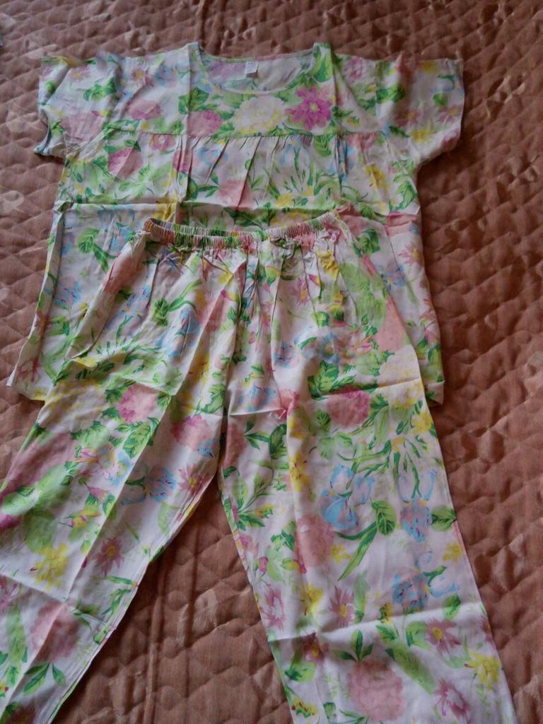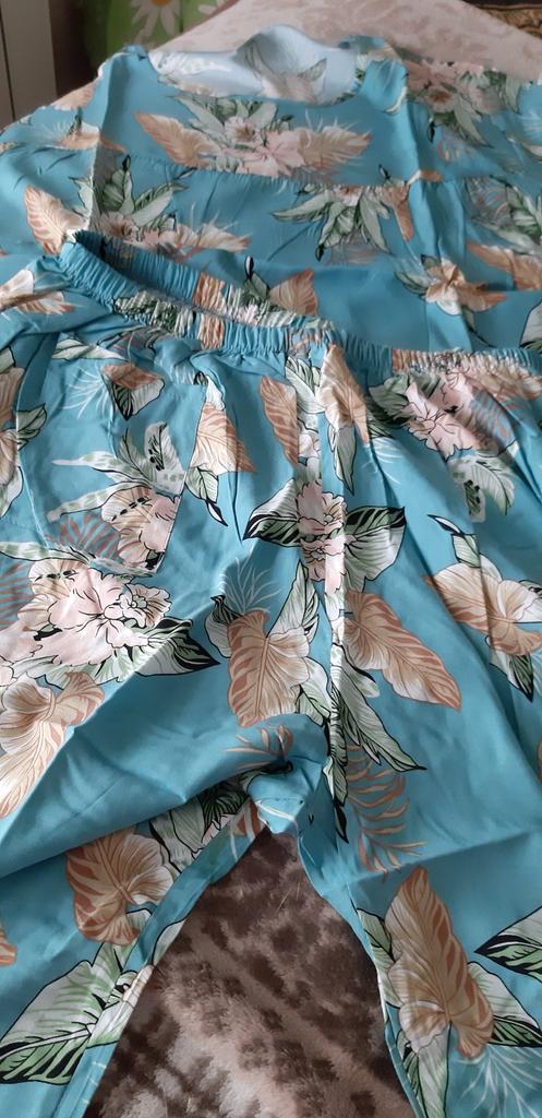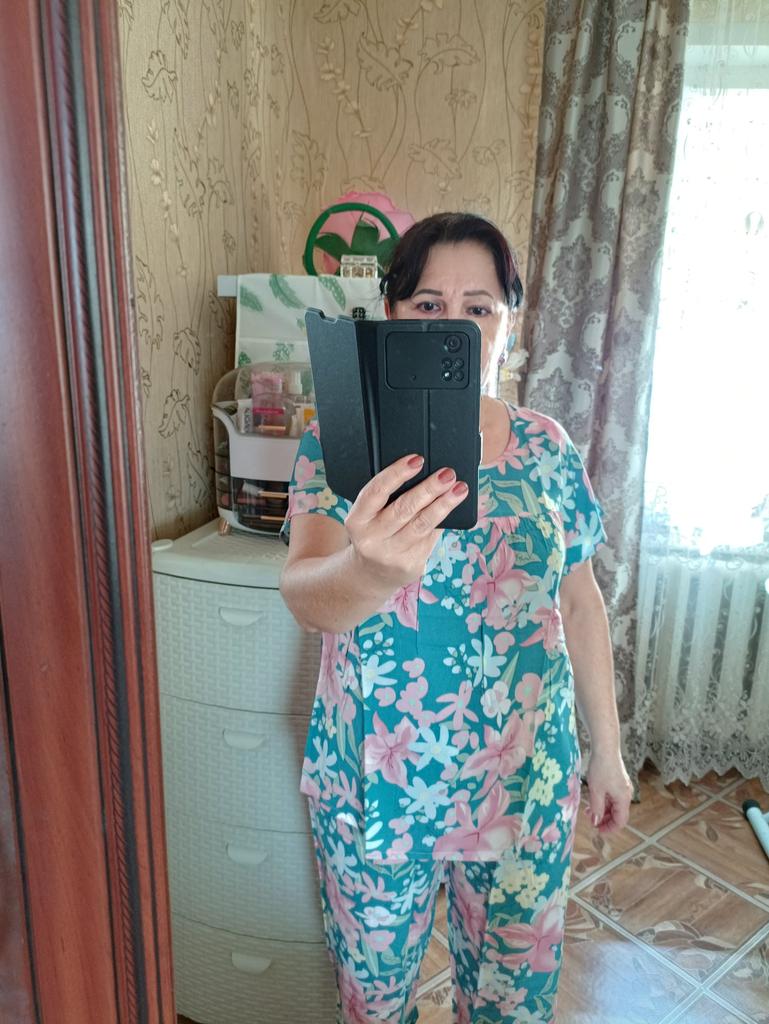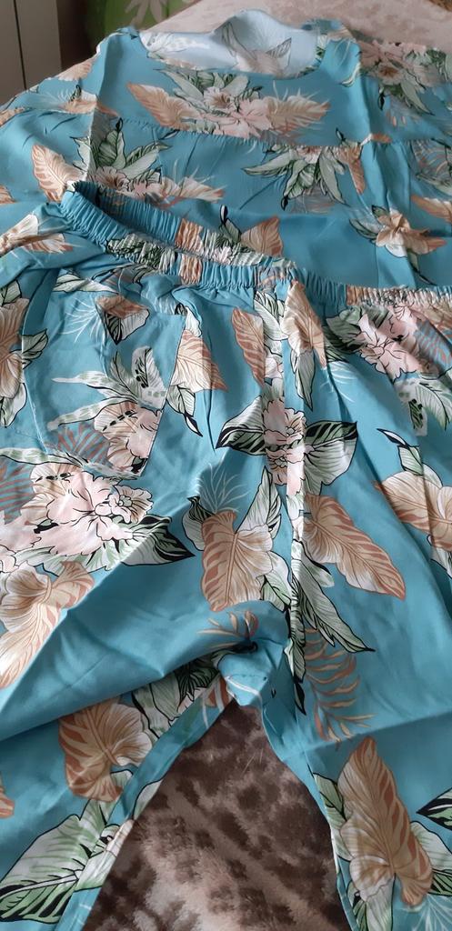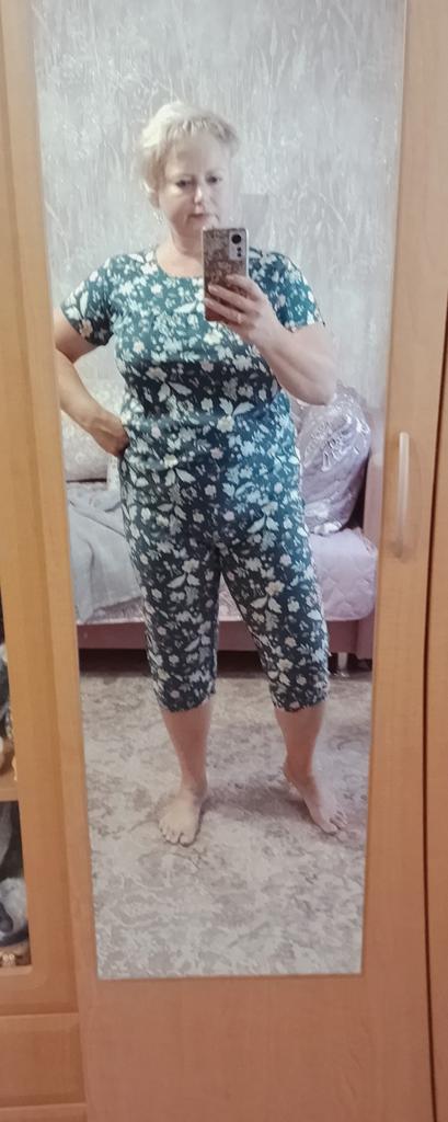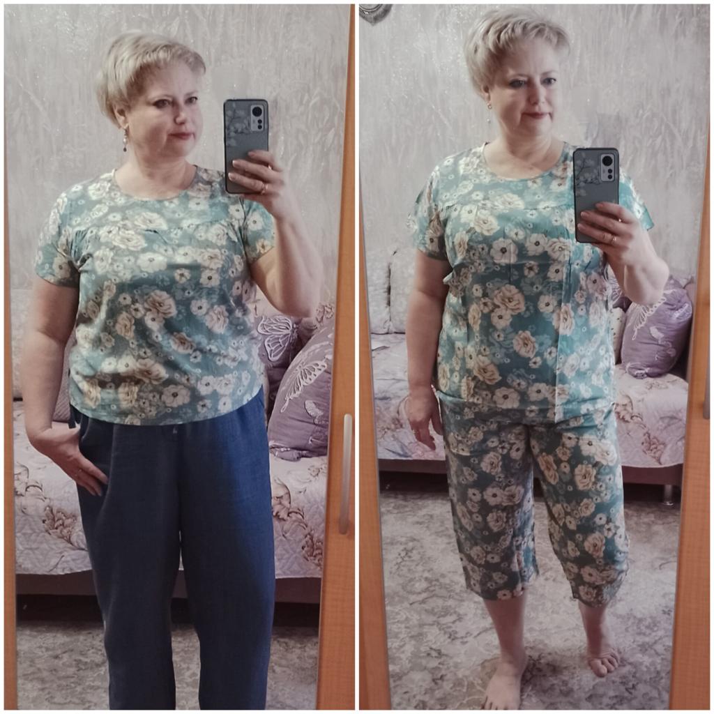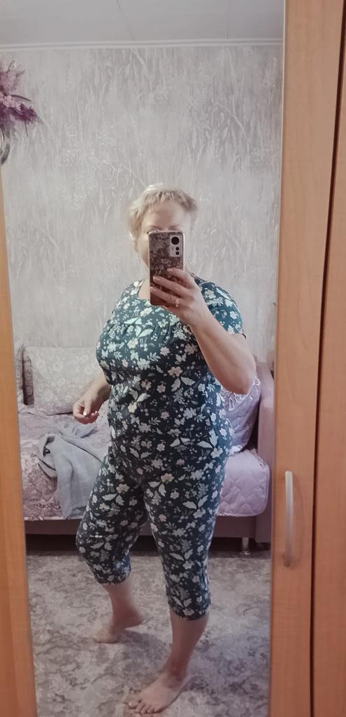 Perfect for summer pajamas - thin, very light and pleasant material! Size XXXXL blouse for European No. 44 is good, but the top of the pants is too short - you probably need to find a suitable piece of fabric and sew it longer.